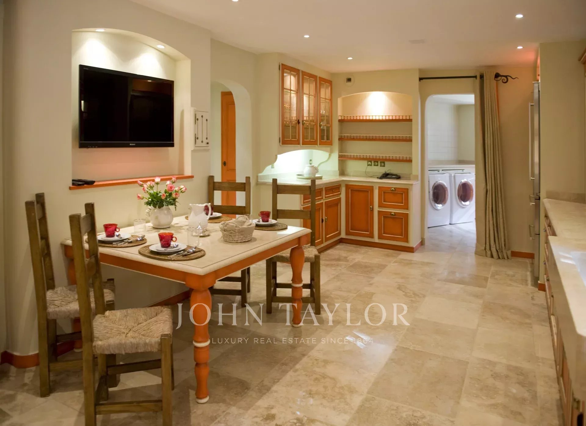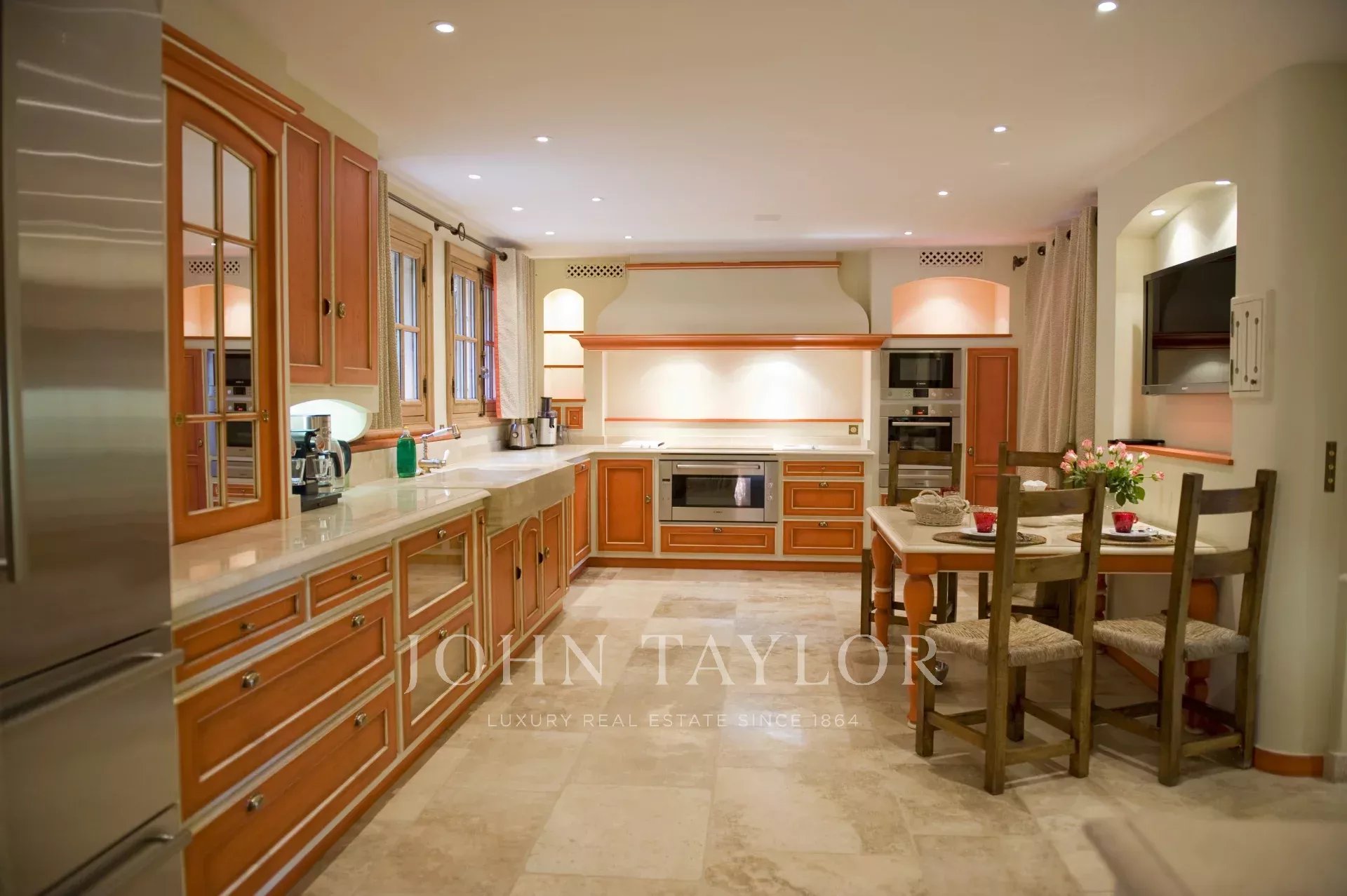 Cozinha independente, totalmente equipada (TV) com espaço para refeições. A cozinha abre-se para um terraço transformado em sala de jantar de verão com barbecue e cozinha de verão, virado para a piscina com vista para o maciço de Estérel.