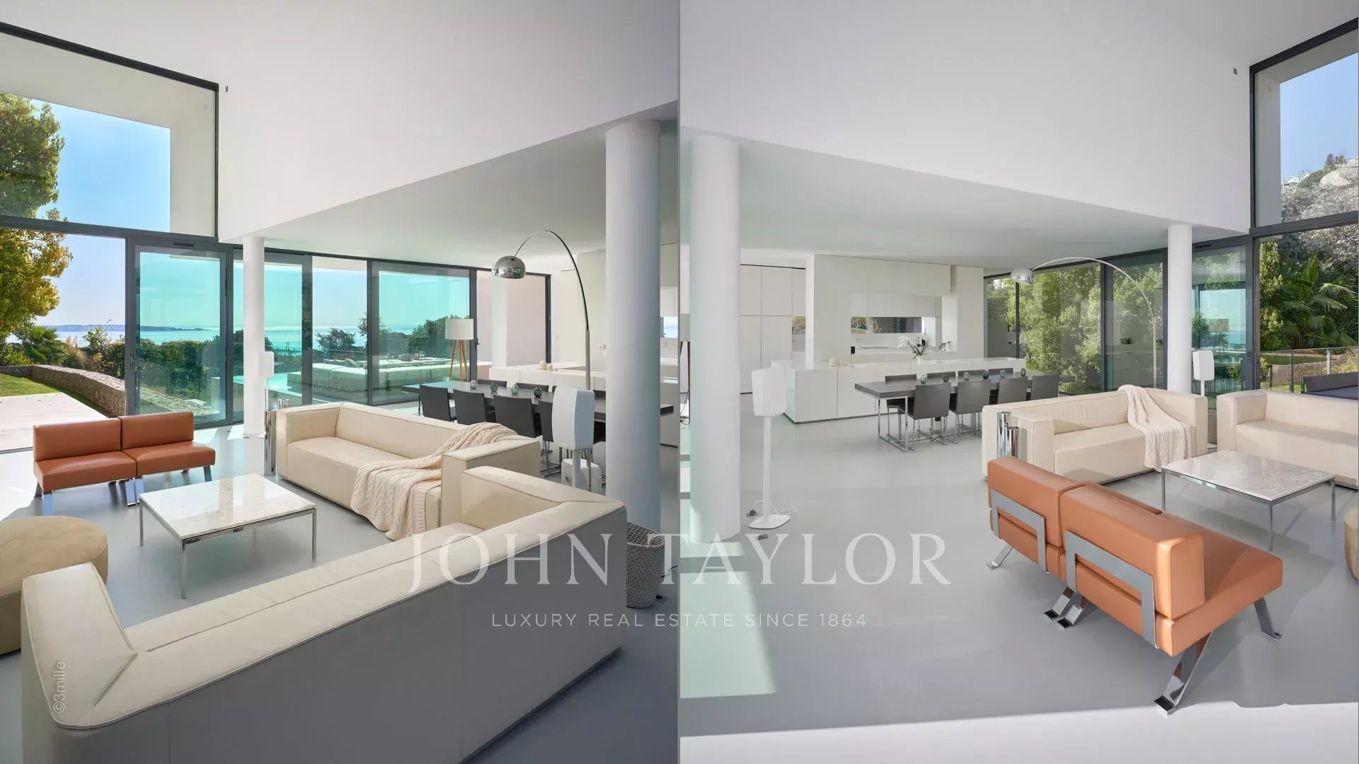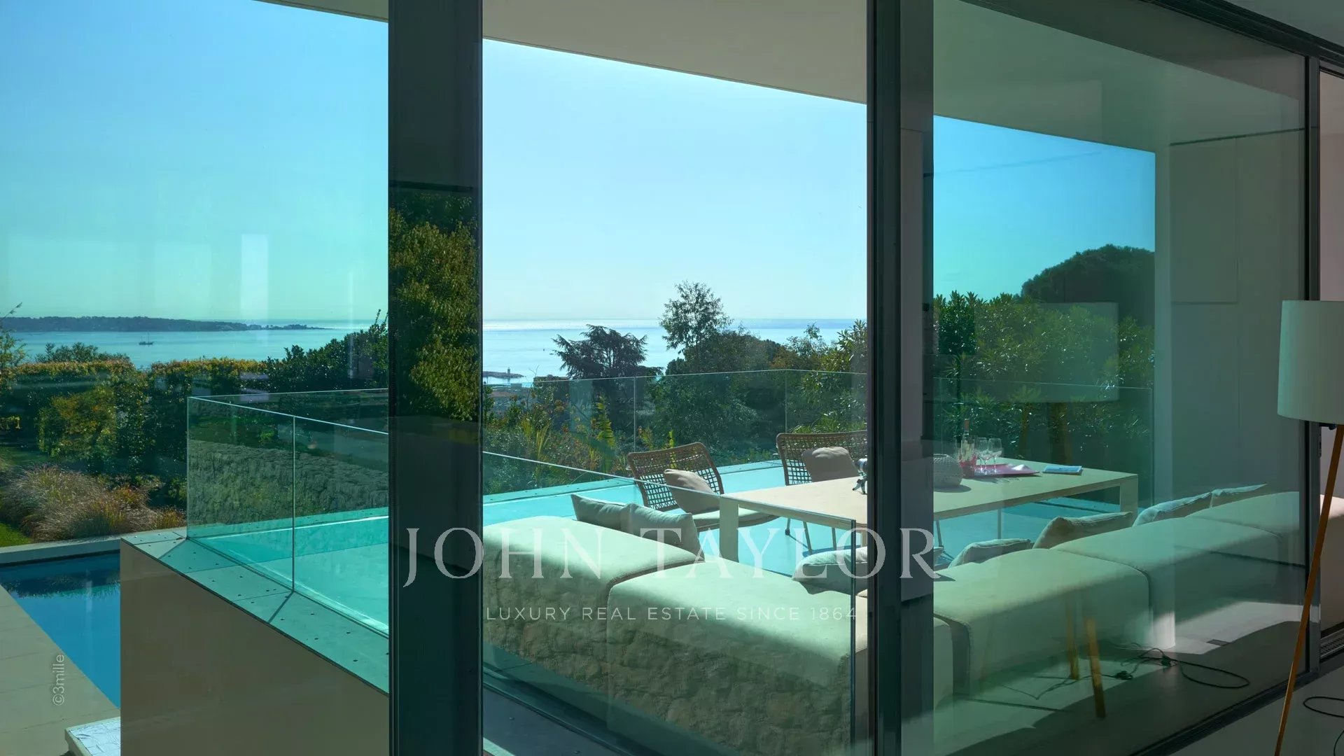 Nas alturas do Golfe-Juan e totalmente climatizada, esta bela propriedade de arquitetura moderna construída em 2 andares é composta da seguinte forma: