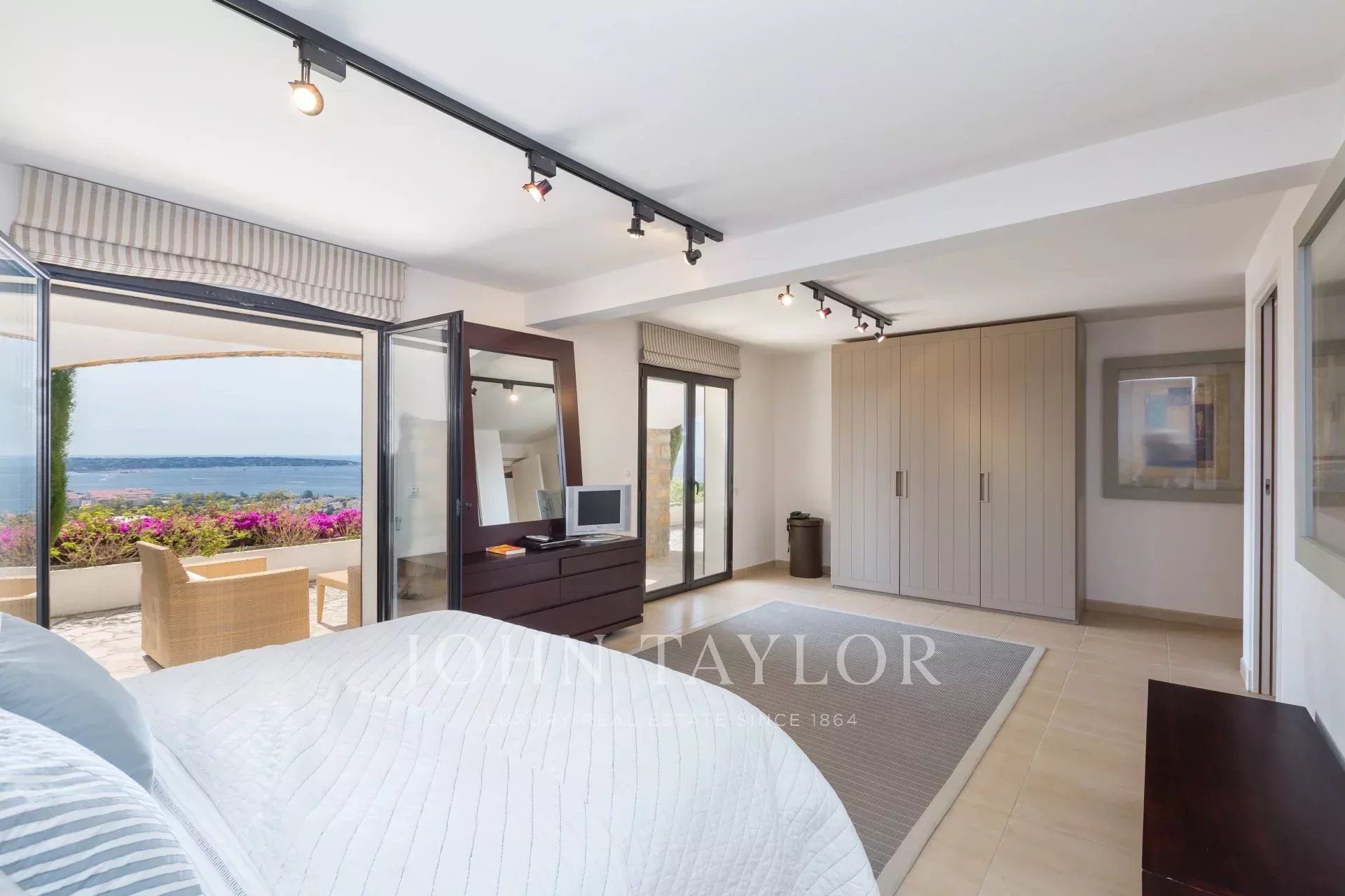 Nas alturas do Golfe-Juan, no coração de um jardim paisagístico com cerca de 3.000 m², esta magnífica moradia apresenta caraterísticas contemporâneas de alta qualidade e uma vista panorâmica excecional sobre o mar até ao Cap d'Antibes.