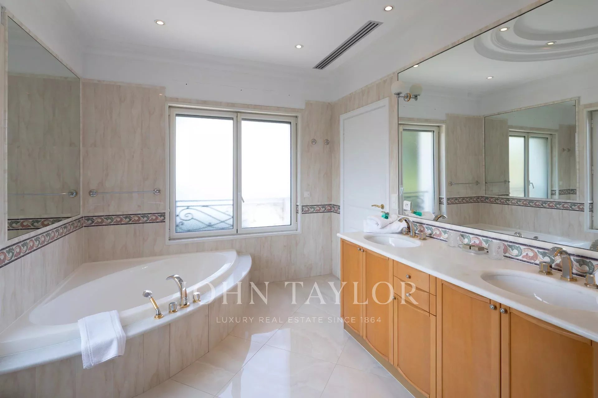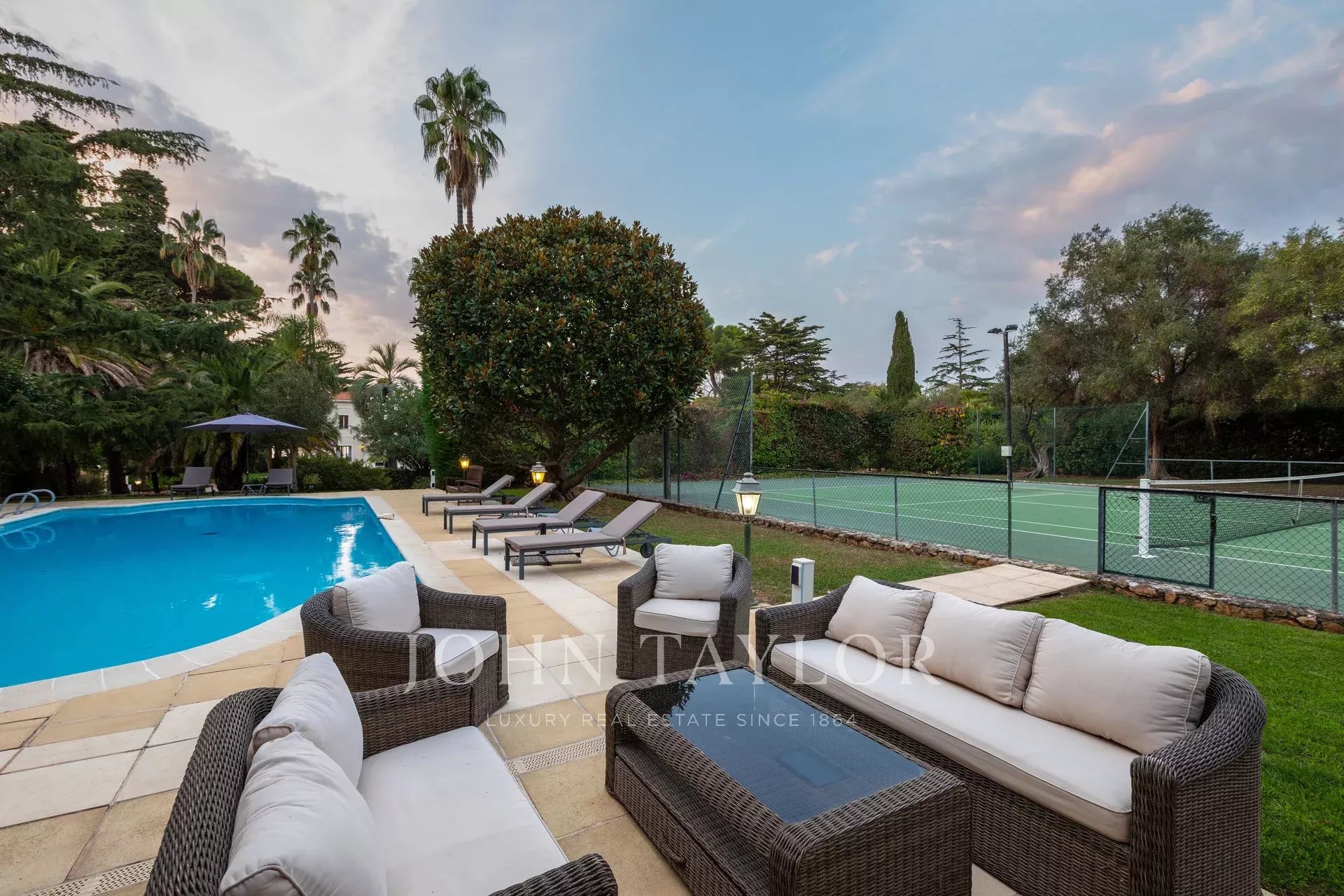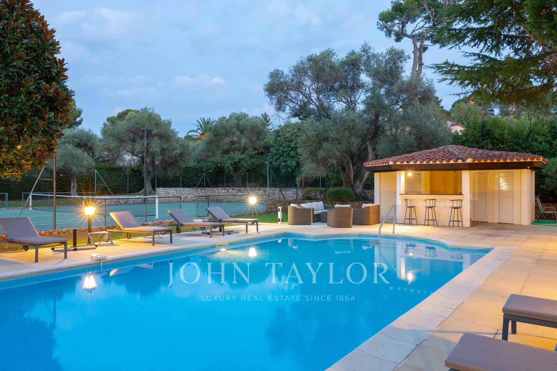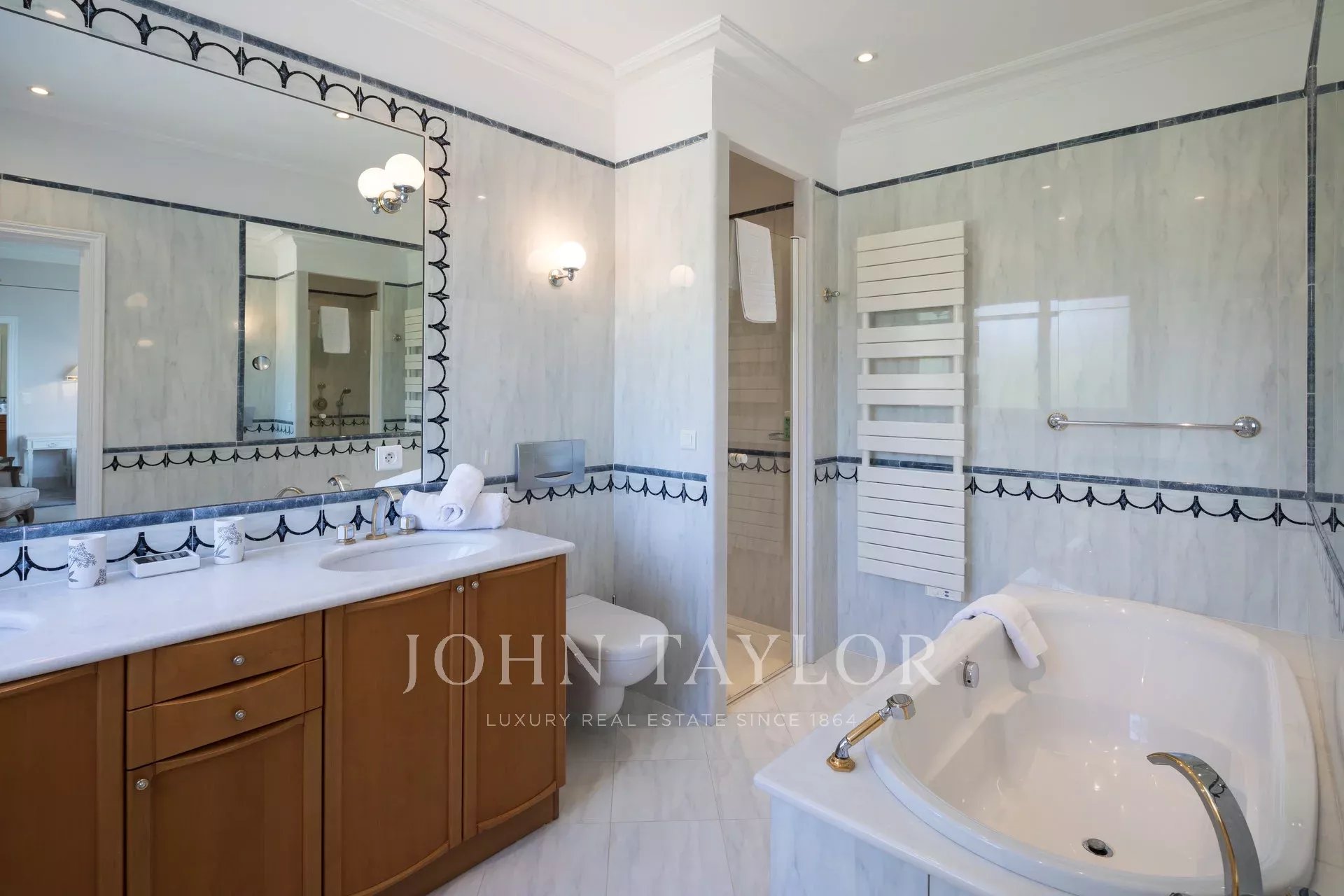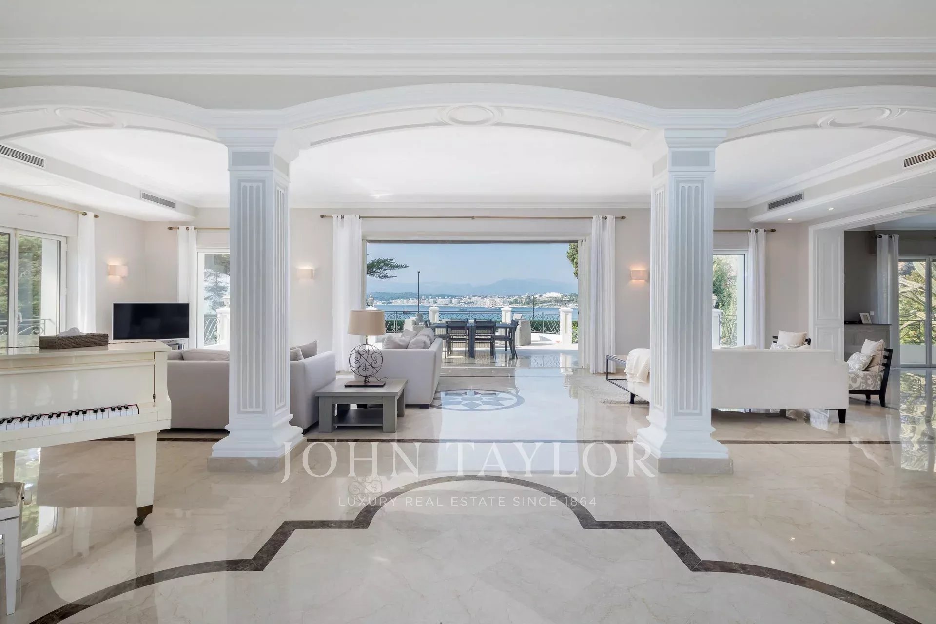 Esplêndida propriedade de 3 pisos na Boulevard du Littoral. Apenas a alguns minutos a pé do hotel Eden Roc, desfruta de belas vistas sobre a Baía de Juan Les Pins, as Ilhas Lérins e o Esterel. Totalmente renovada e com ar condicionado, está rodeada por 9.000 m2 de terrenos bem concebidos, com relvados, flores e belas árvores.