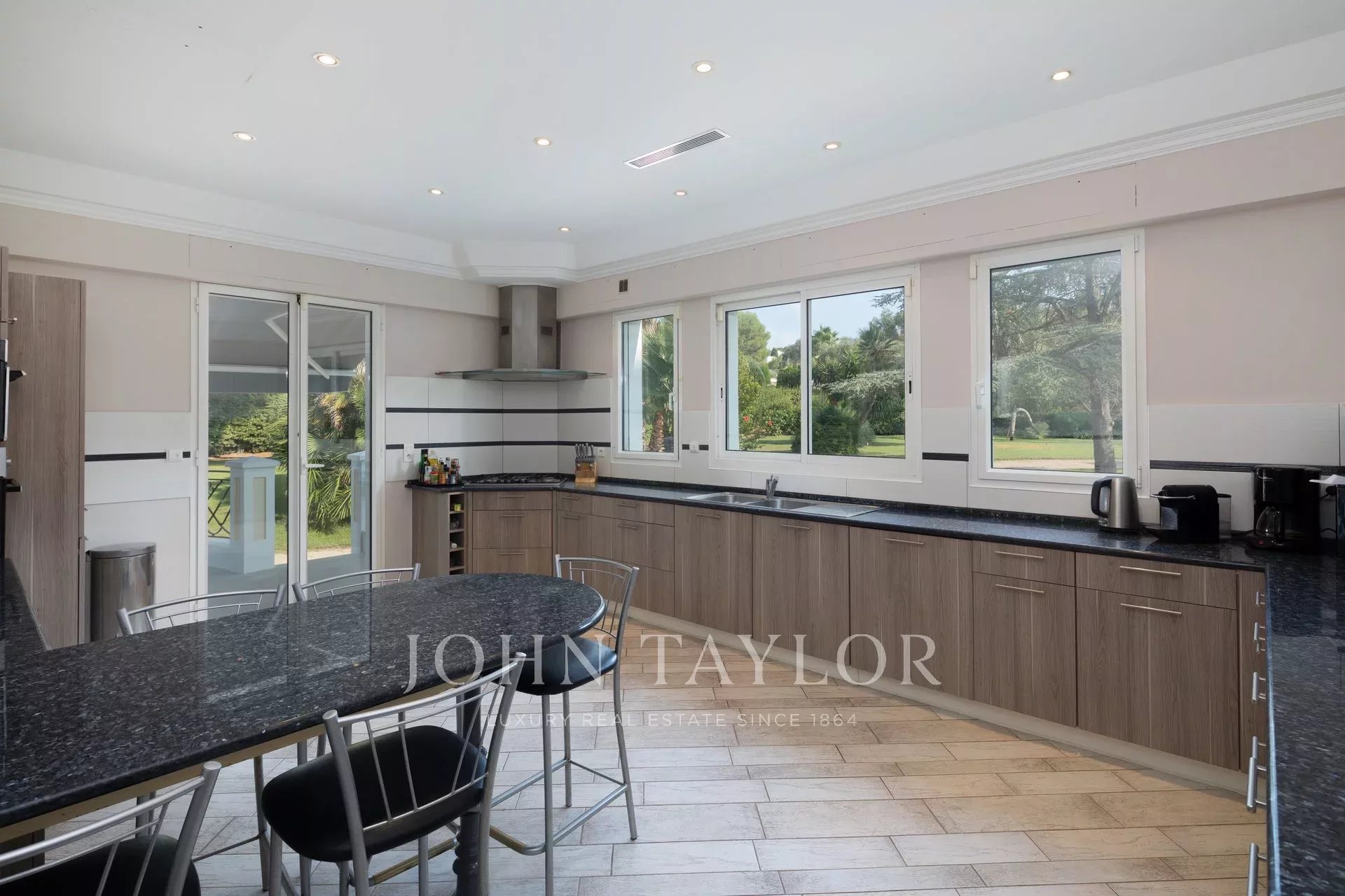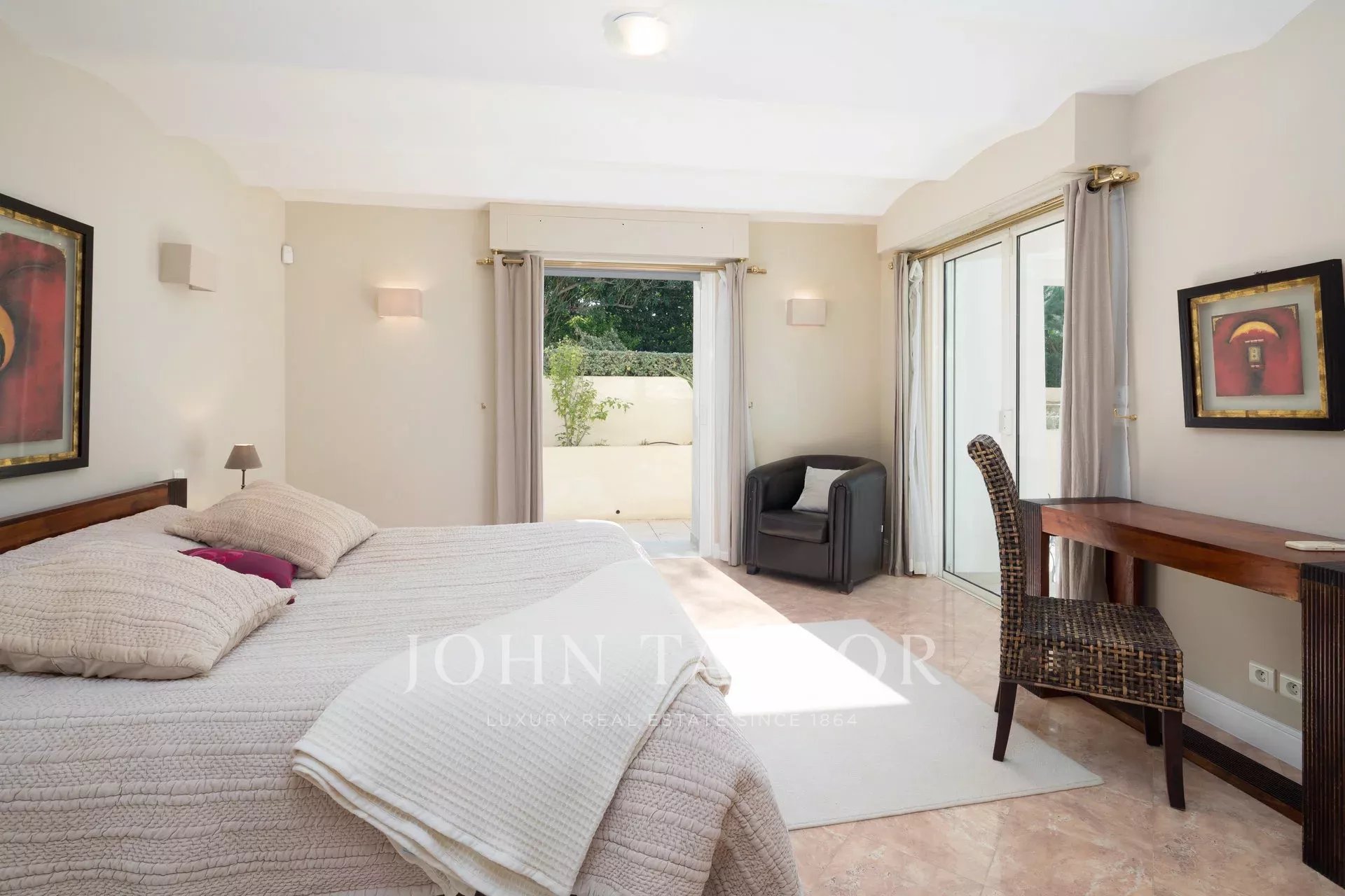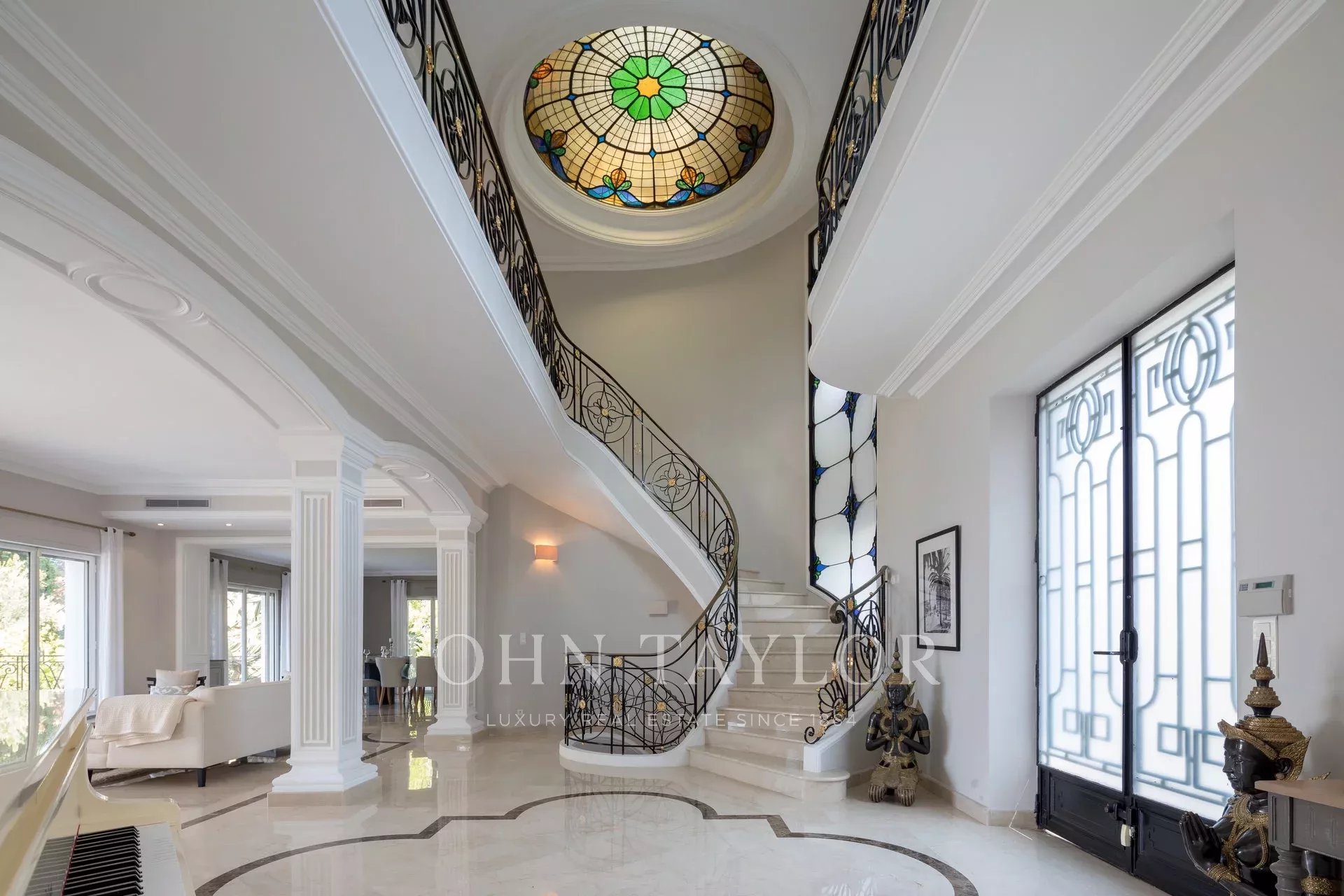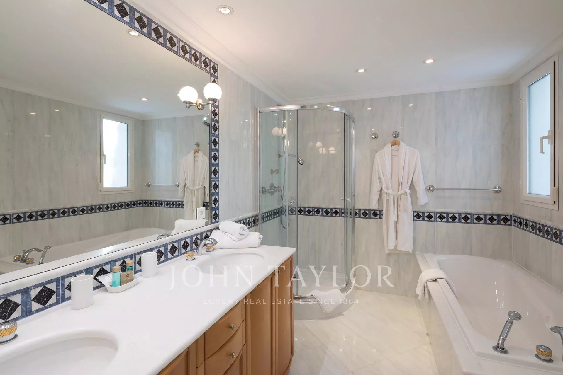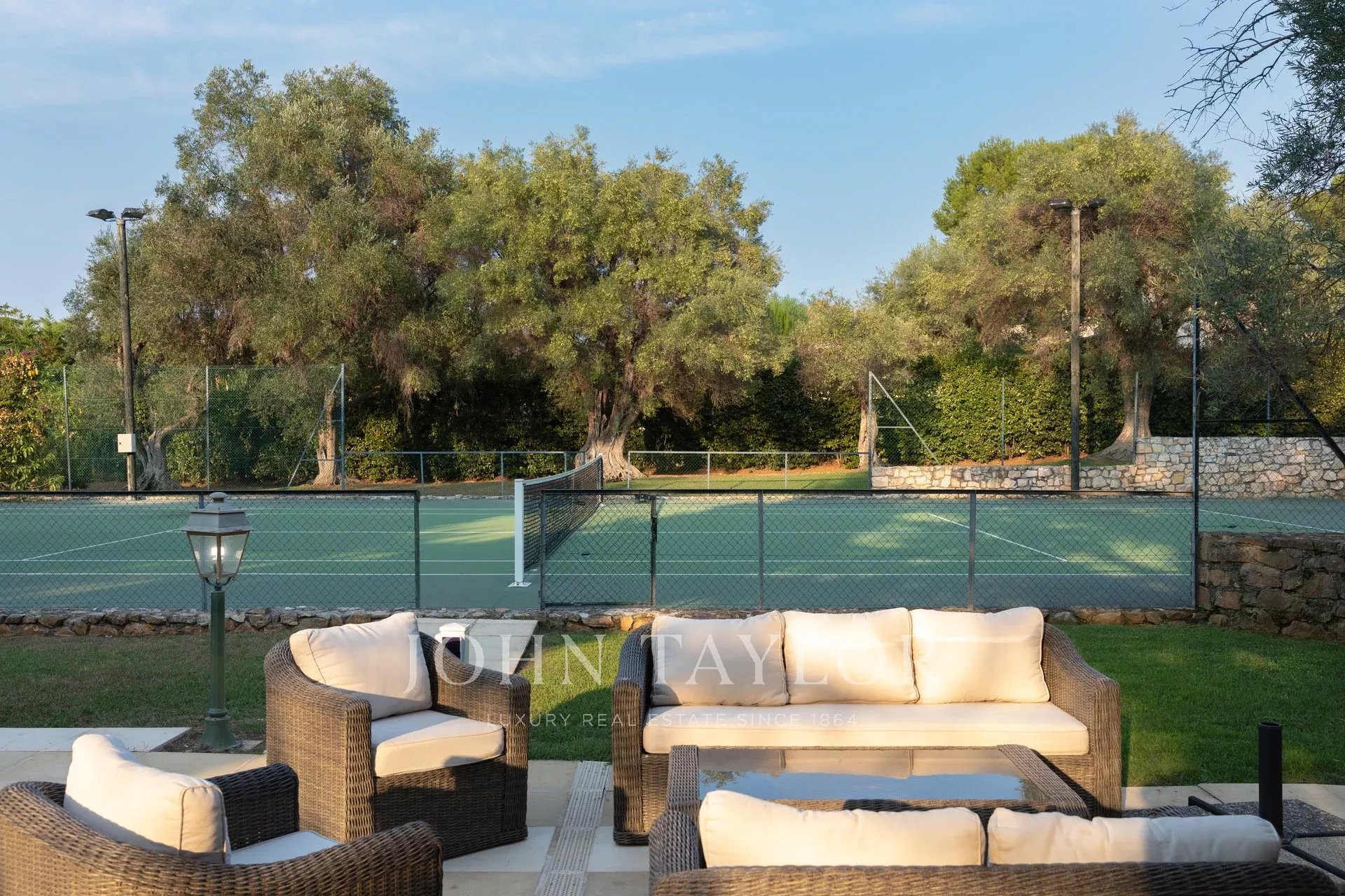 Esplêndida propriedade de 3 pisos na Boulevard du Littoral. Apenas a alguns minutos a pé do hotel Eden Roc, desfruta de belas vistas sobre a Baía de Juan Les Pins, as Ilhas Lérins e o Esterel. Totalmente renovada e com ar condicionado, está rodeada por 9.000 m2 de terrenos bem concebidos, com relvados, flores e belas árvores.