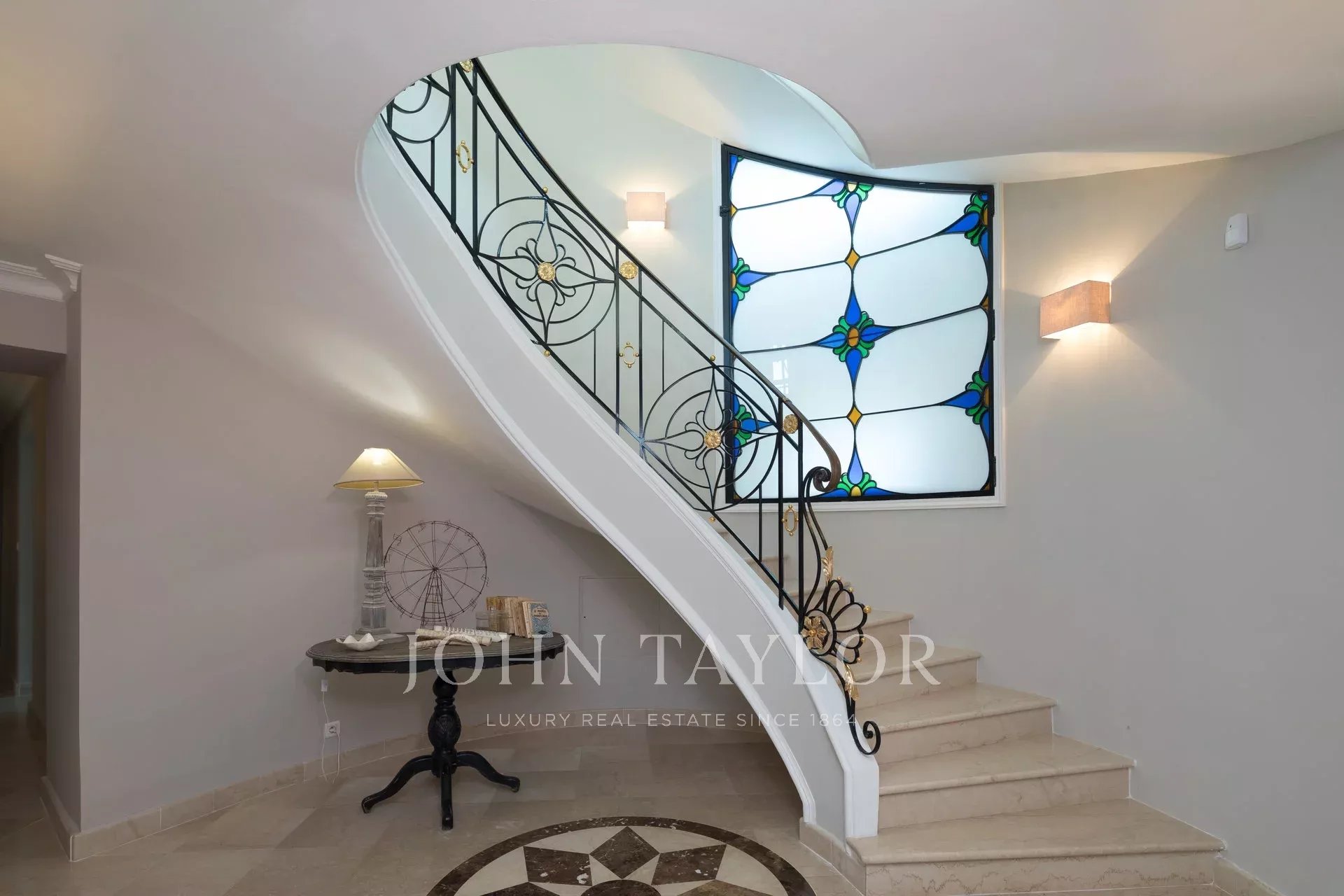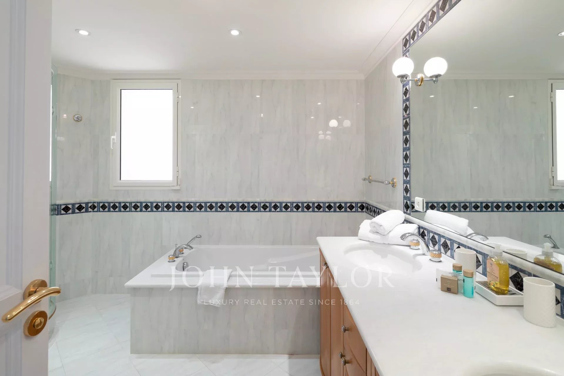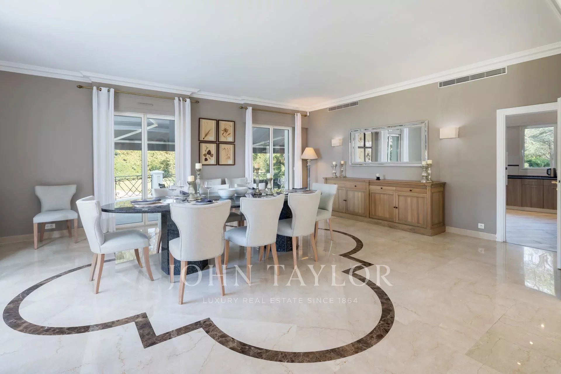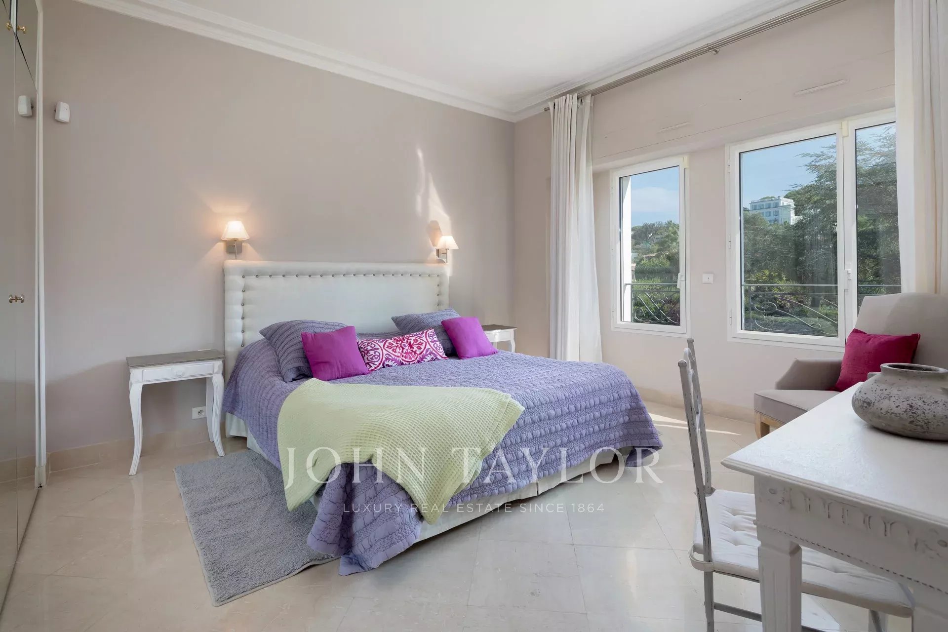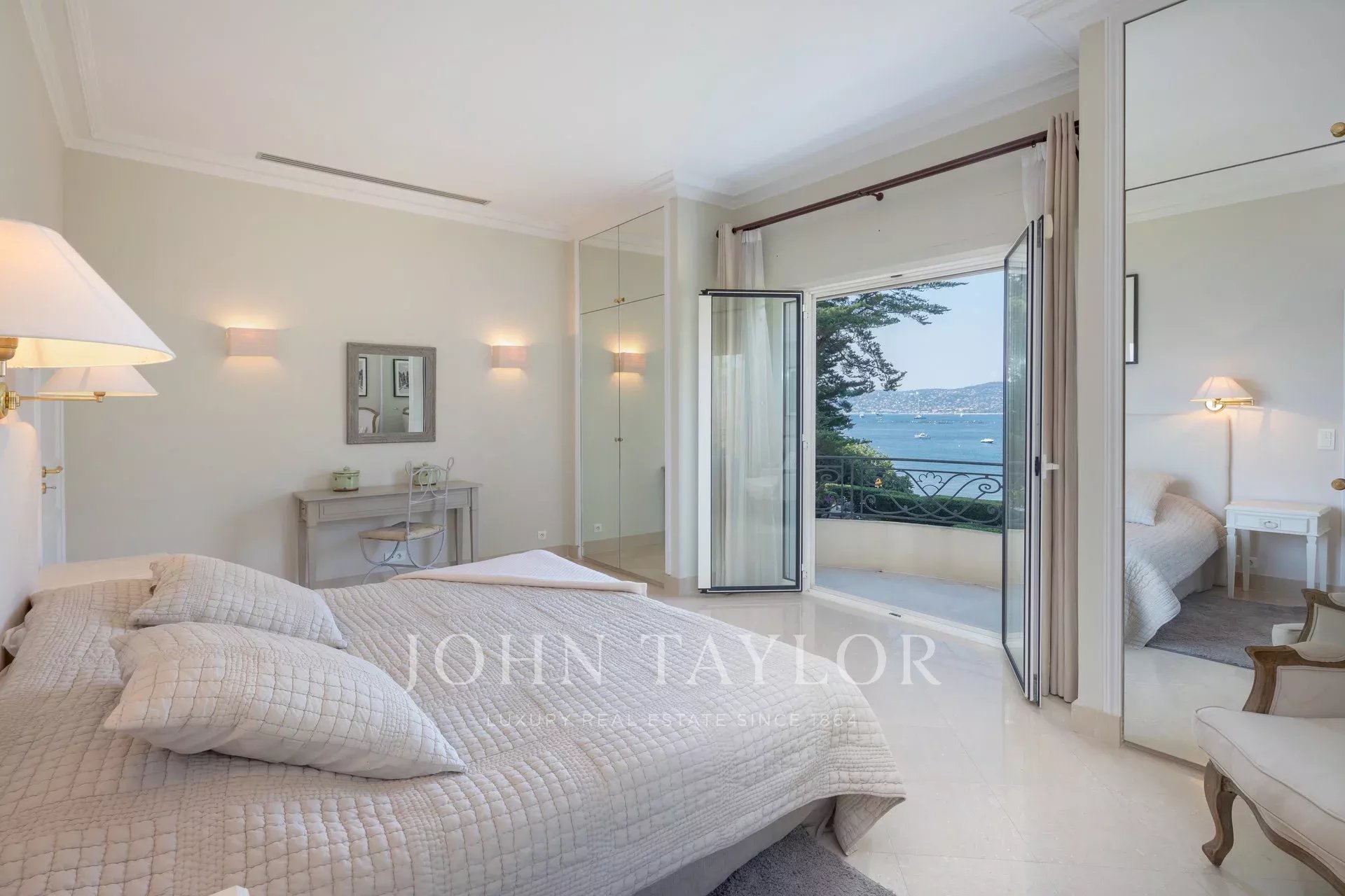 Esplêndida propriedade de 3 pisos na Boulevard du Littoral. Apenas a alguns minutos a pé do hotel Eden Roc, desfruta de belas vistas sobre a Baía de Juan Les Pins, as Ilhas Lérins e o Esterel. Totalmente renovada e com ar condicionado, está rodeada por 9.000 m2 de terrenos bem concebidos, com relvados, flores e belas árvores.