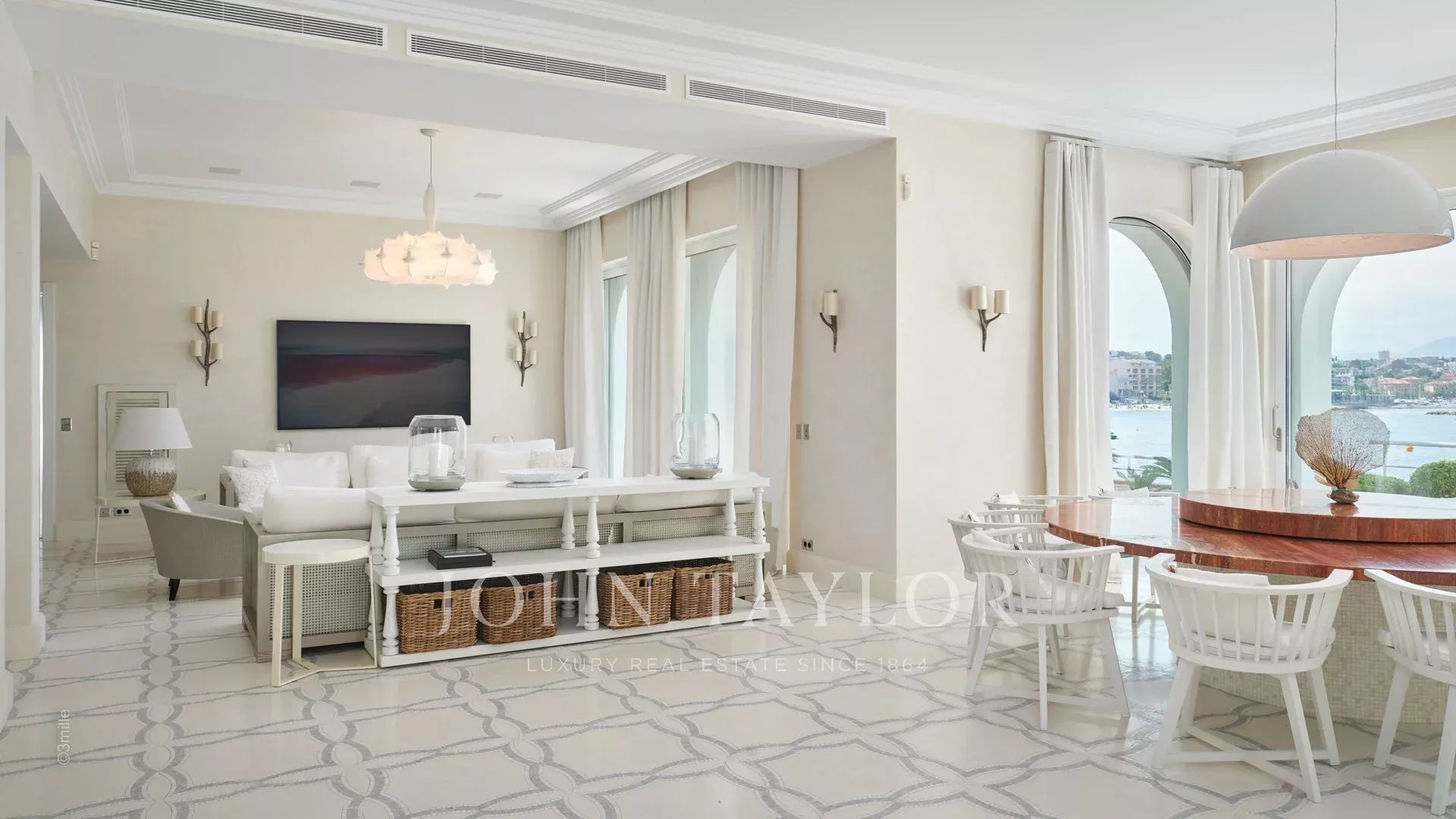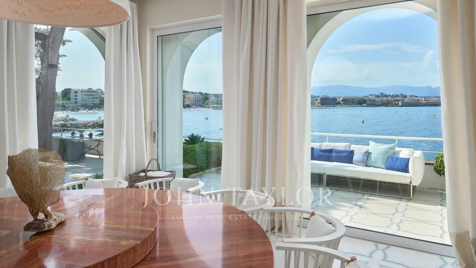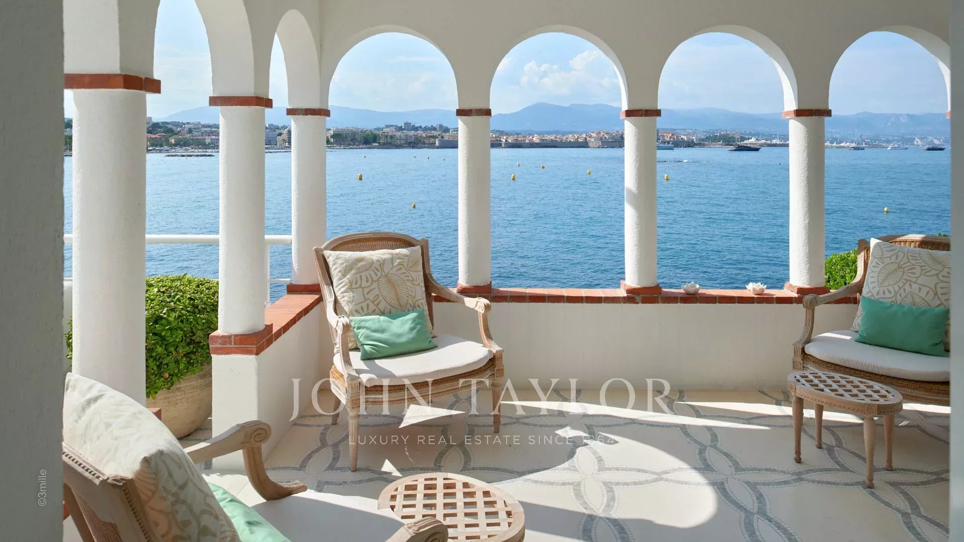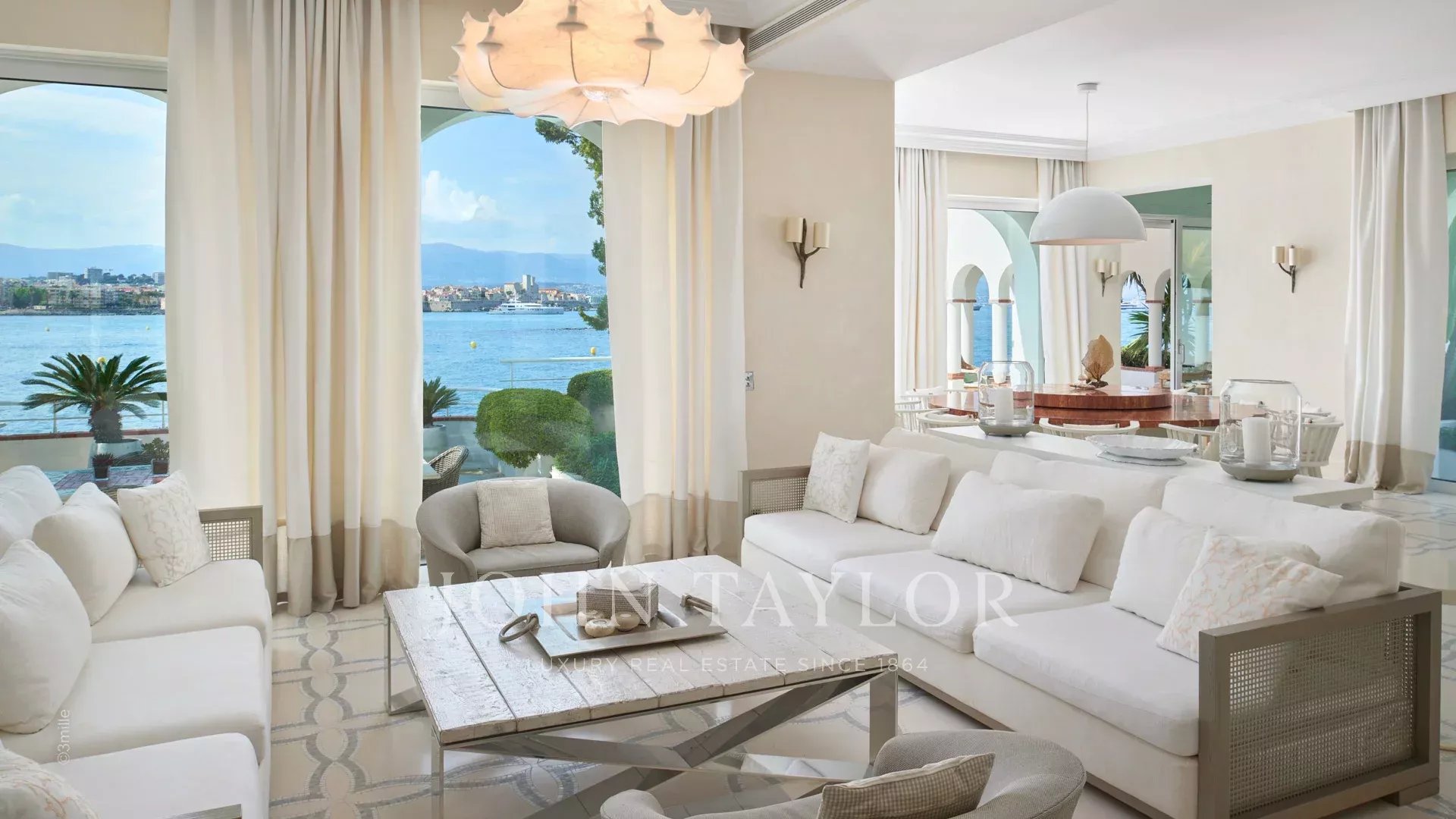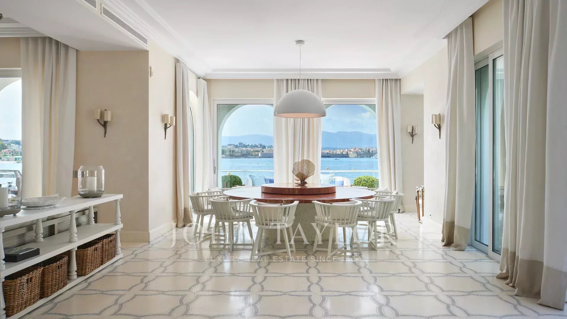 A entrada conduz a uma vasta sala de receção que se abre para um magnífico terraço com vista para o mar e para a Antibes antiga, composta por uma sala de estar e de jantar com capacidade para 12 pessoas.