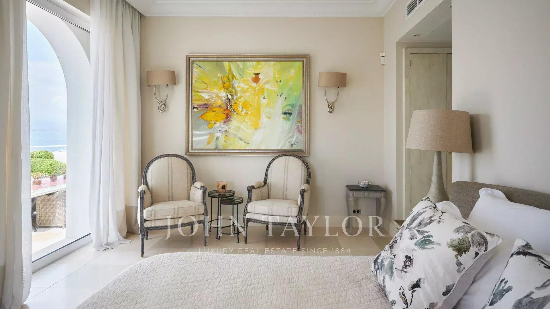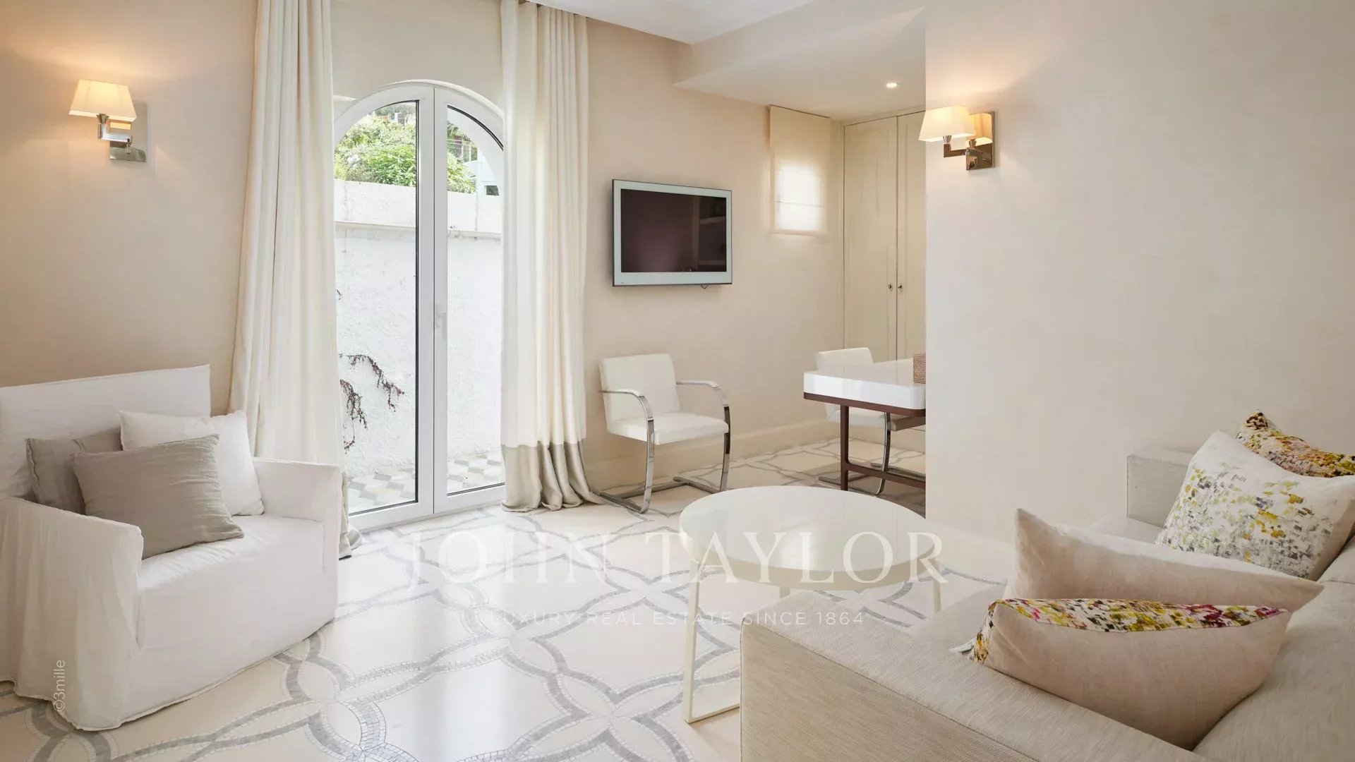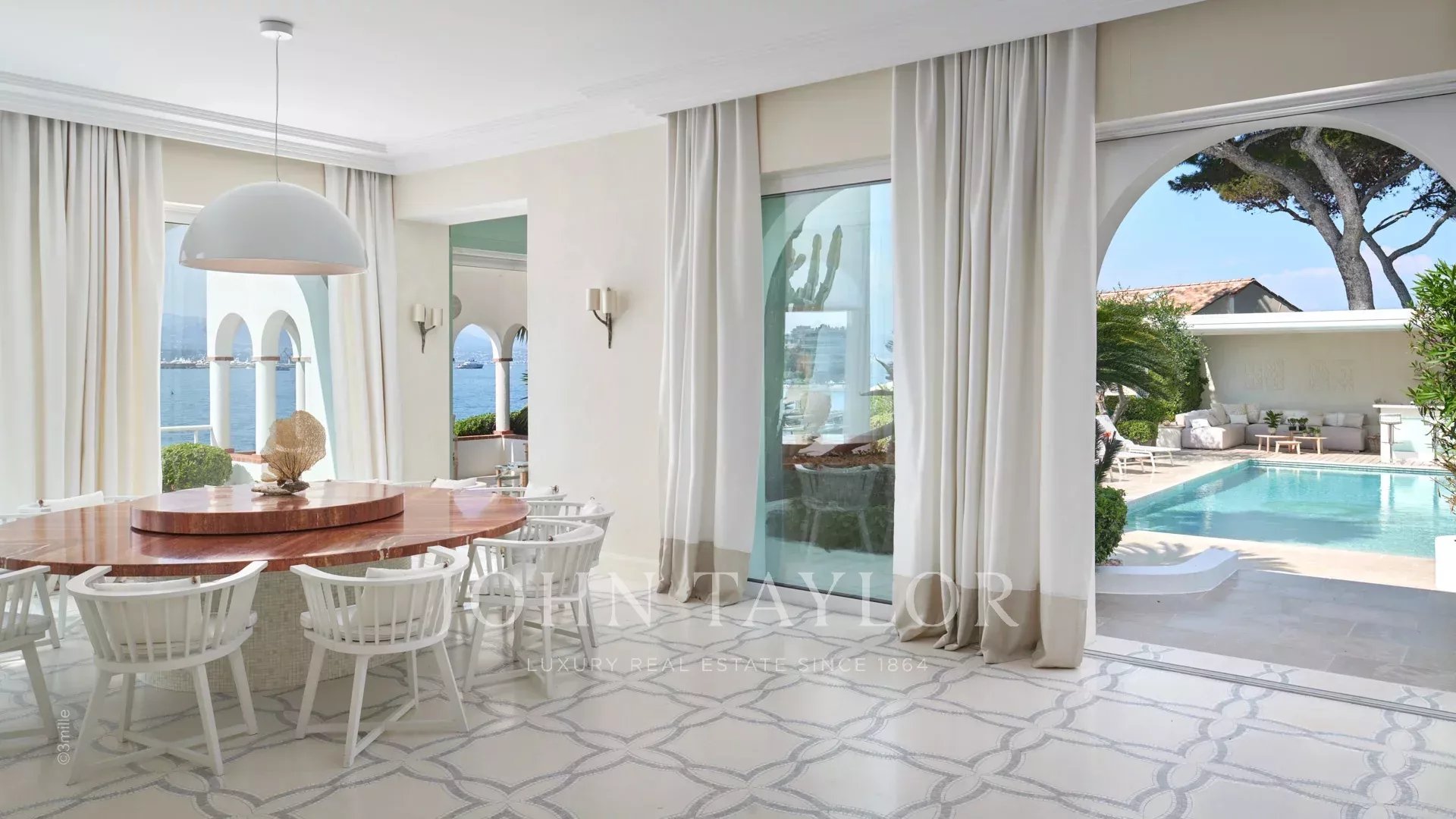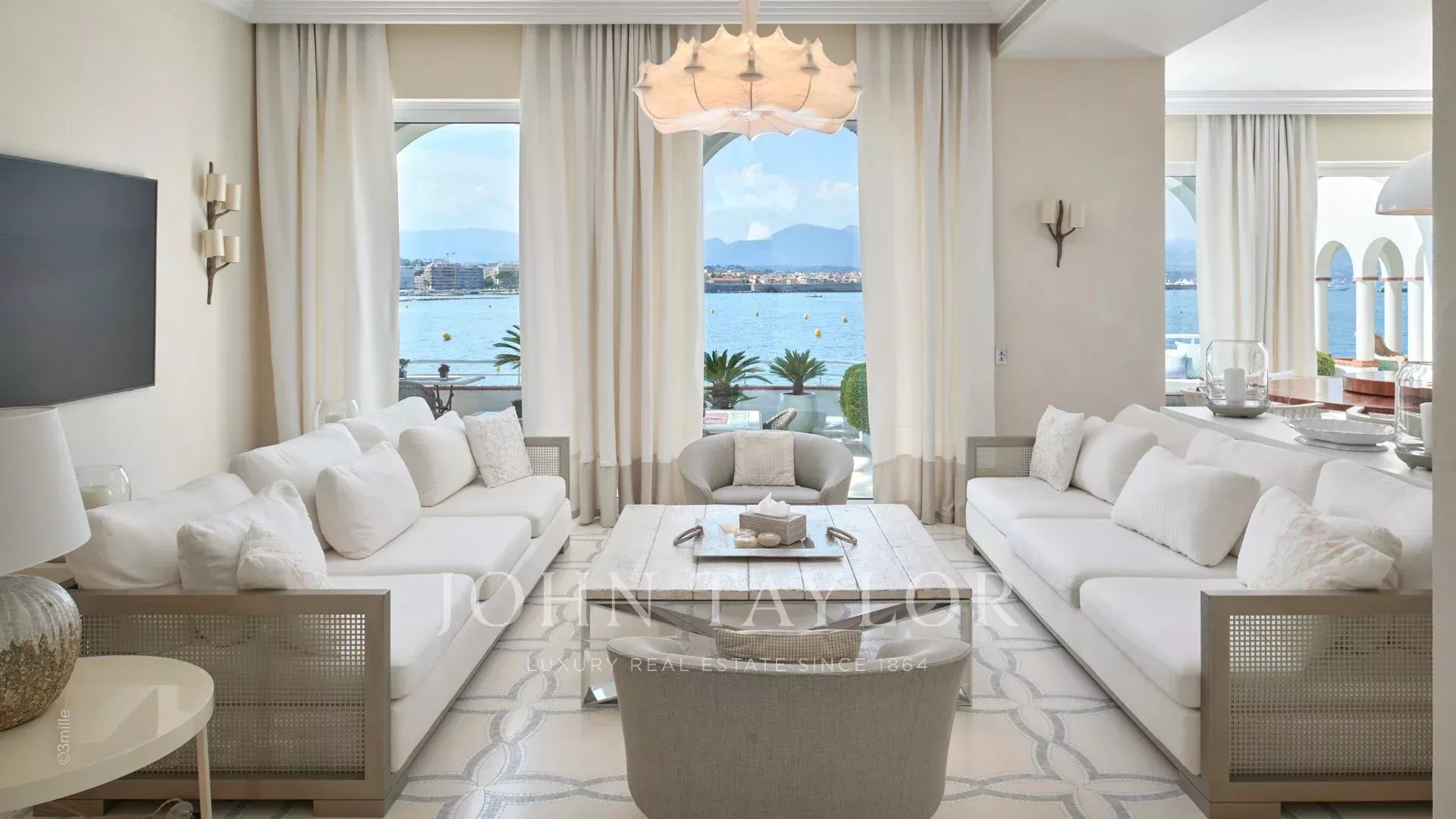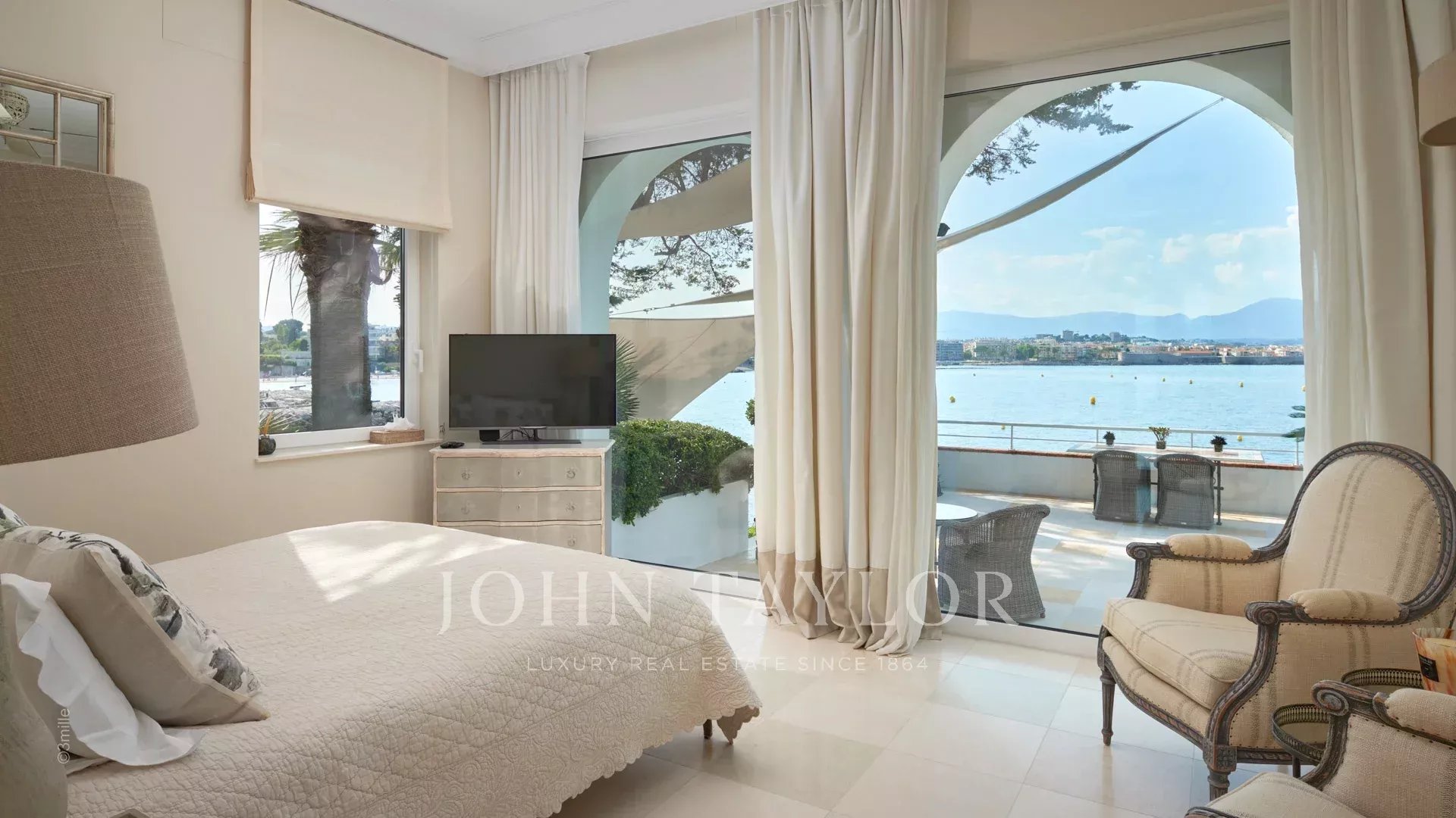 A entrada conduz a uma vasta sala de receção que se abre para um magnífico terraço com vista para o mar e para a Antibes antiga, composta por uma sala de estar e de jantar com capacidade para 12 pessoas.