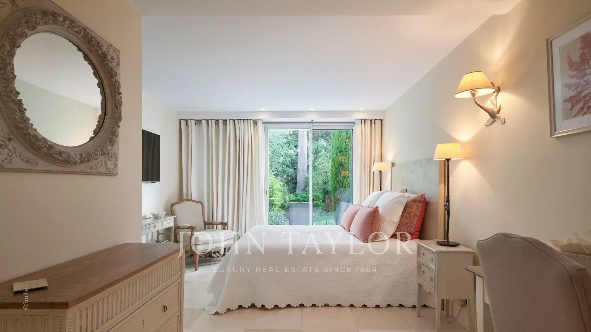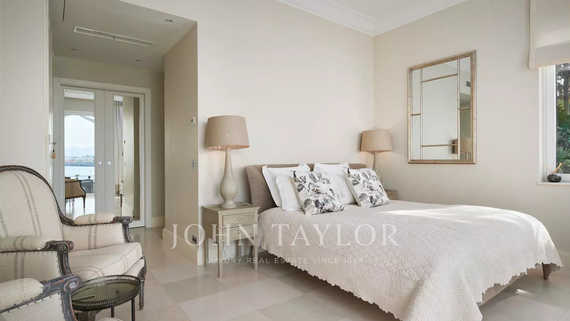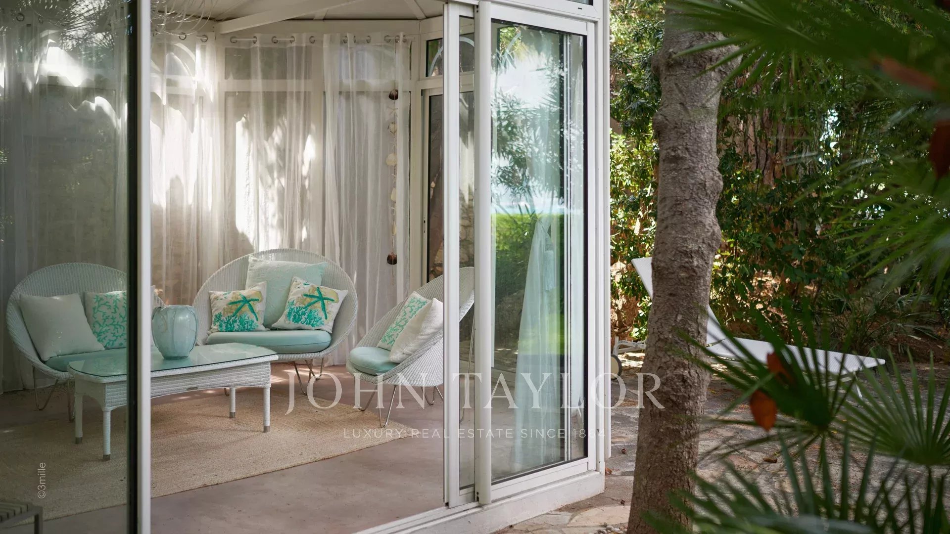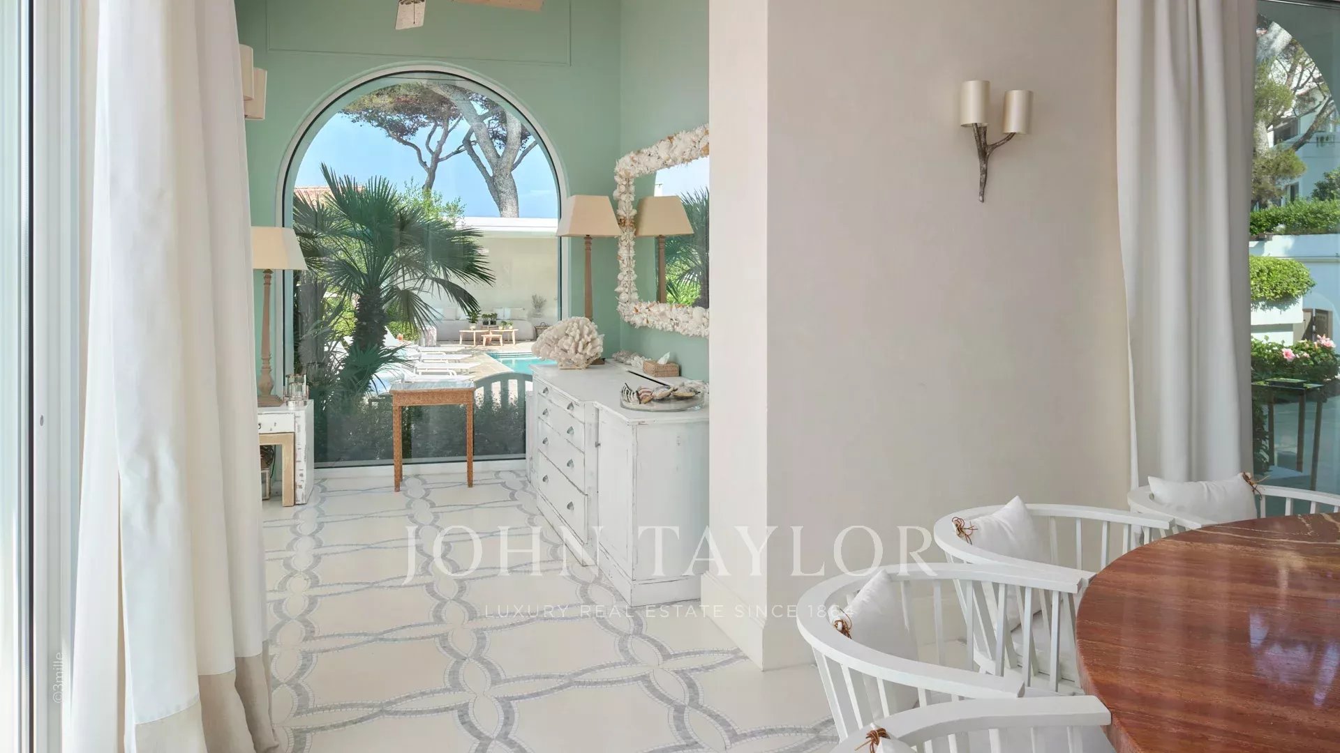 A entrada conduz a uma vasta sala de receção que se abre para um magnífico terraço com vista para o mar e para a Antibes antiga, composta por uma sala de estar e de jantar com capacidade para 12 pessoas.