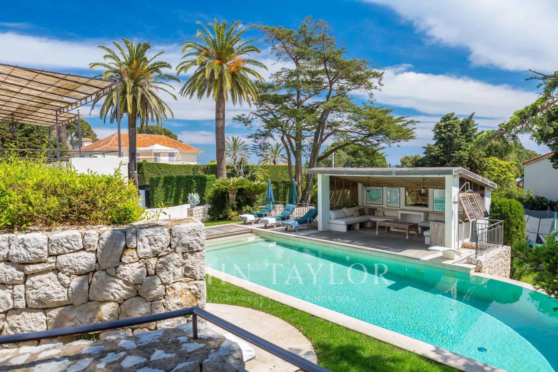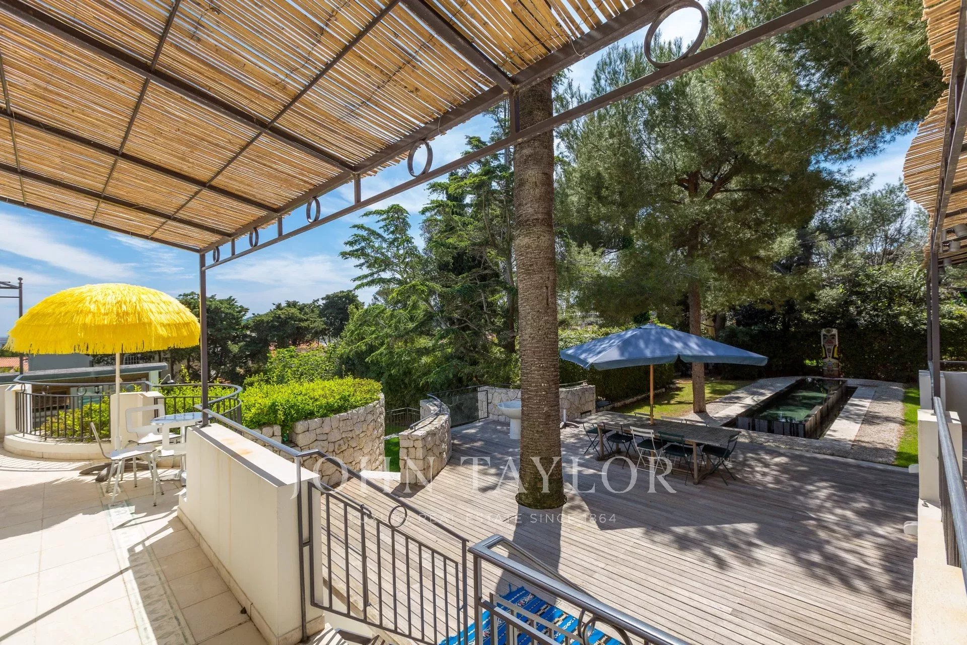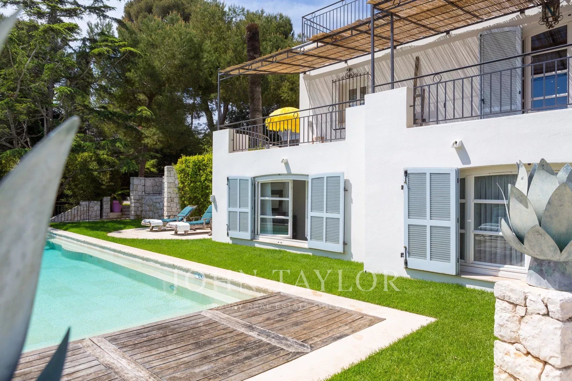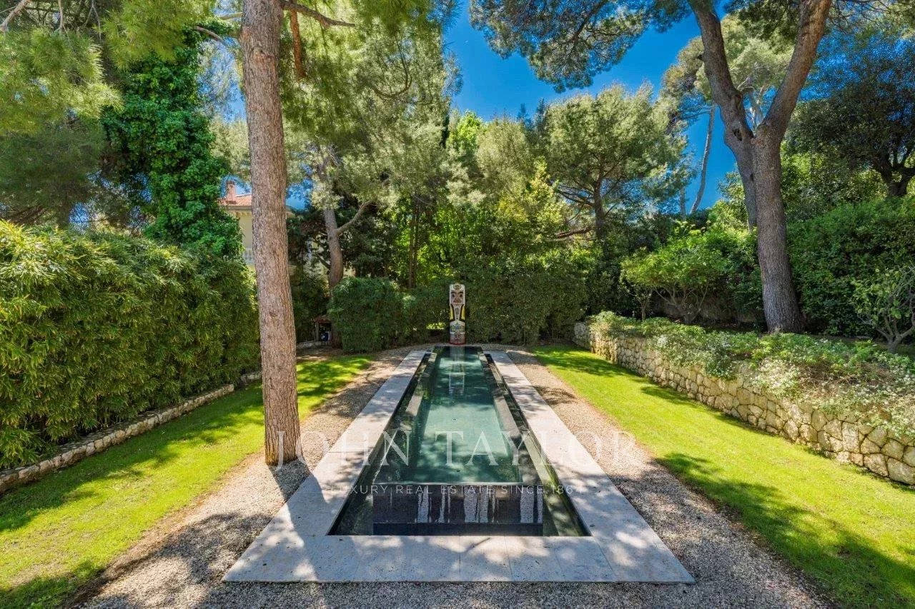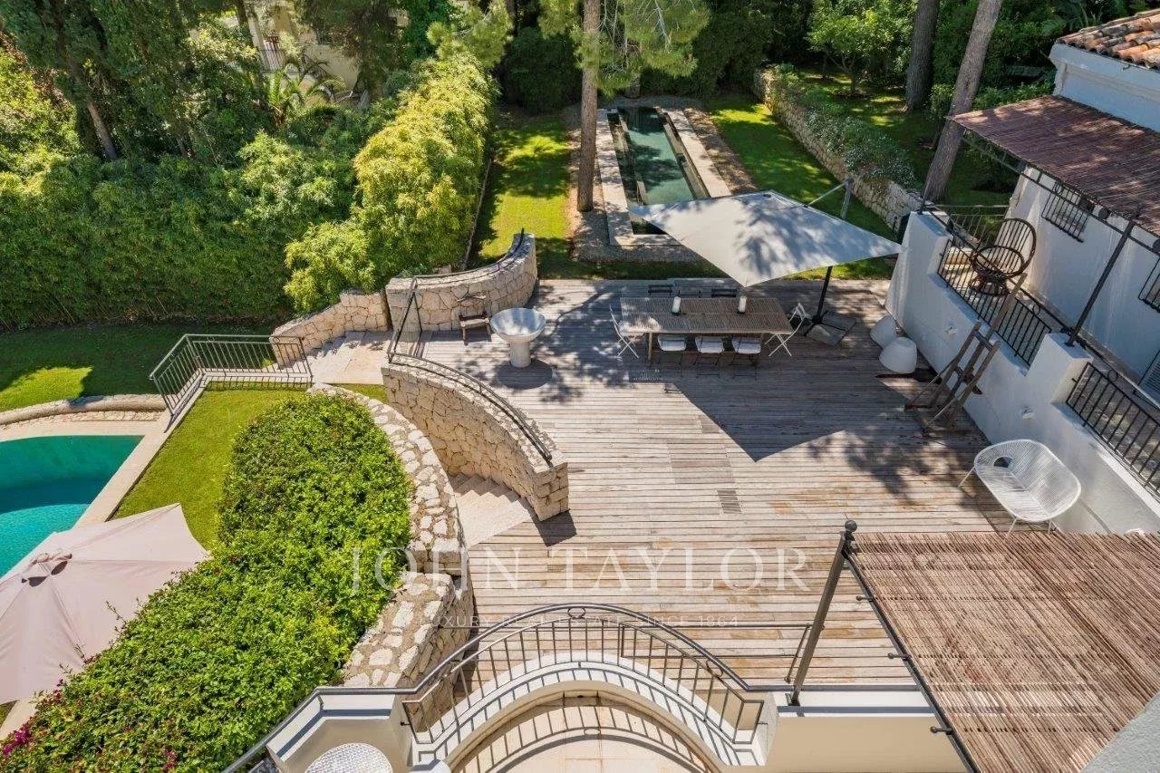 Situada numa pequena propriedade fechada perto das praias de La Garoupe, esta bonita moradia climatizada, totalmente renovada, com 400 m2 de área de habitação, está inserida em 2.700 m2 de magníficos terrenos com cascatas e fontes.
