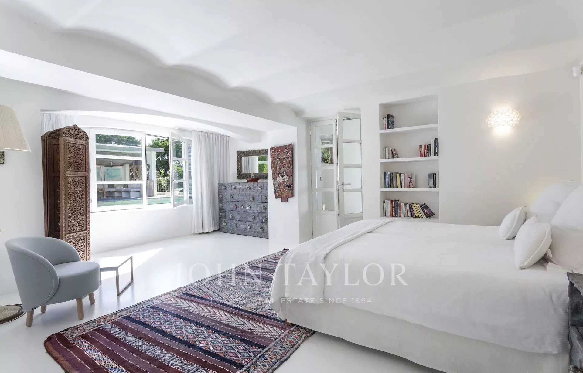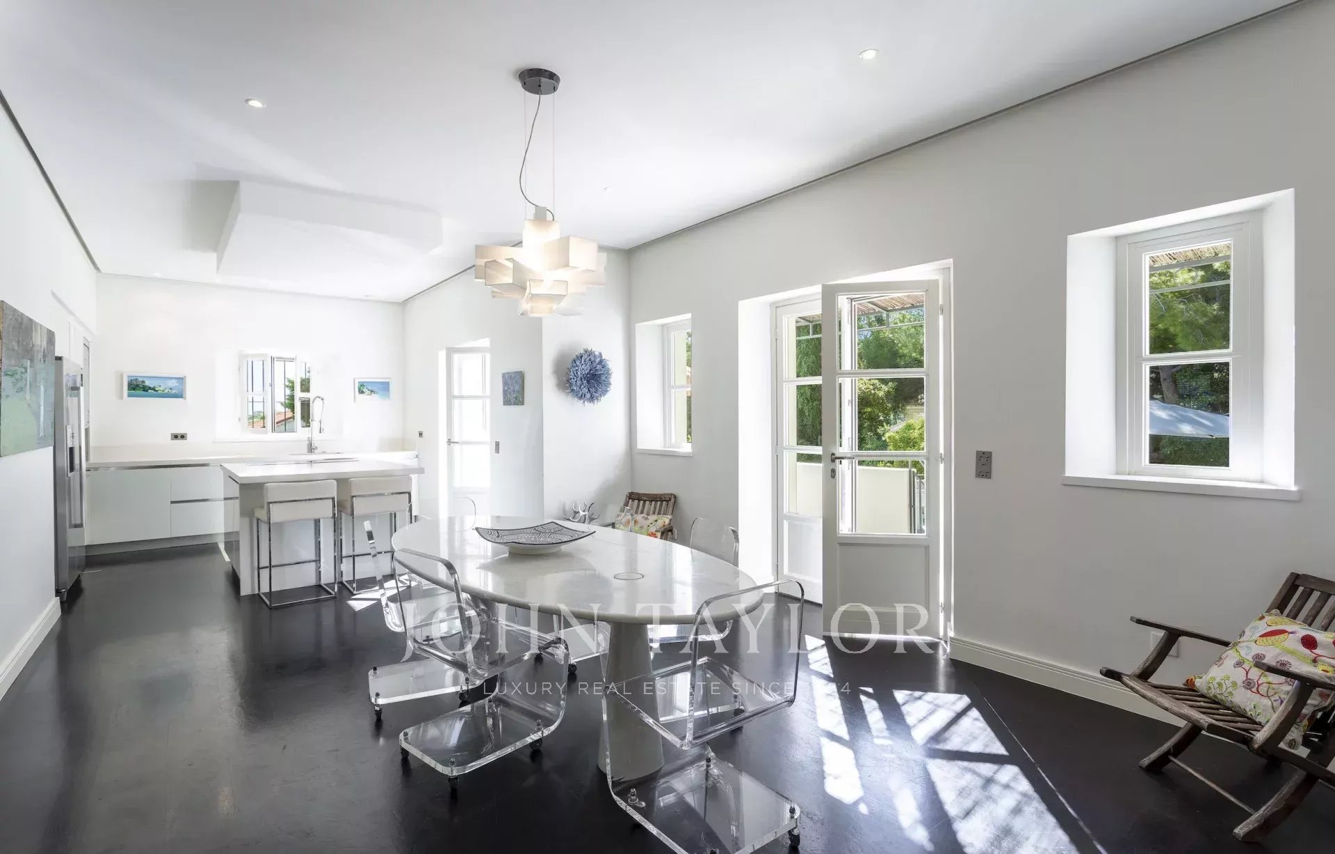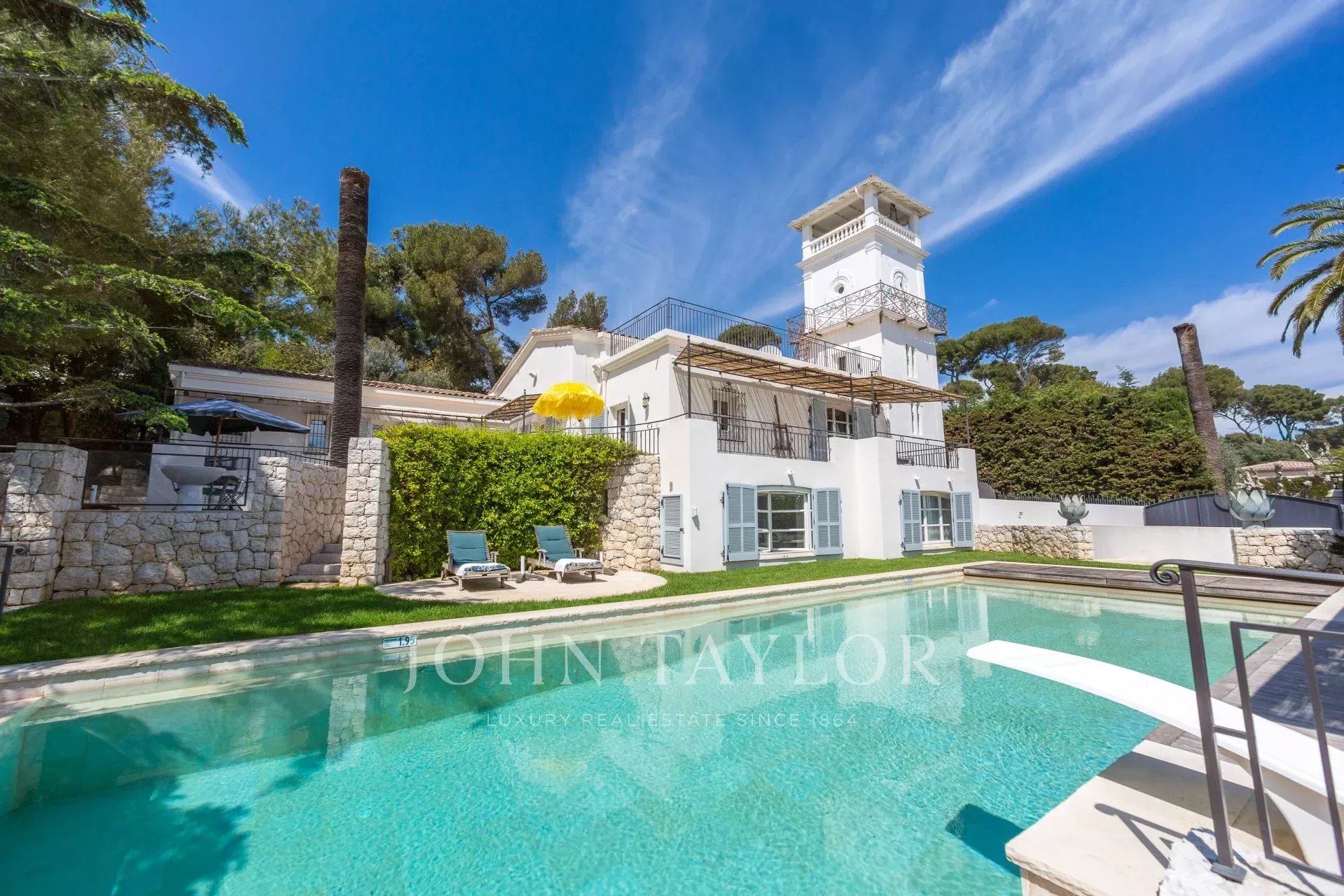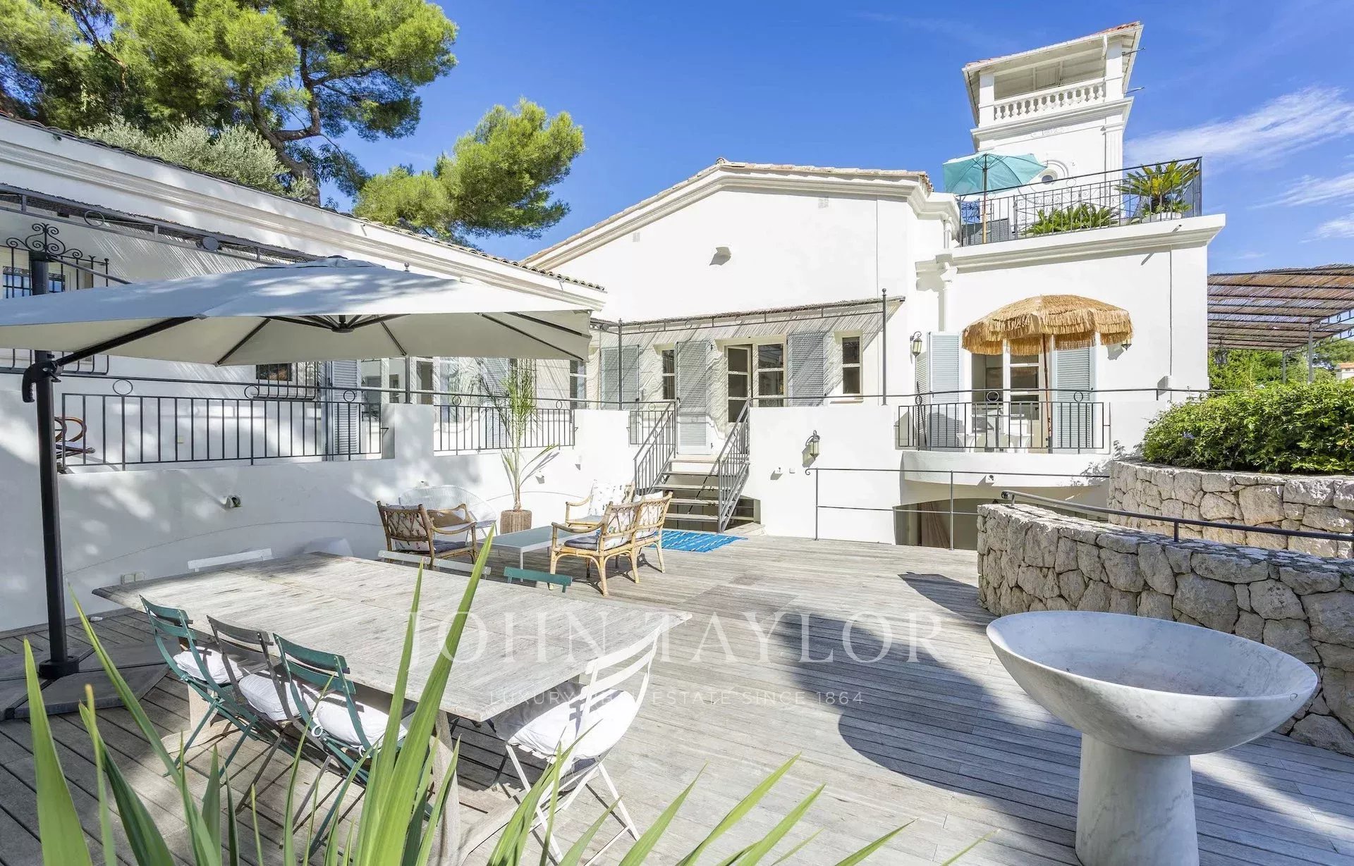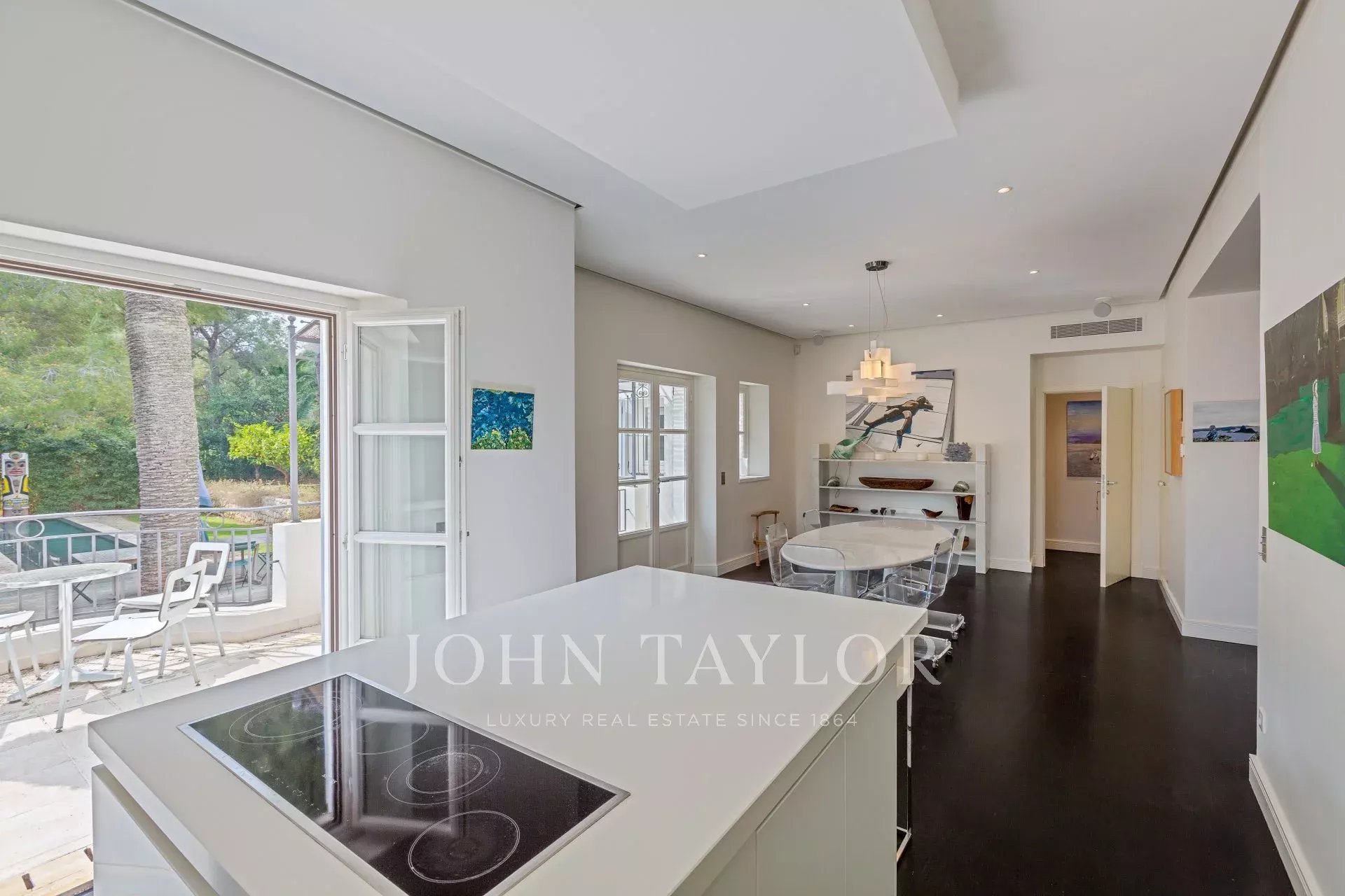 Situada numa pequena propriedade fechada perto das praias de La Garoupe, esta bonita moradia climatizada, totalmente renovada, com 400 m2 de área de habitação, está inserida em 2.700 m2 de magníficos terrenos com cascatas e fontes.