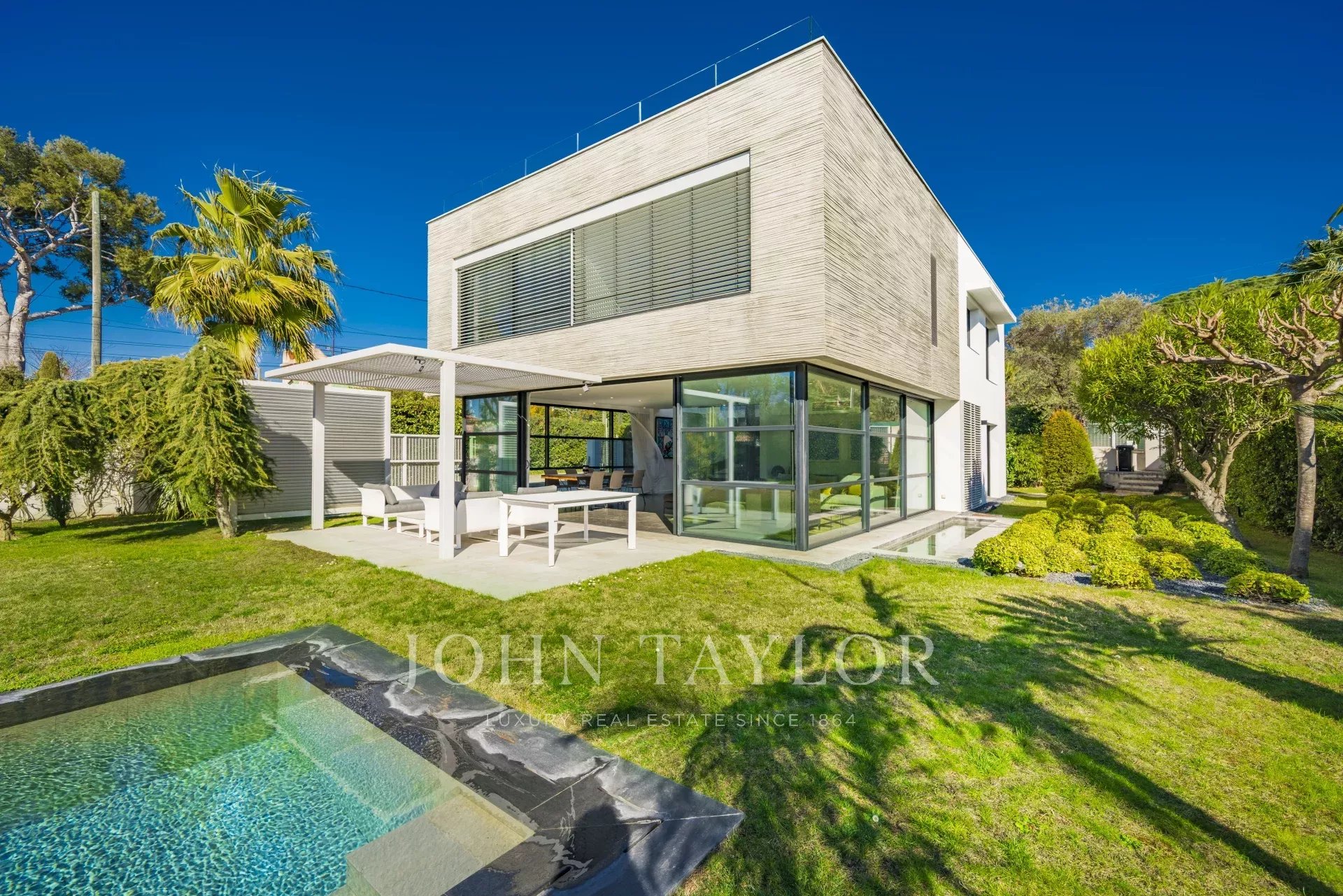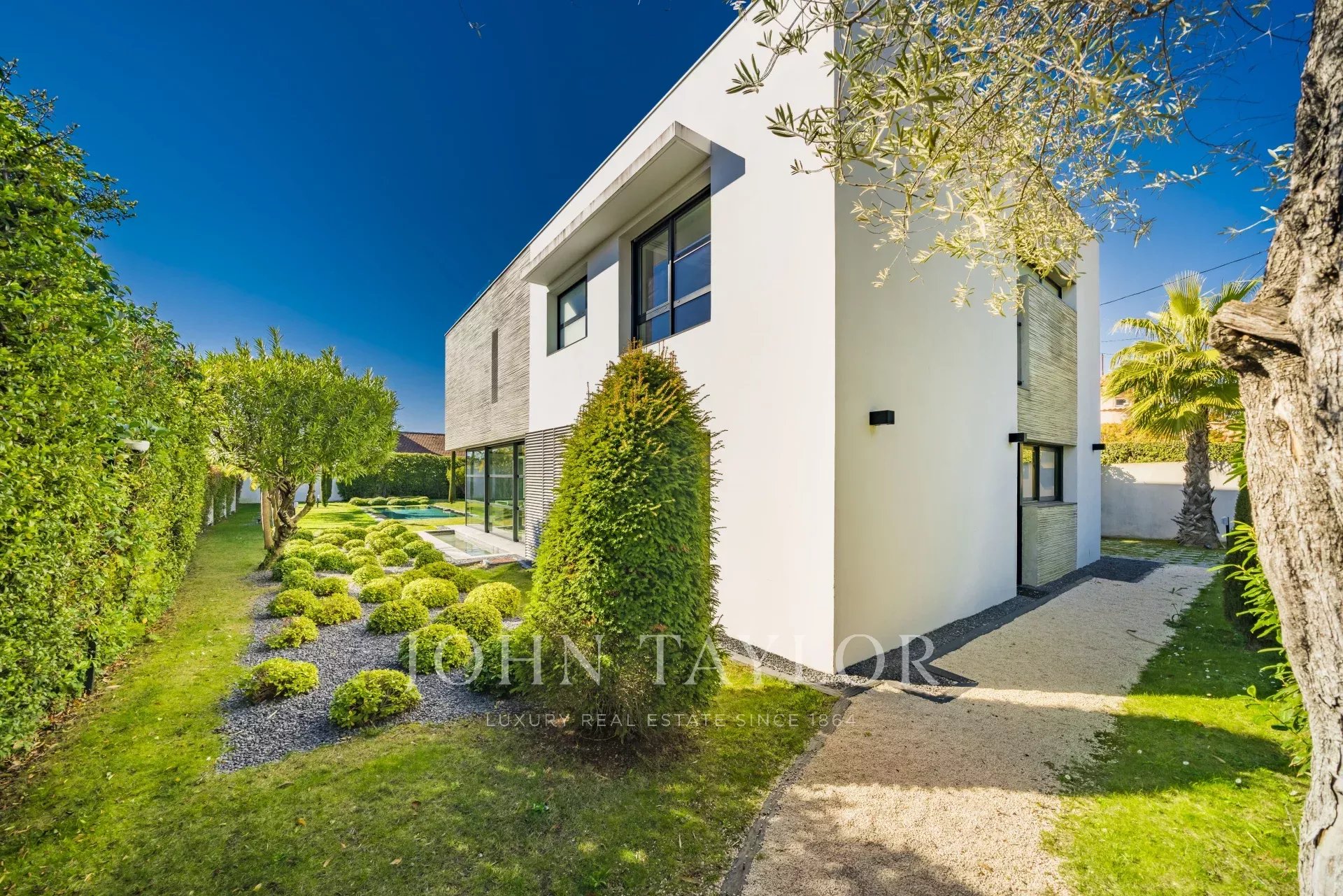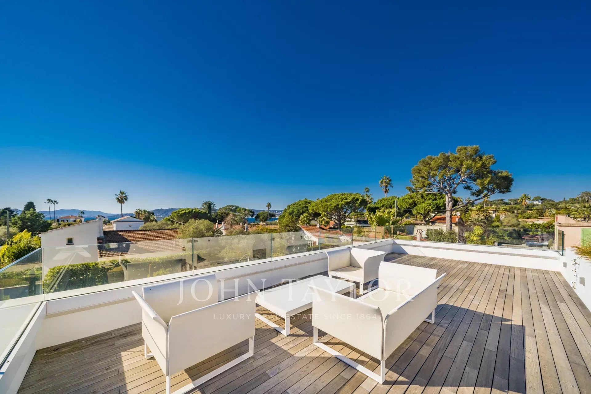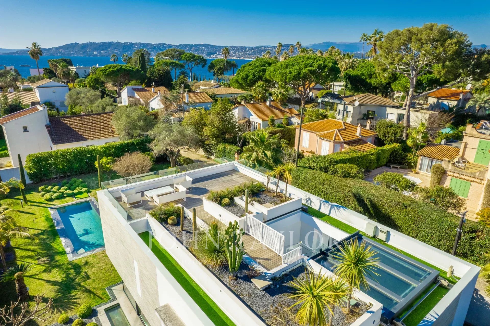 Bonita moradia contemporânea a ser concluída no verão de 2020, com 320 m² de área habitacional em 940 m² de terreno plano e com vistas deslumbrantes para o mar (a baía de Juan les Pins e as Iles de Lerins) a partir do seu terraço no telhado.