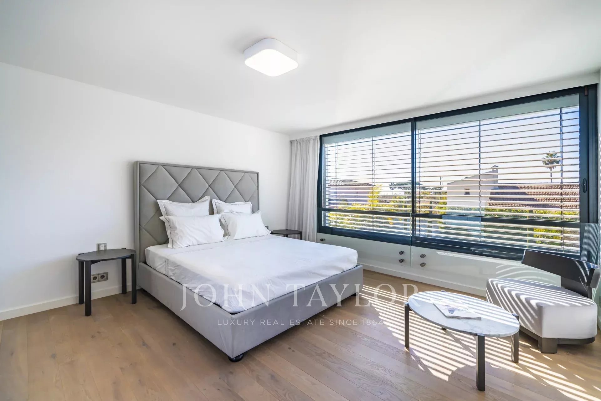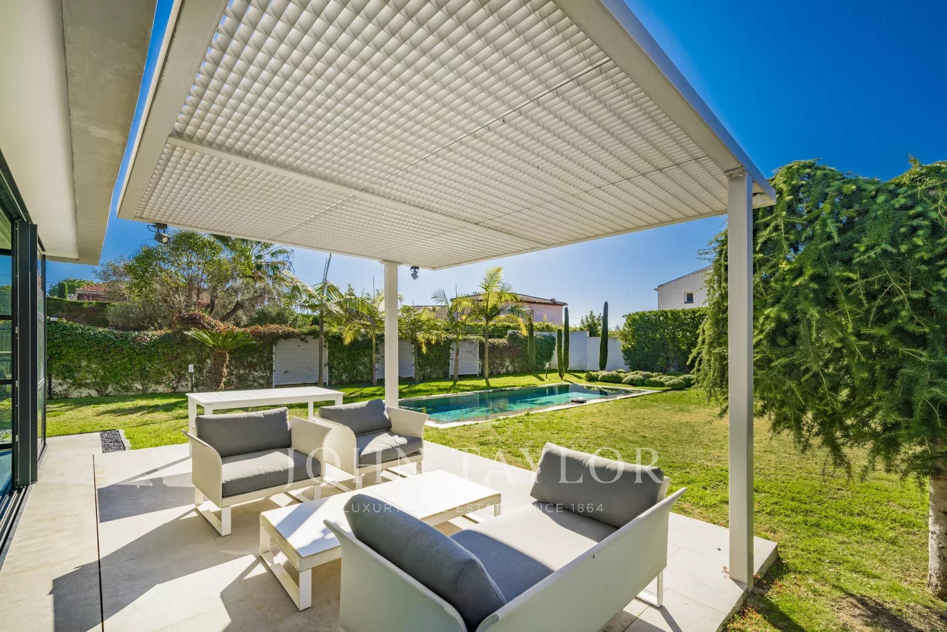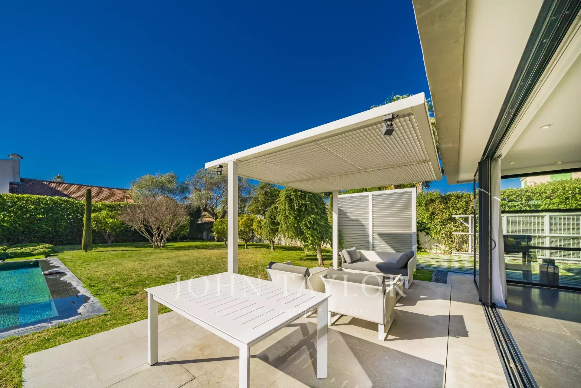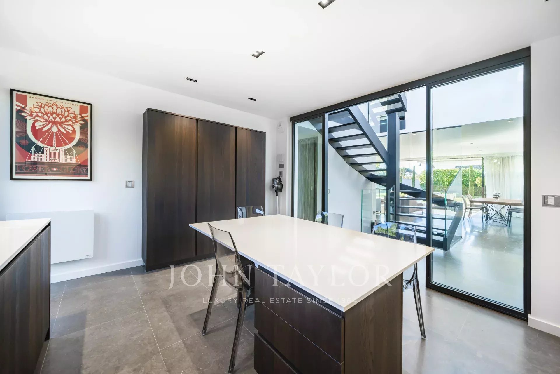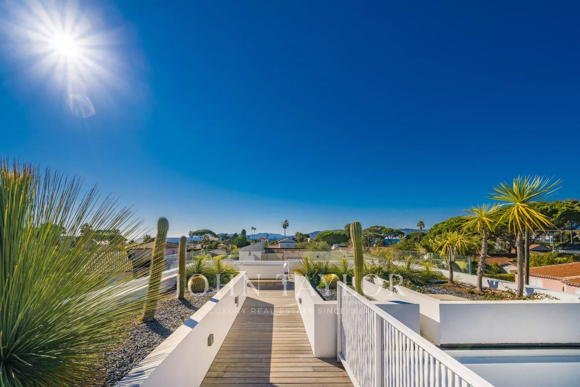 Bonita moradia contemporânea a ser concluída no verão de 2020, com 320 m² de área habitacional em 940 m² de terreno plano e com vistas deslumbrantes para o mar (a baía de Juan les Pins e as Iles de Lerins) a partir do seu terraço no telhado.