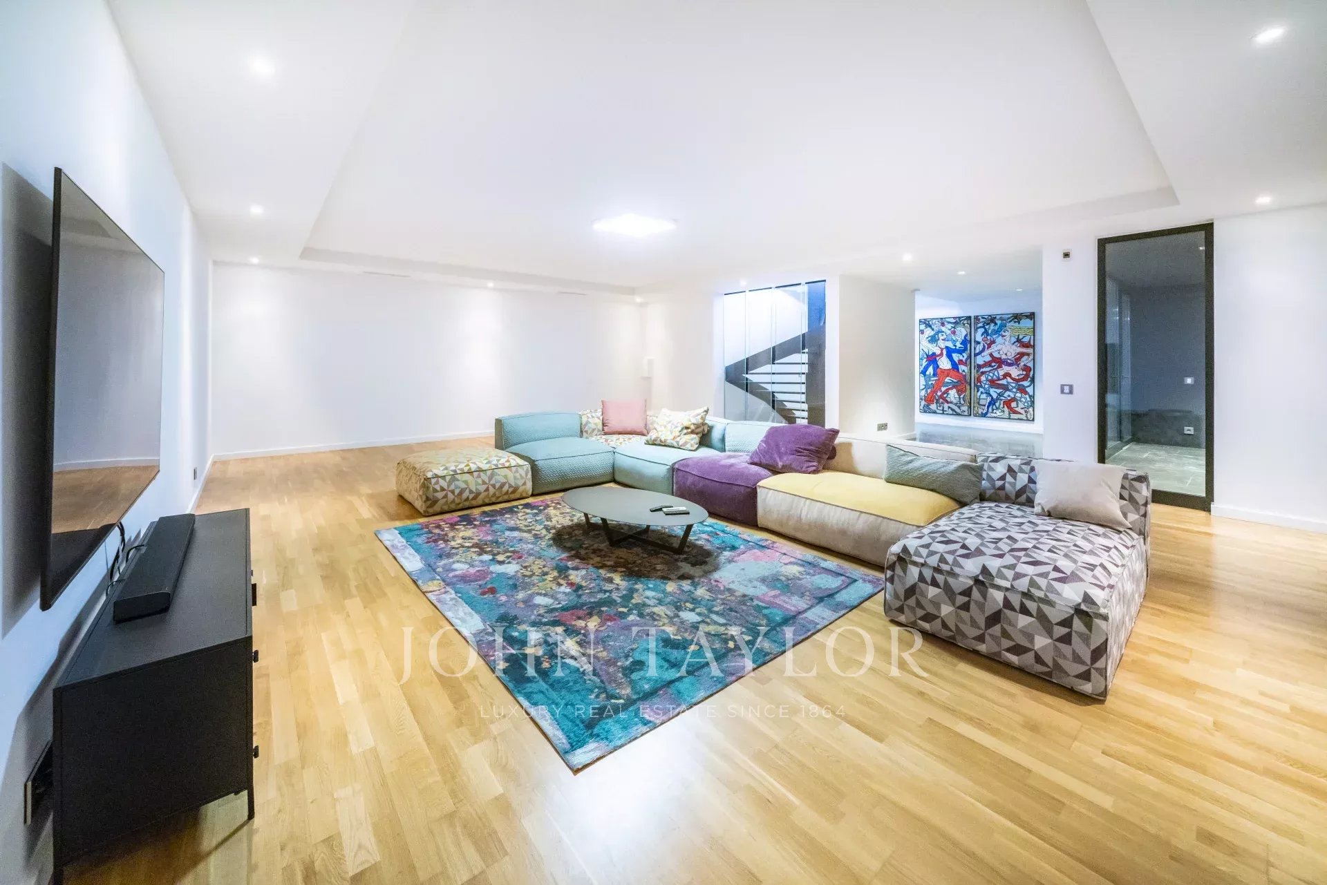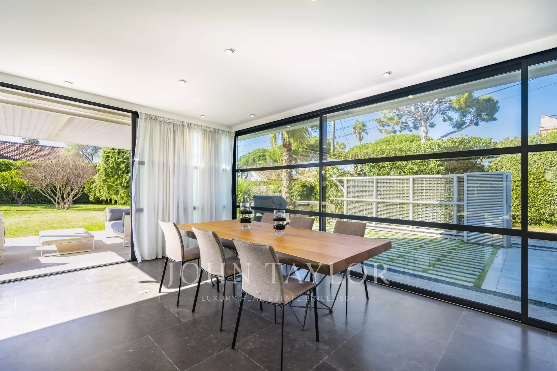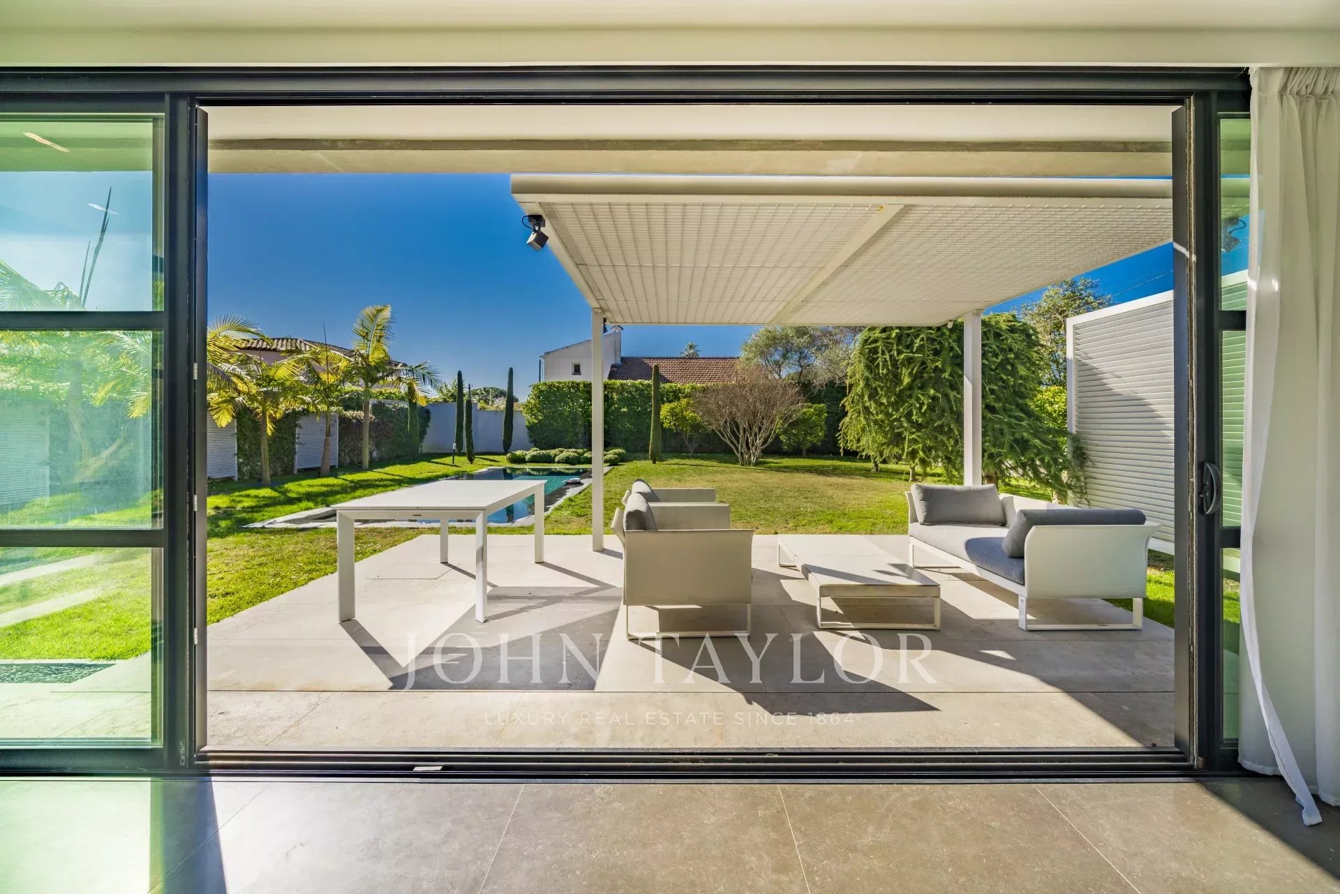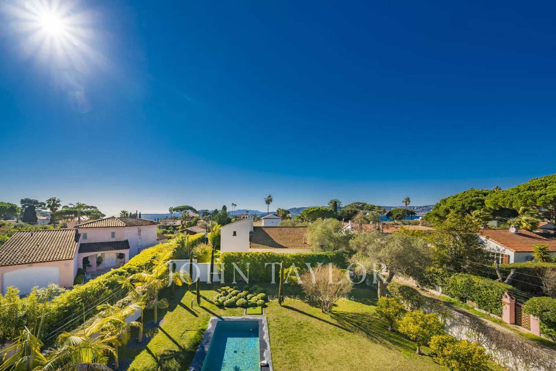 Bonita moradia contemporânea a ser concluída no verão de 2020, com 320 m² de área habitacional em 940 m² de terreno plano e com vistas deslumbrantes para o mar (a baía de Juan les Pins e as Iles de Lerins) a partir do seu terraço no telhado.