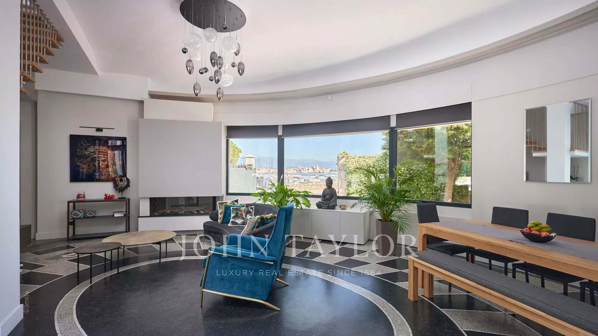 Hall de entrada que conduz à sala de receção circular que se abre para o terraço e para o jardim através de grandes janelas salientes e que inclui uma sala de estar, uma sala de jantar e uma cozinha em plano aberto.
