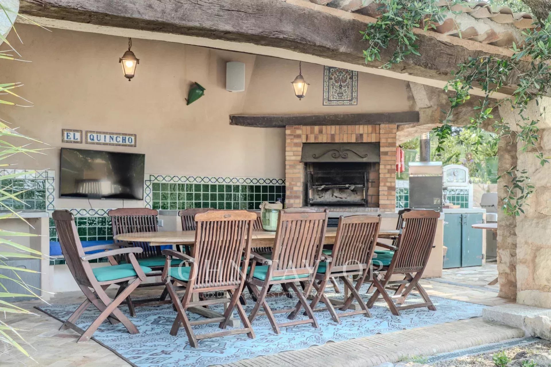 Os exteriores são complementados por uma piscina de água salgada (12 x 6 m) que pode ser aquecida, com uma casa de piscina "El Quincho" totalmente renovada e uma verdadeira cozinha de verão, um churrasco tradicional argentino, casa de banho - o cenário perfeito para uma tarde ou um aperitivo. Wi-Fi de alta velocidade (fibra) à volta da piscina.