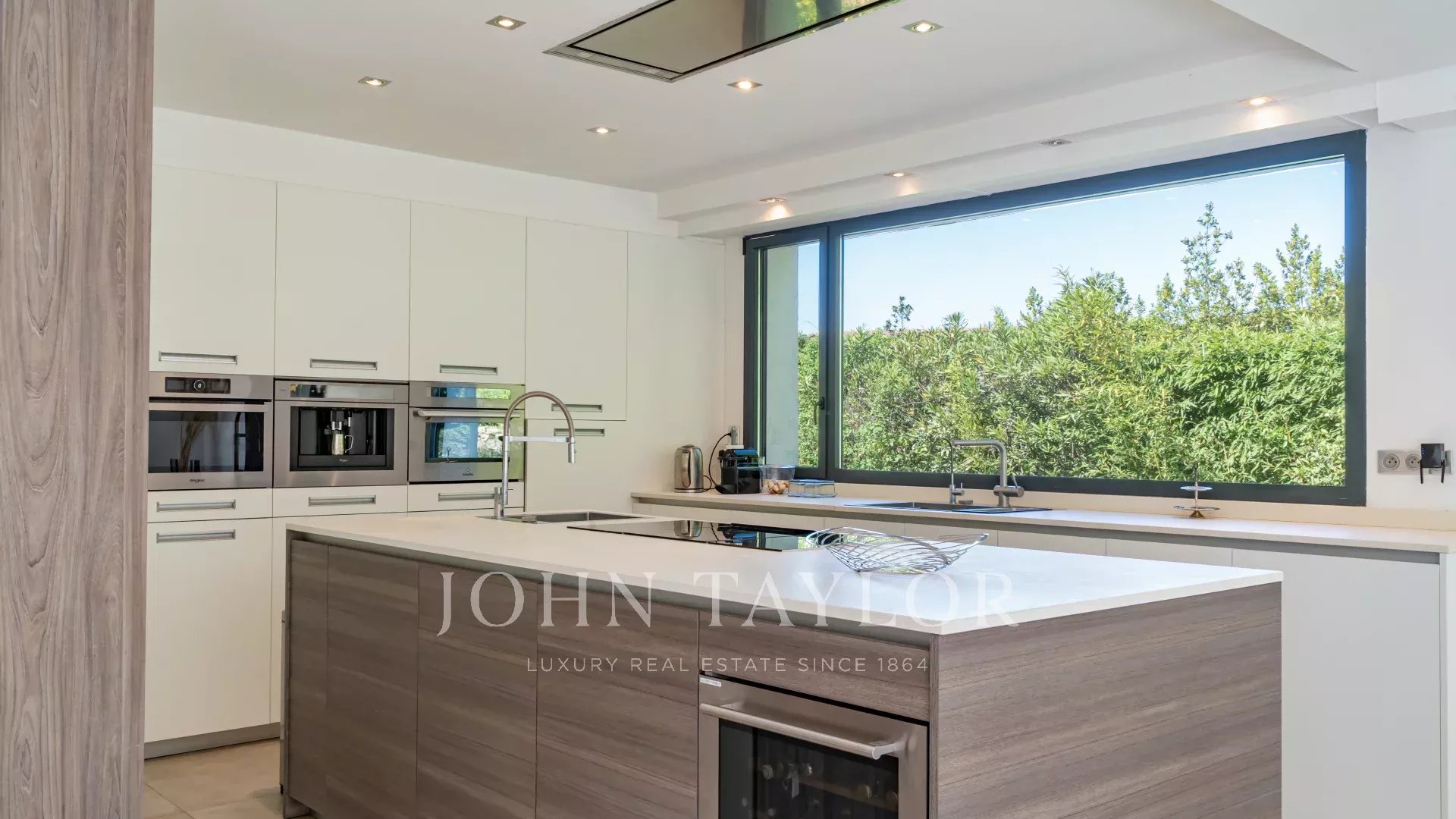 Desfrute de uma vasta sala de estar com uma lareira banhada em luz, que se abre para o jardim, bem como uma cozinha moderna totalmente equipada, que se abre para uma elegante sala de jantar.