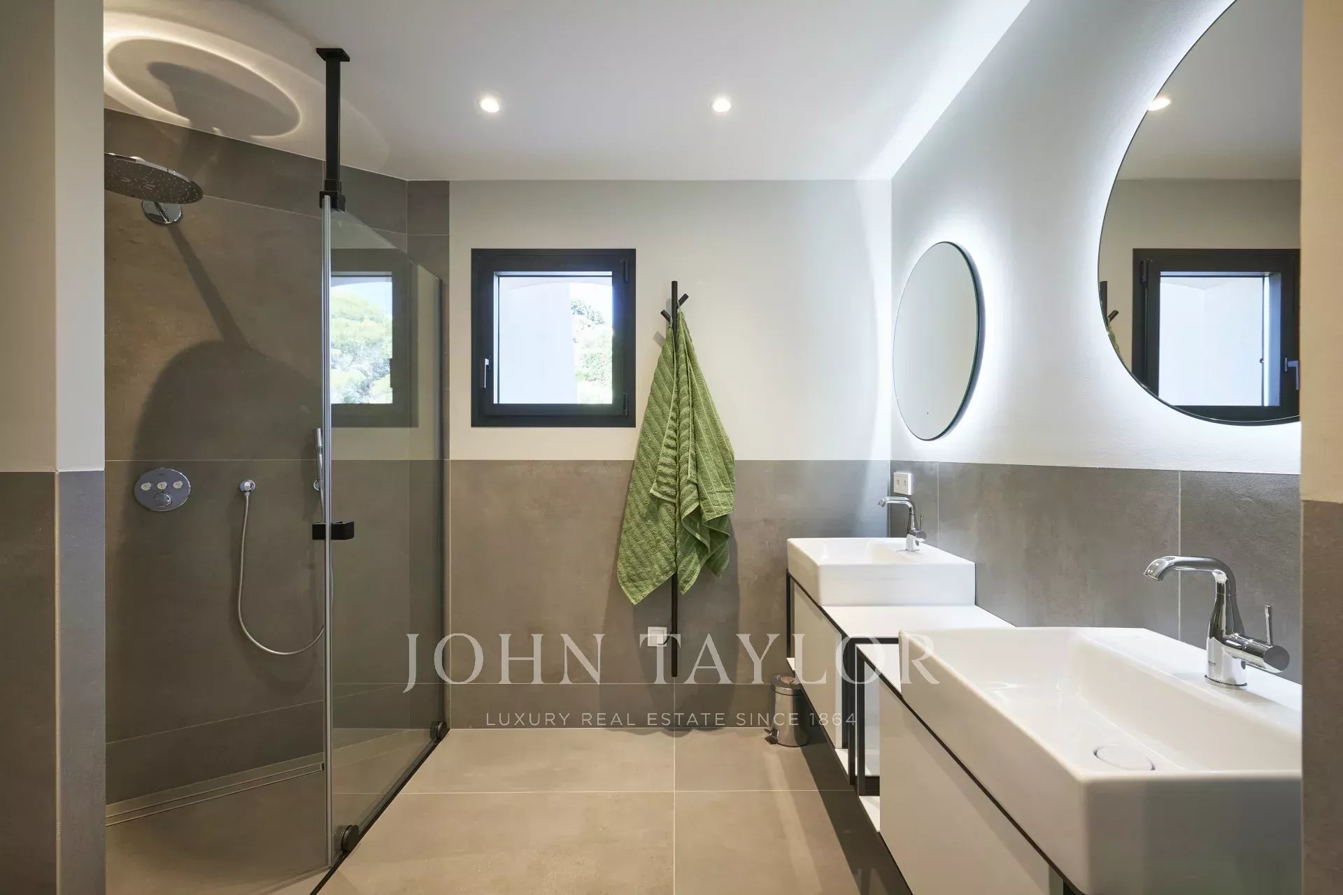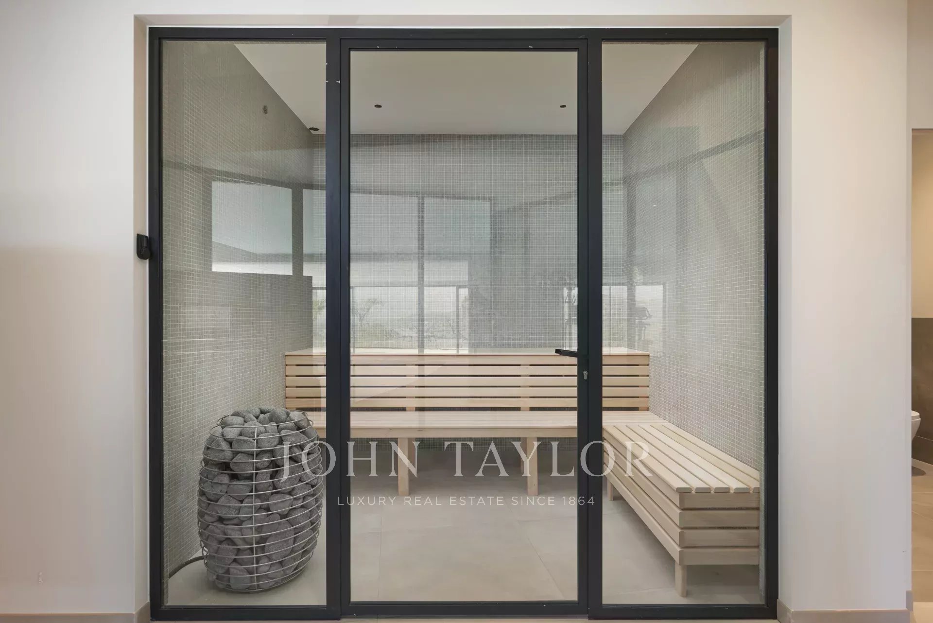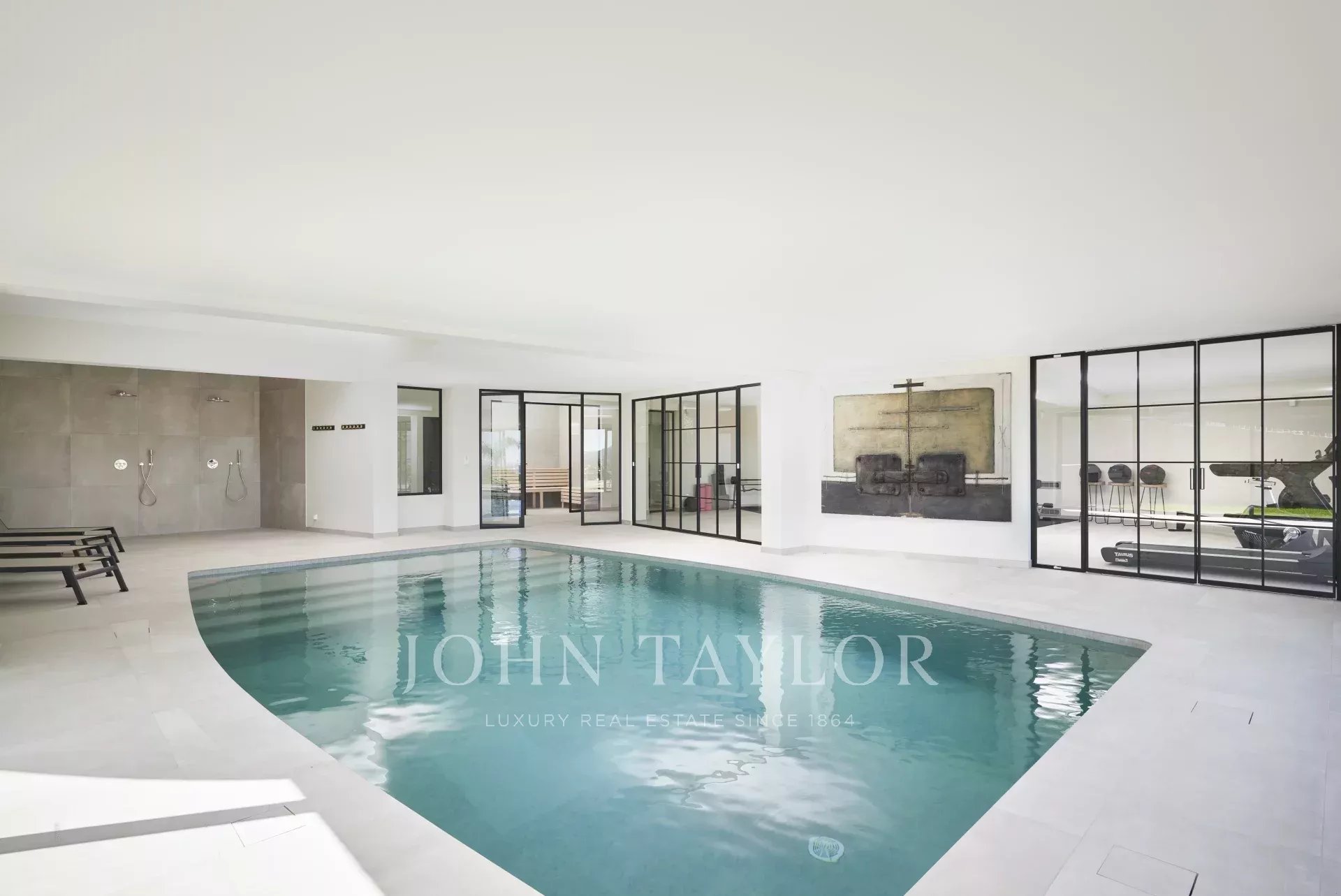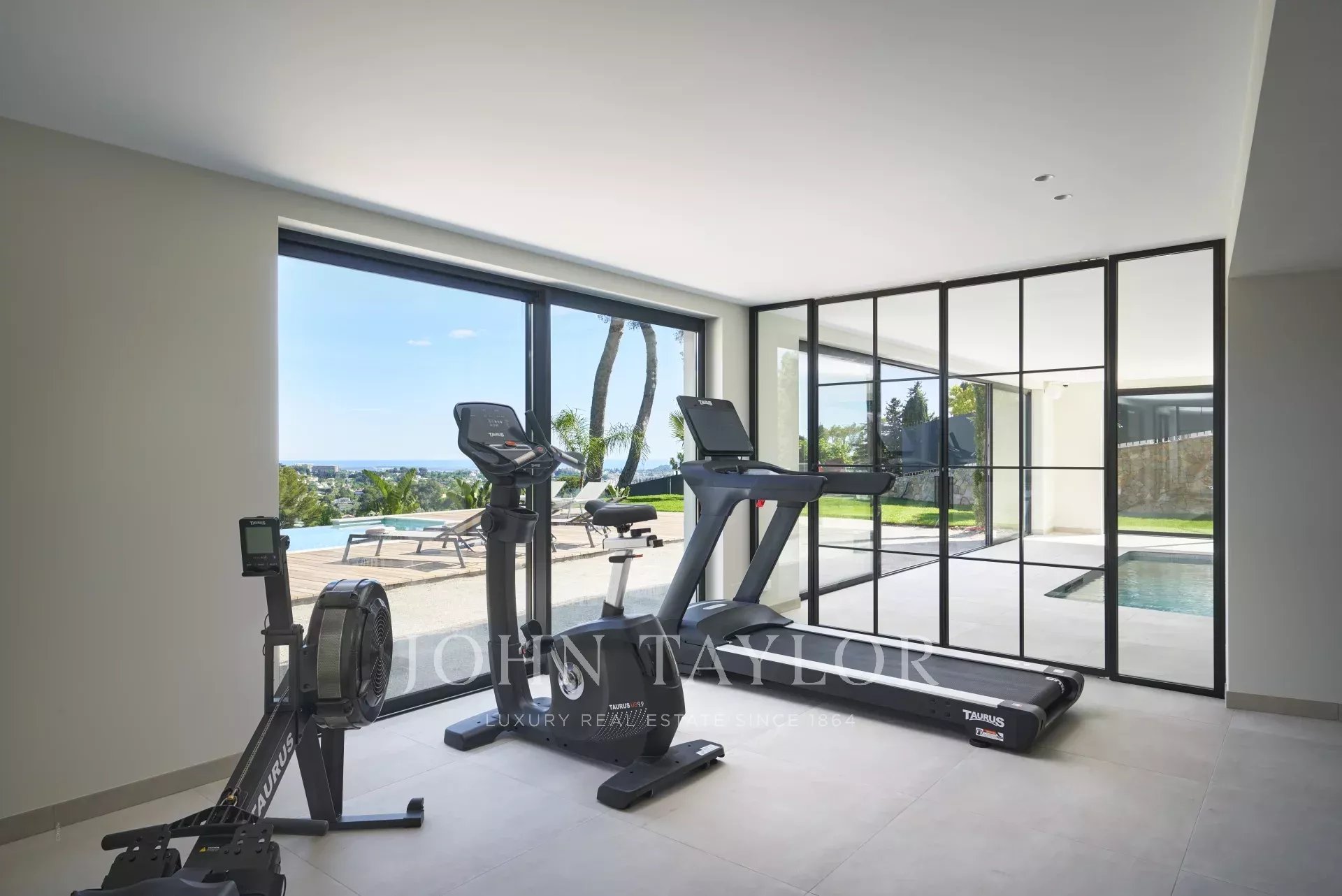 O nível do jardim tem uma piscina coberta, um ginásio, uma sauna, uma sala de duche, um primeiro quarto (n°1) em suite com duas camas (90cm) ou uma cama de casal (180cm) com acesso ao terraço, um outro quarto (n°2) com duas camas (90cm) ou uma cama de casal (180cm), e um terceiro quarto (n°3) em suite com duas camas (90cm) ou uma cama de casal (180cm), e uma sala de caldeira.