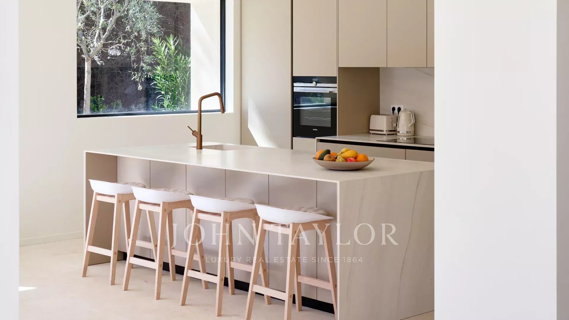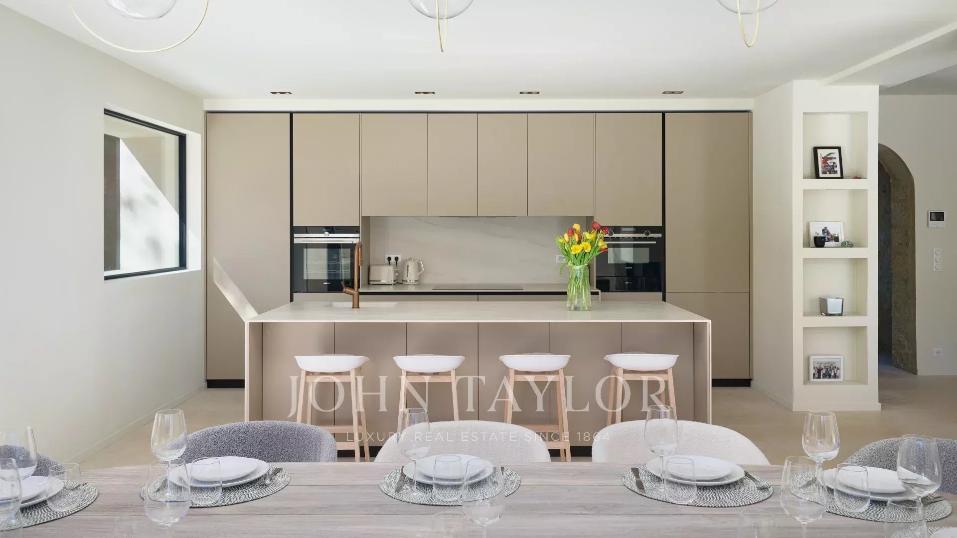- Cozinha totalmente equipada em plano aberto com ilha central e zona de refeições,