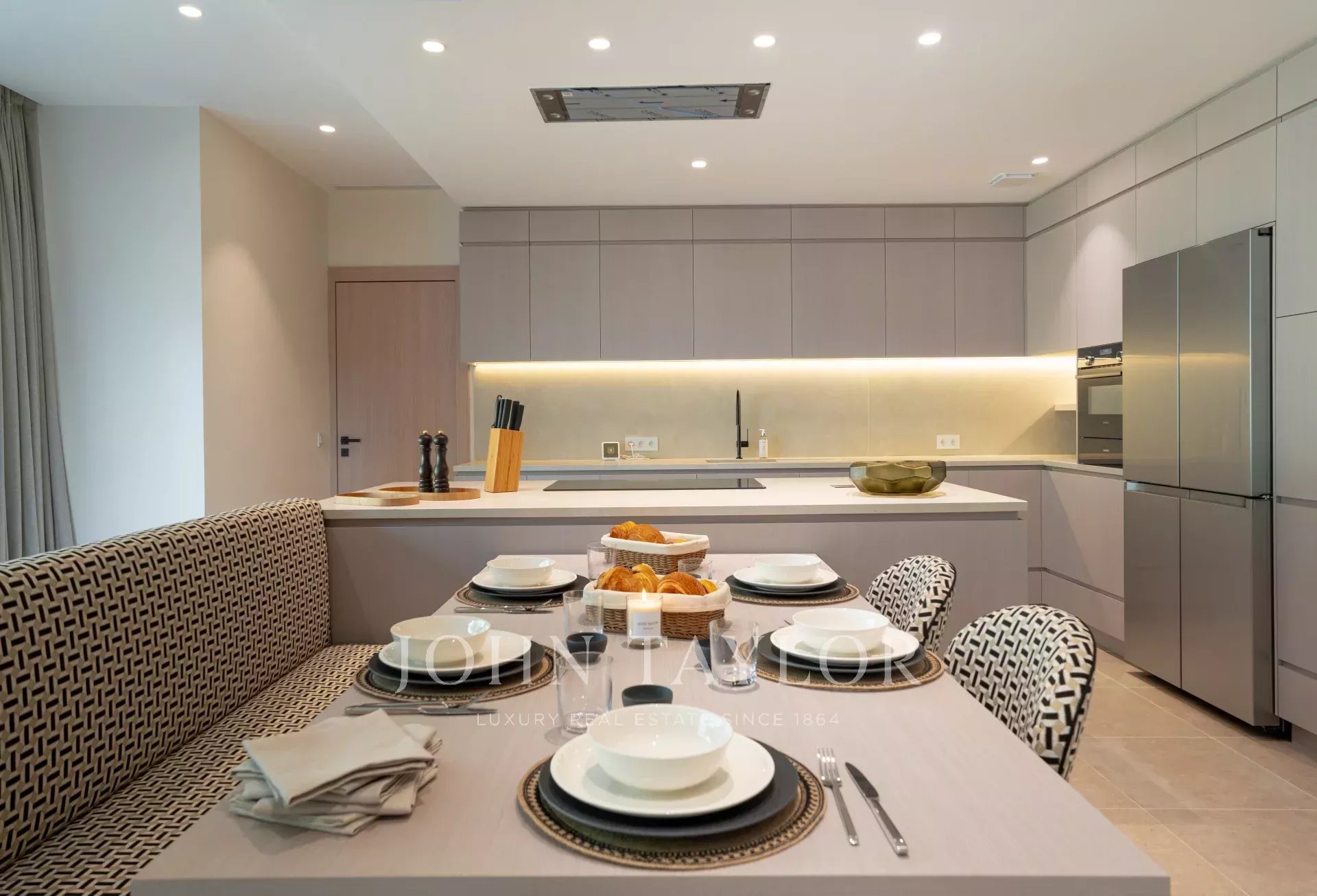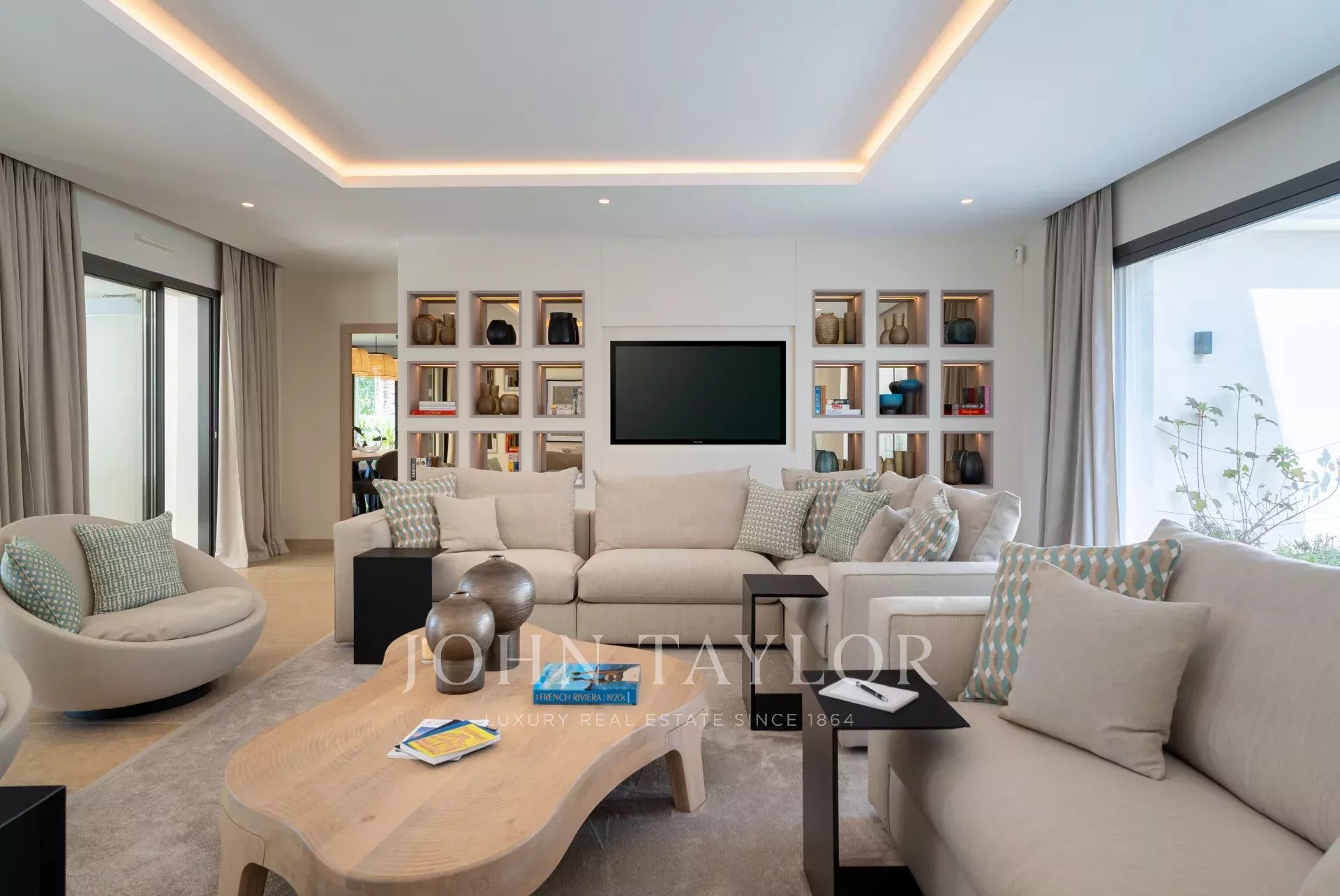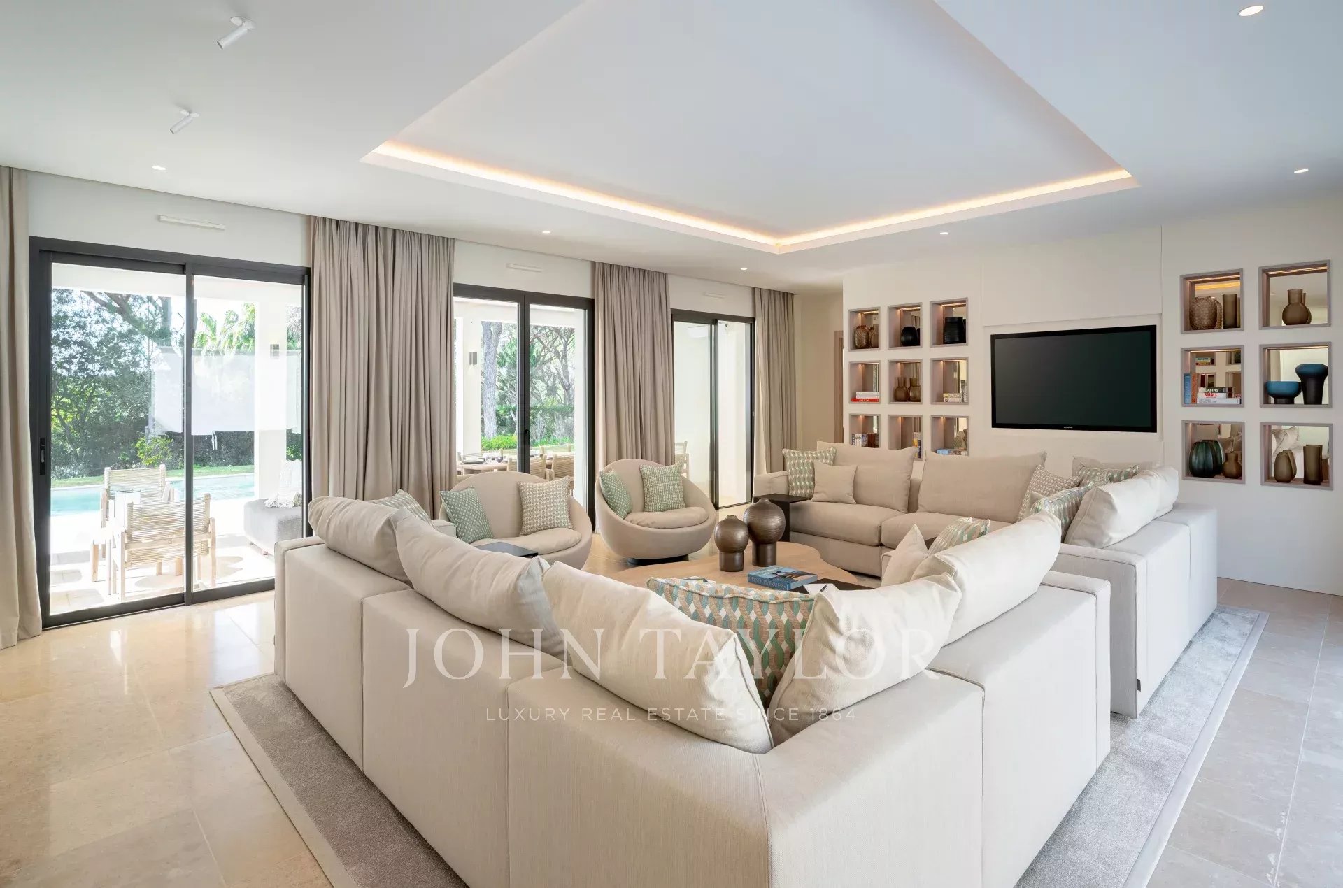 Um grande hall de entrada que dá acesso a três níveis, uma sala de estar que se abre para um pátio e um terraço coberto com vista para a piscina, uma elegante sala de jantar, uma cozinha totalmente equipada com zona de refeições e uma sala de porteiro com uma entrada separada para o pessoal, incluindo uma kitchenette e uma sala de estar.