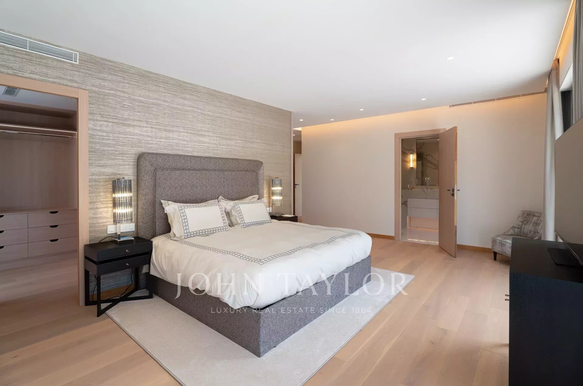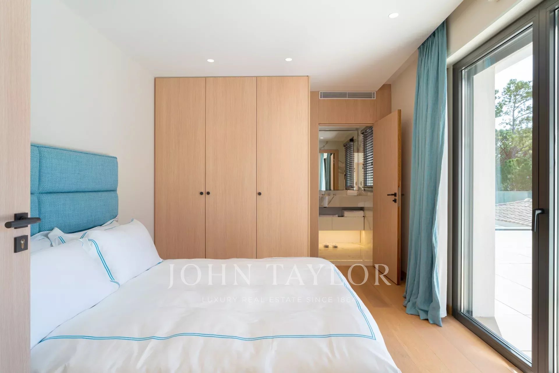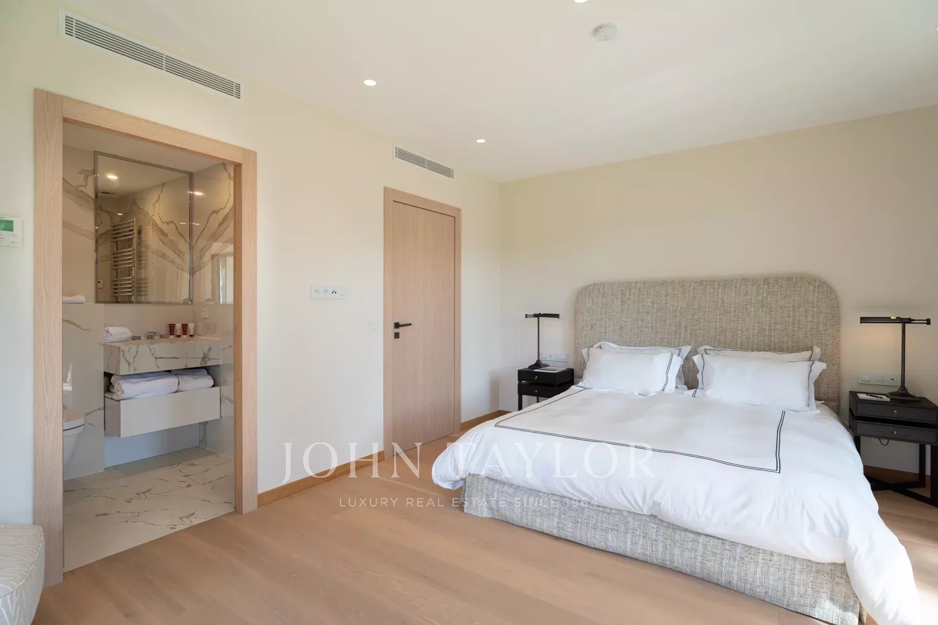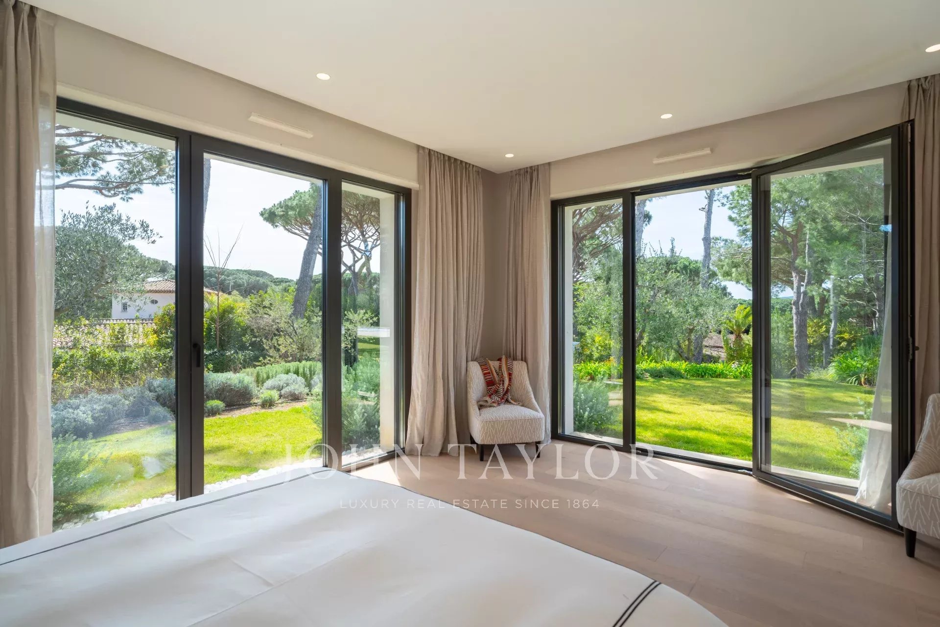 Uma suite principal espaçosa (cama/200), escritório, casa de banho/chuveiro/WC e quarto de vestir, que se abre para terraços privados com vista para o jardim e os seus pinheiros mansos.