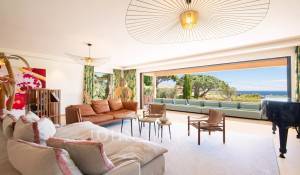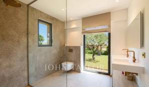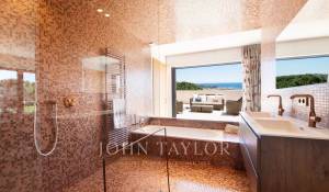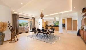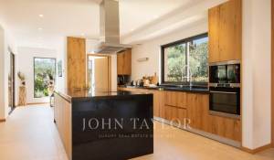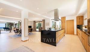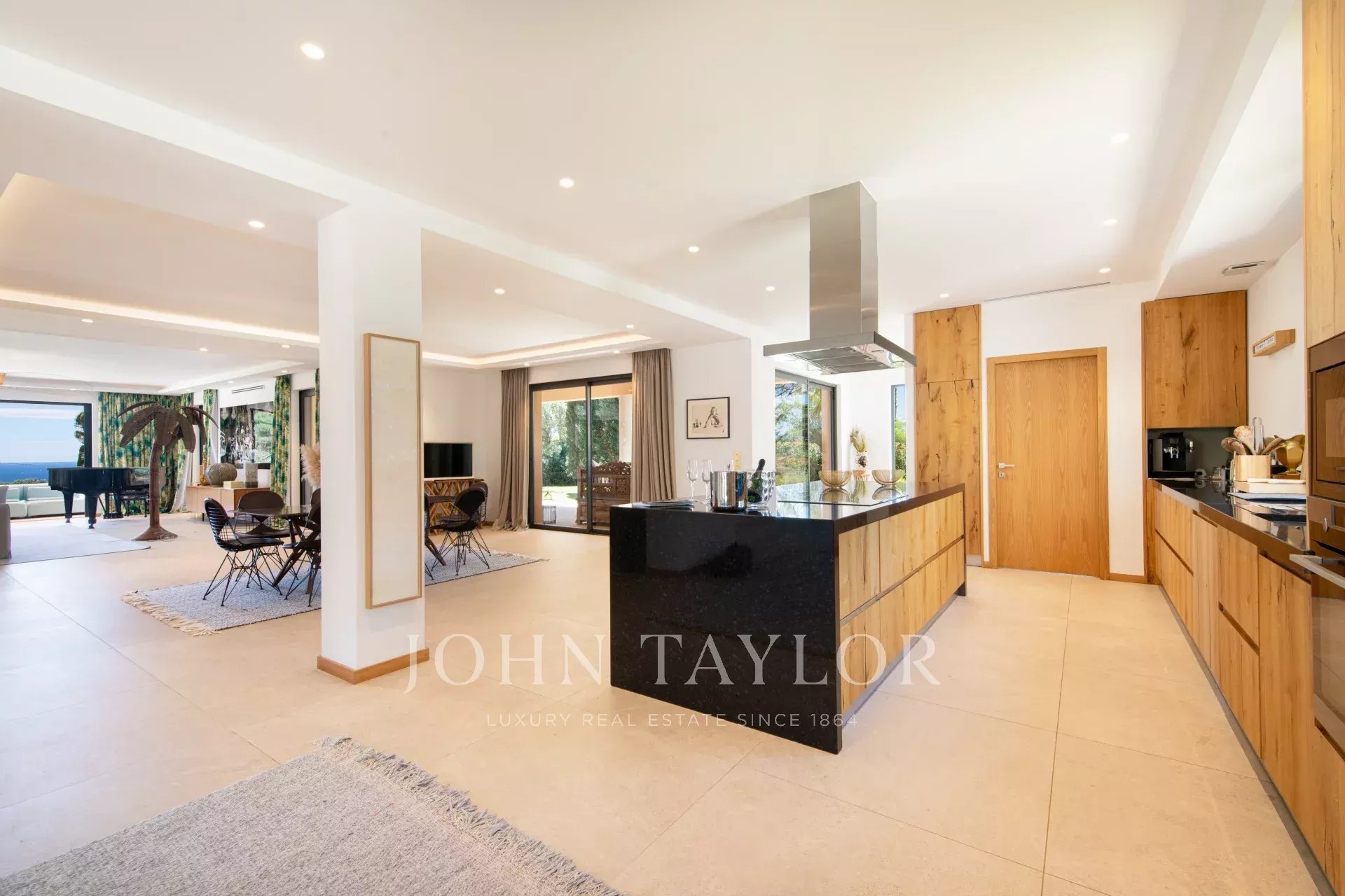 Esta casa moderna abre-se para uma ampla sala de estar, sala de jantar e cozinha totalmente equipada (duas máquinas de lavar louça, dois frigoríficos, forno, micro-ondas, placa de indução, congelador e todos os utensílios de cozinha). Com grandes janelas que se abrem completamente, a sala de estar oferece vistas deslumbrantes sobre o jardim e o Mediterrâneo.