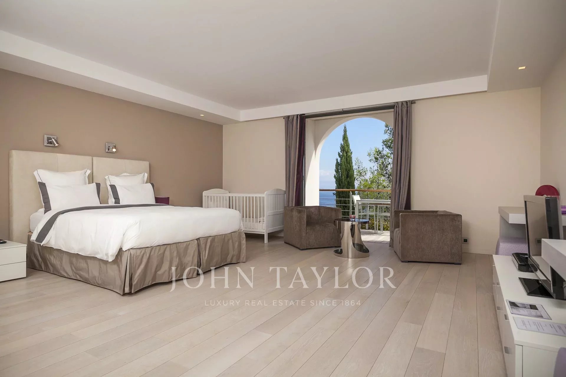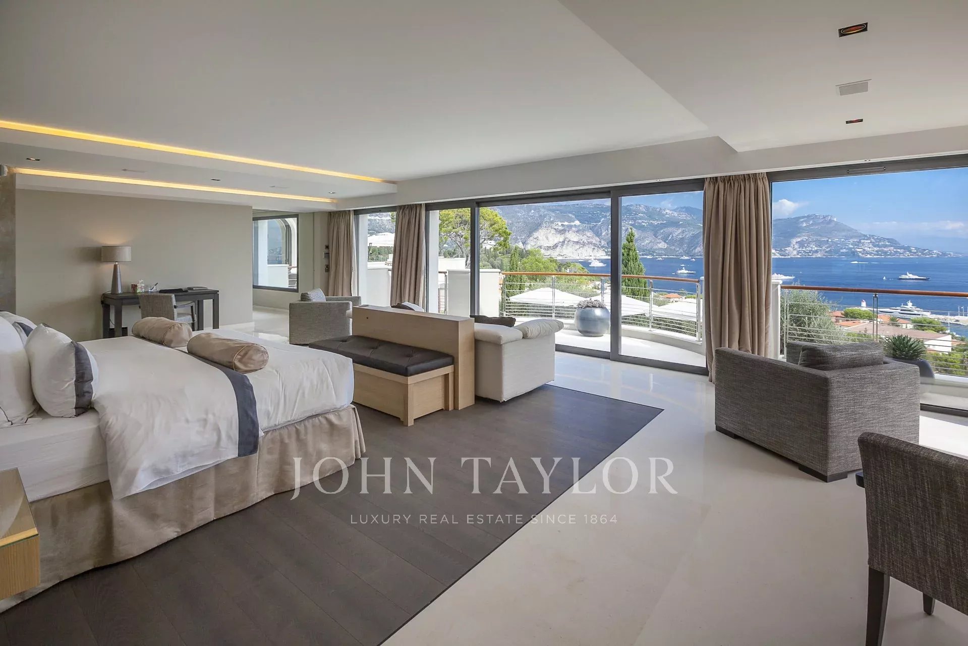 Um grande quarto principal com 2 casas de banho privativas com vista para o porto de St Jean Cap Ferrat e para a piscina exterior. Zona de televisão com sistema áudio/vídeo.