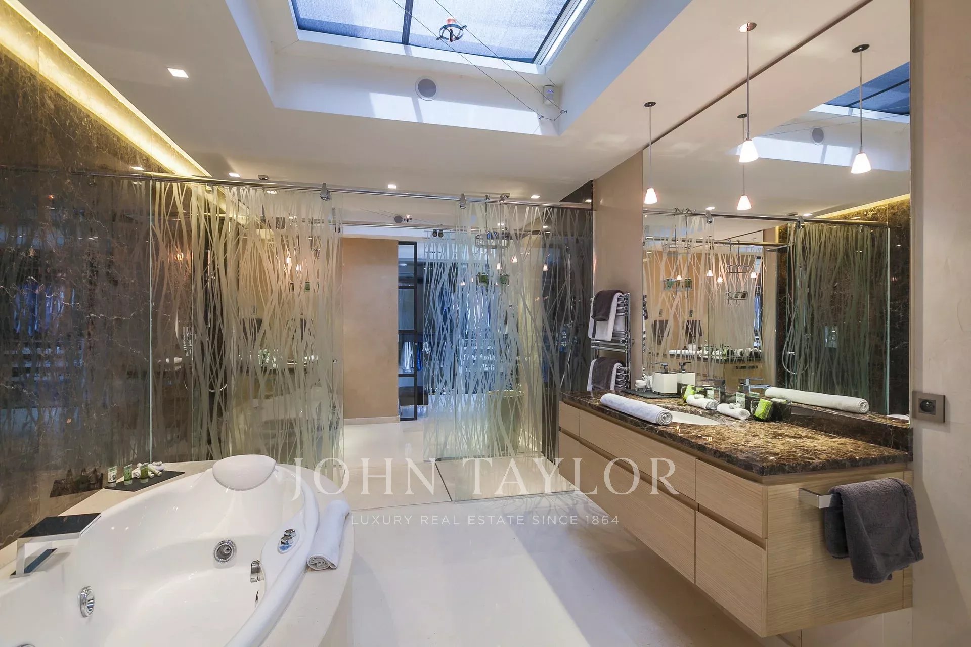 Quarto principal com terraço privado e vista para o mar, dois quartos de vestir e duas casas de banho. Banheira com função de massagem.
