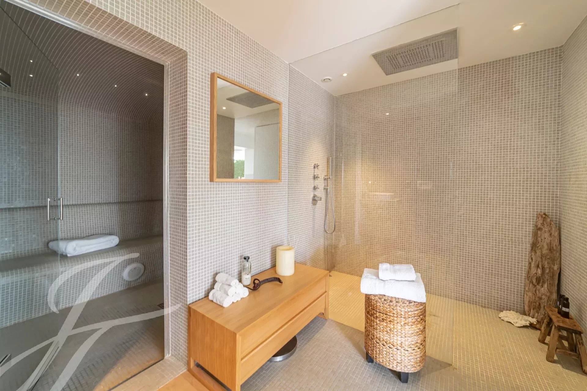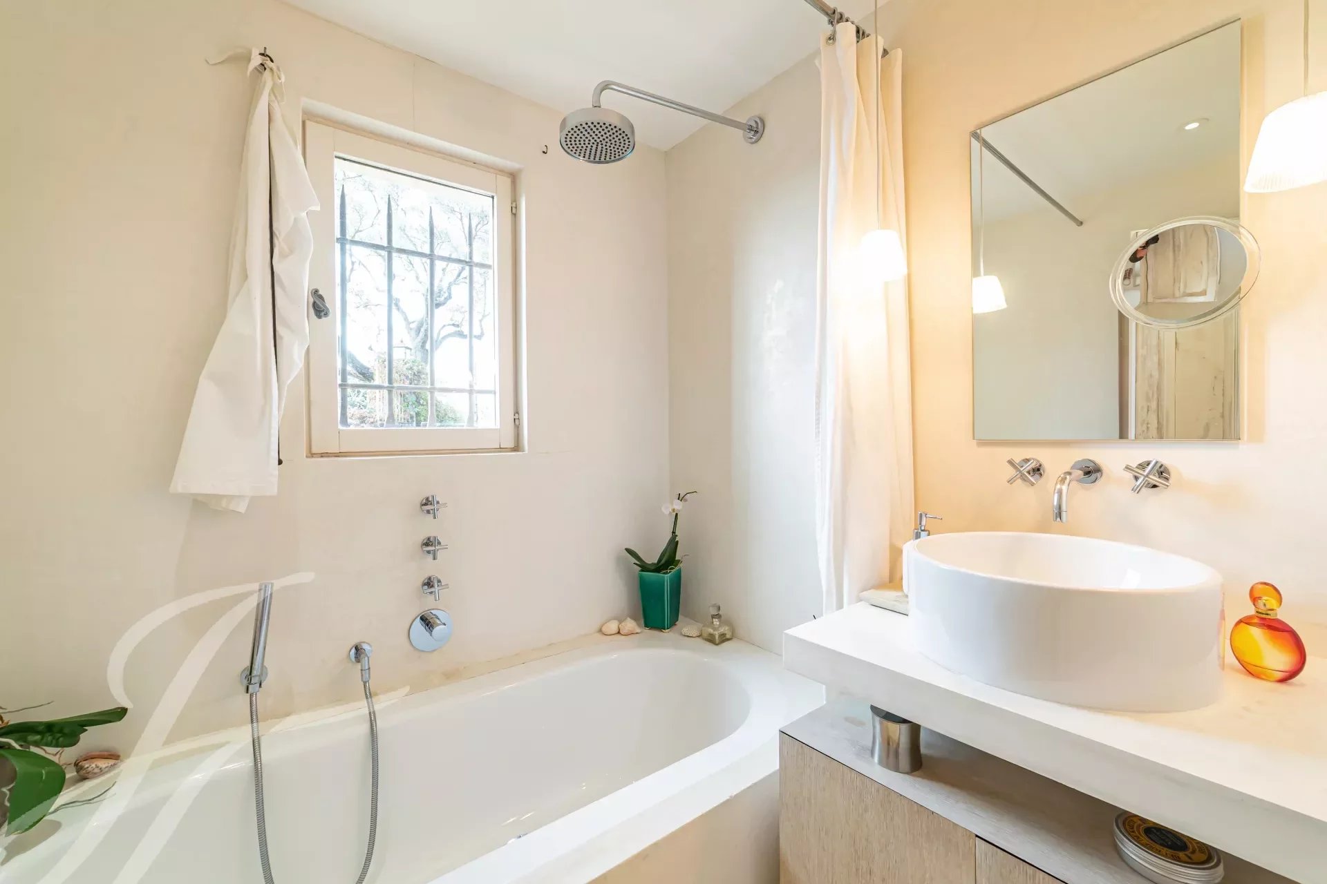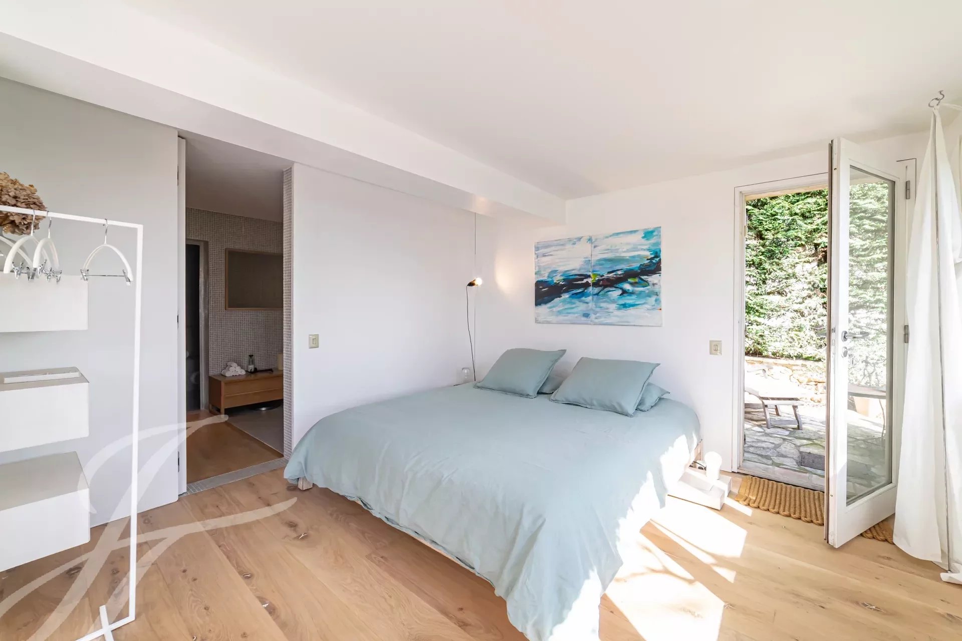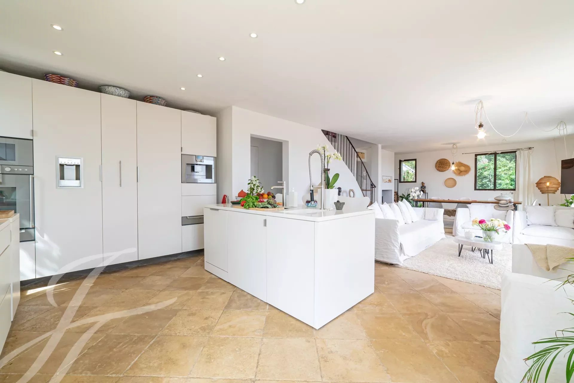 No exterior, o jardim paisagístico apresenta várias zonas de relaxamento: uma zona de piscina, um terraço sombreado por um bonito dossel e uma zona de aperitivos, todos com vista para um panorama excecional. Uma churrasqueira completa a disposição, permitindo-lhe desfrutar ao máximo das refeições ao ar livre.