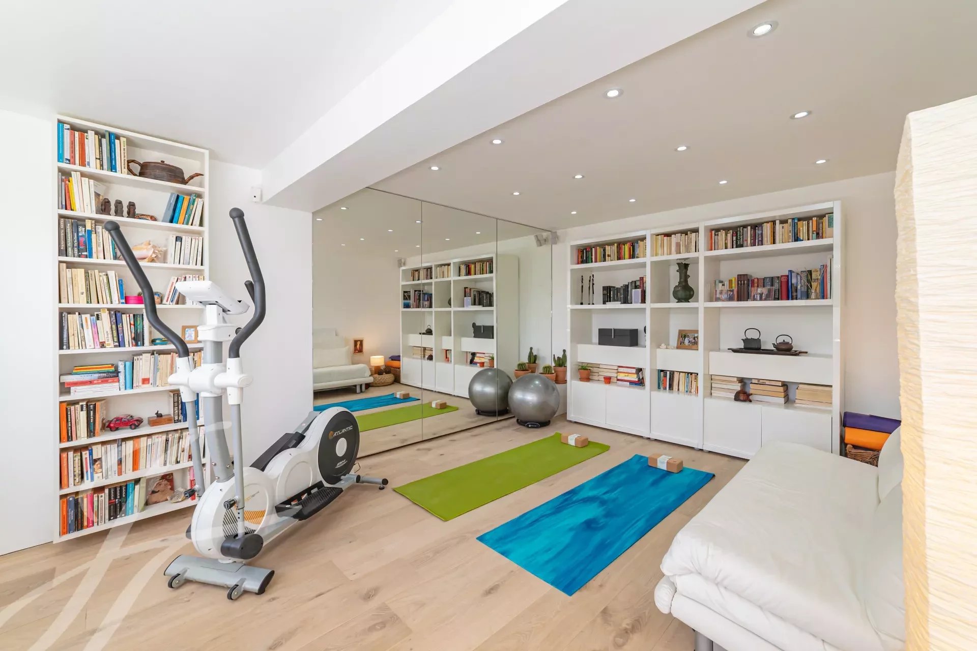 - Sala de ioga com parede espelhada, tapetes e blocos de ioga, cross trainer ou stepper, etc.