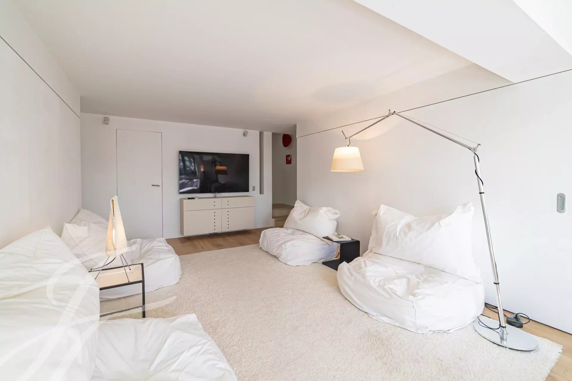 - Sala de estar grande e luminosa com lareira e área de leitura acolhedora. A cozinha e a sala de estar em plano aberto abrem-se para um terraço com vista para o mar.