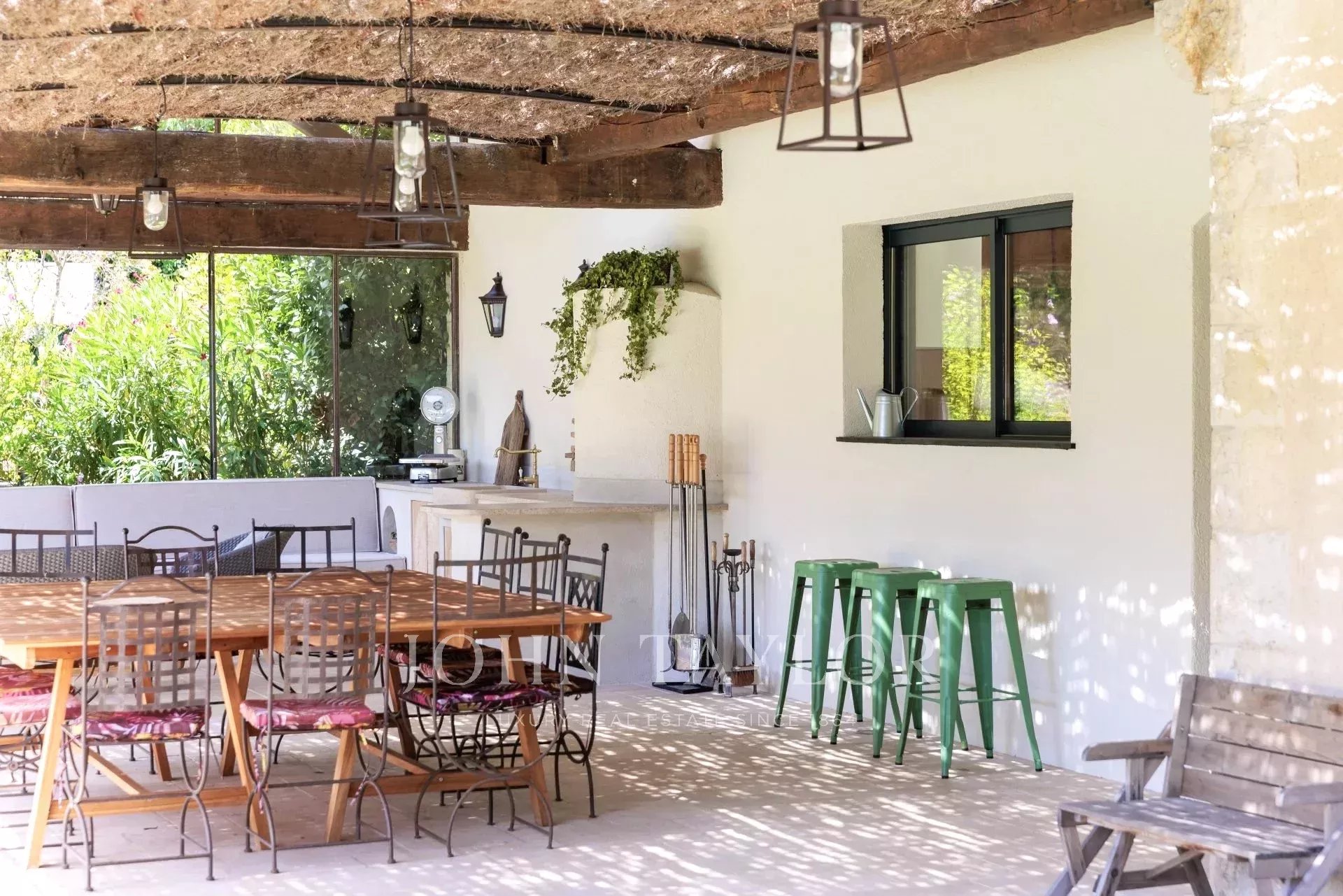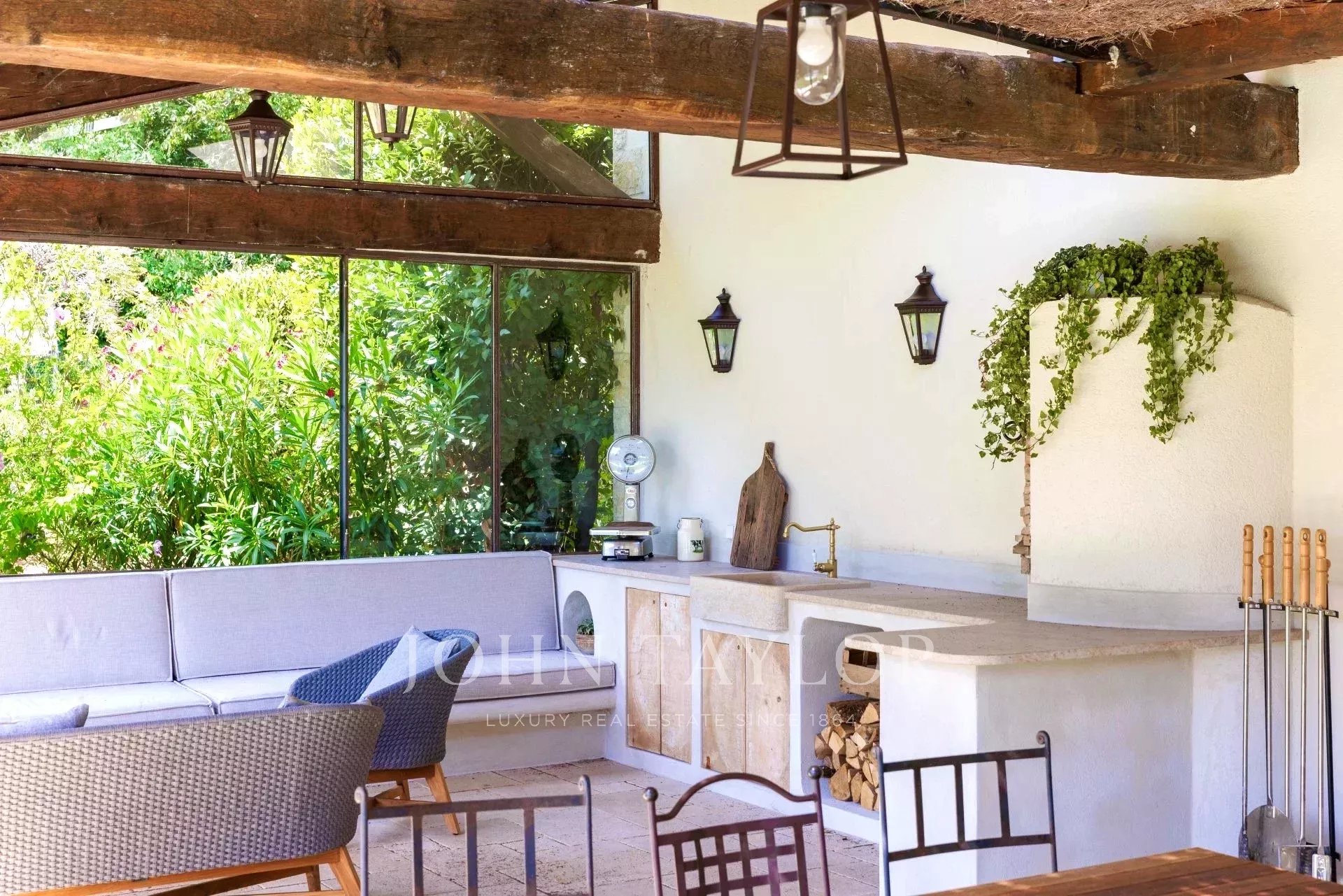 No rés do chão, encontrará um grande terraço com uma cozinha exterior totalmente equipada. Uma grande mesa convida-o a partilhar as suas refeições à sombra da pérgola, enquanto desfruta da vista relaxante da floresta.
