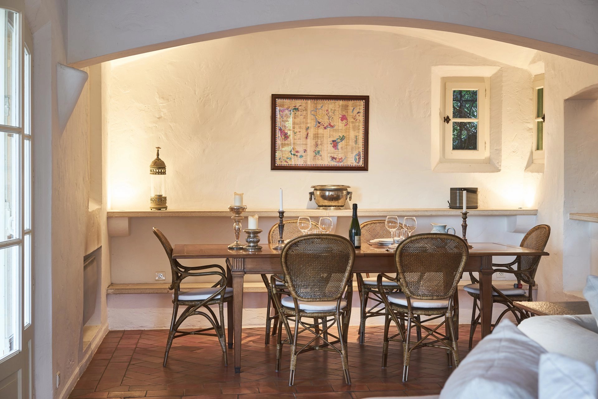 A casa principal tem dois quartos: uma suite principal no primeiro andar, com cama king-size, casa de banho com duche e banheira, e solário privado; e um quarto de hóspedes, acessível subindo alguns degraus, com casa de banho privativa e acesso direto à piscina.