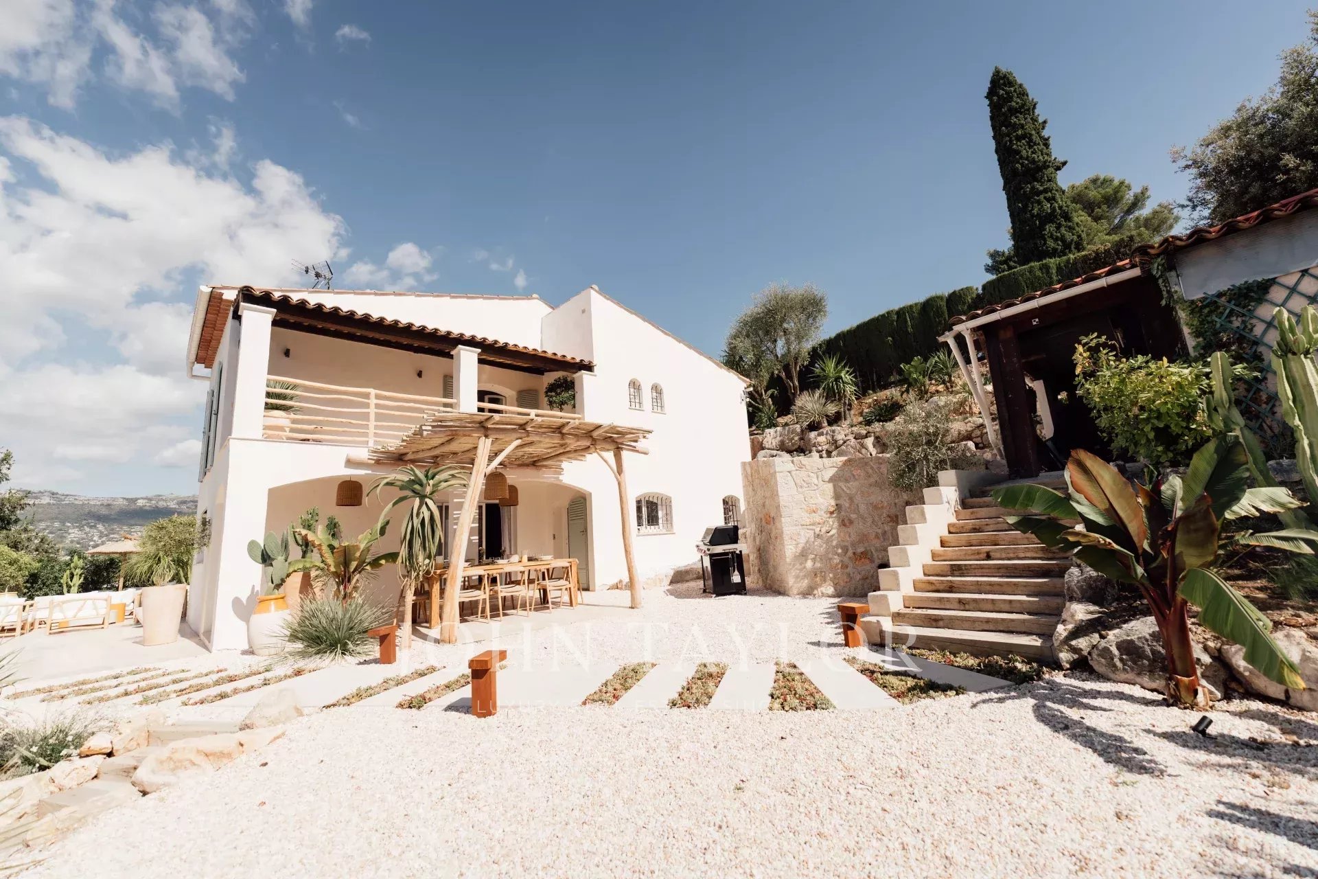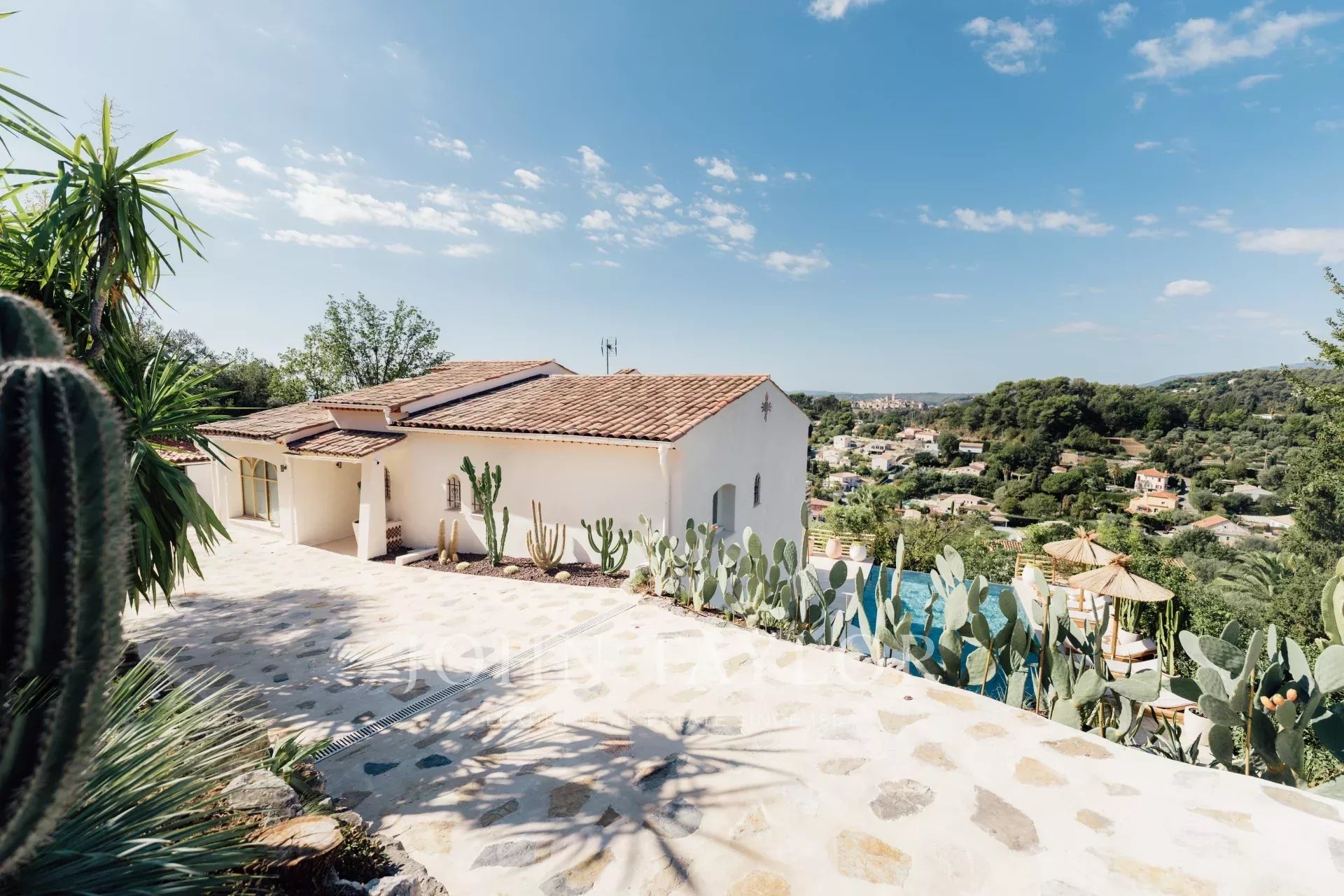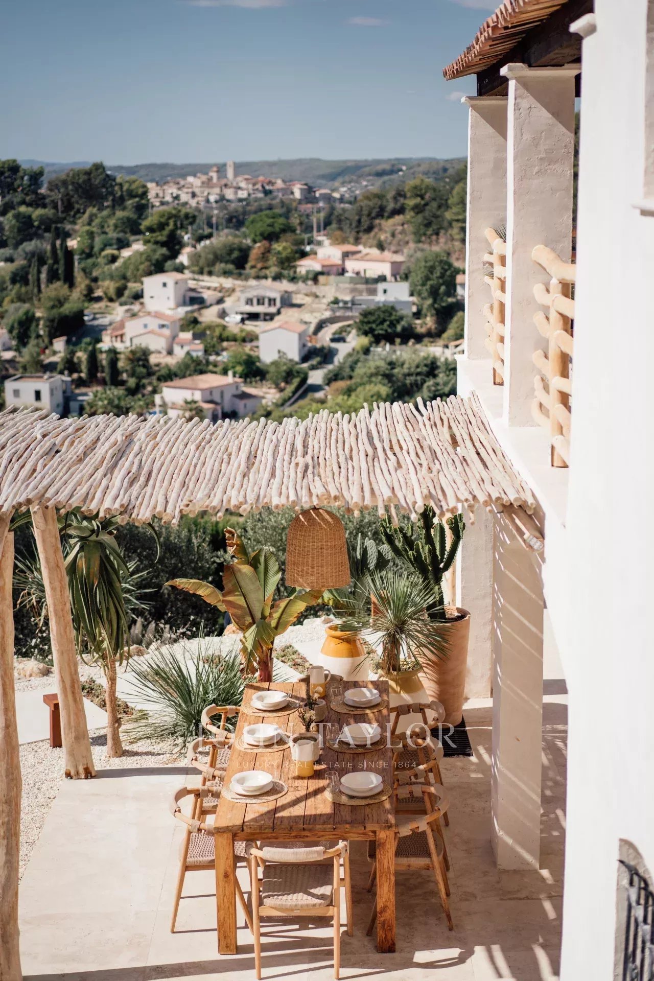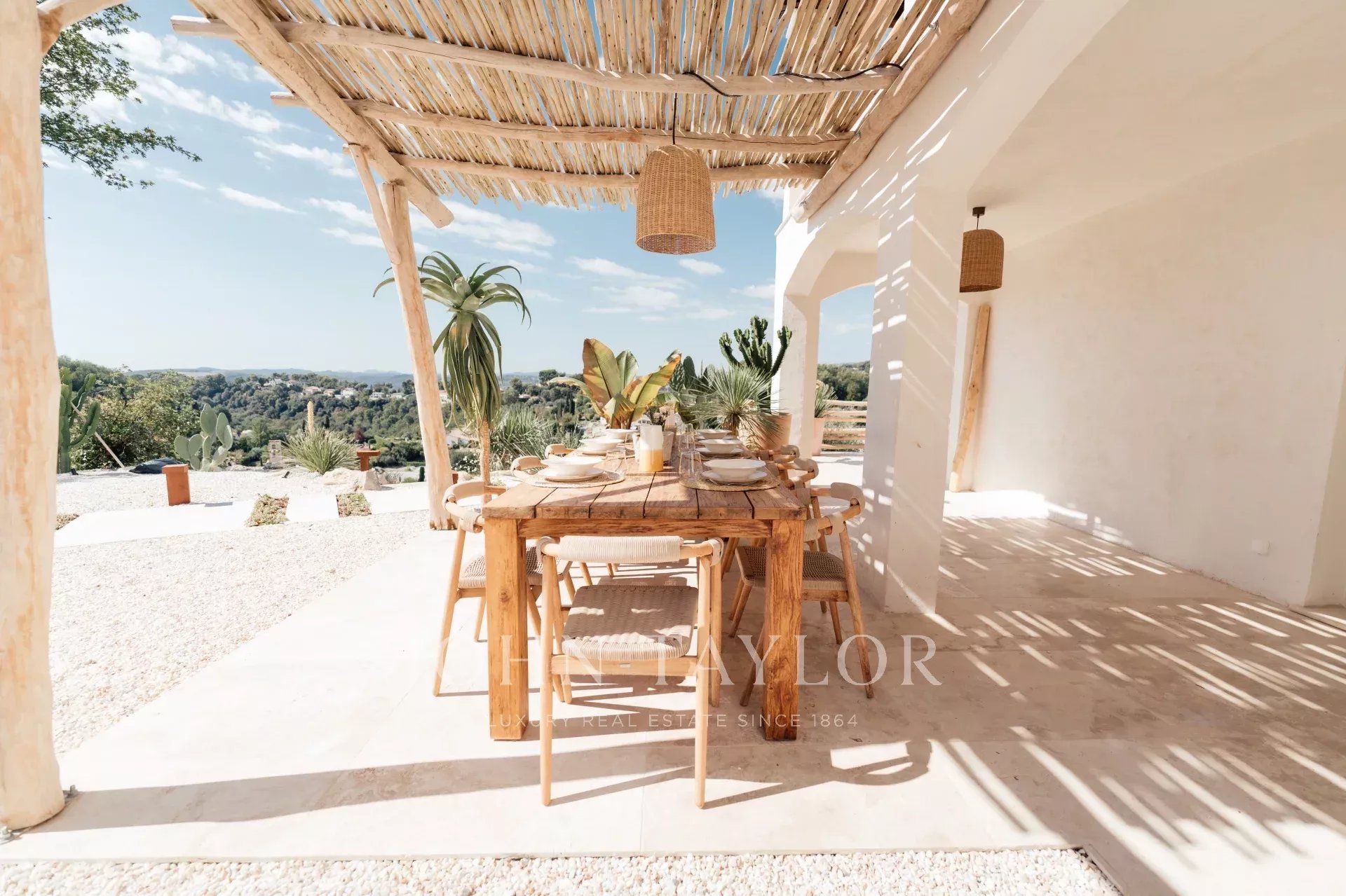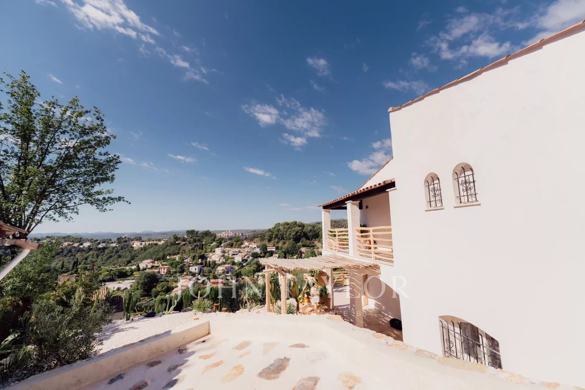 Do terraço, pode-se admirar uma vista de cartão postal da aldeia de Saint Paul de Vence, do mar e das montanhas.