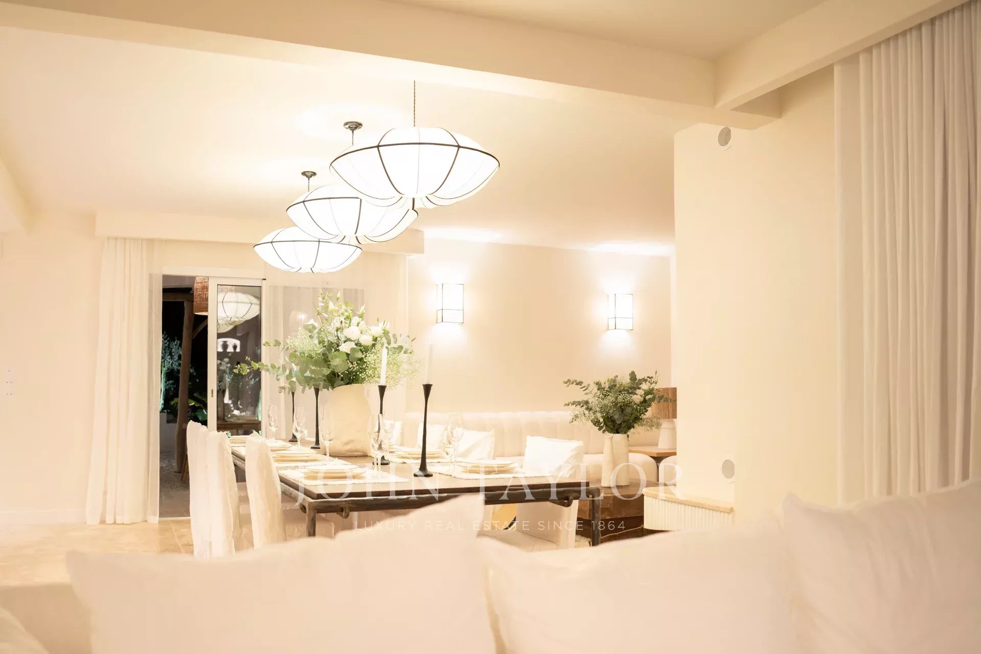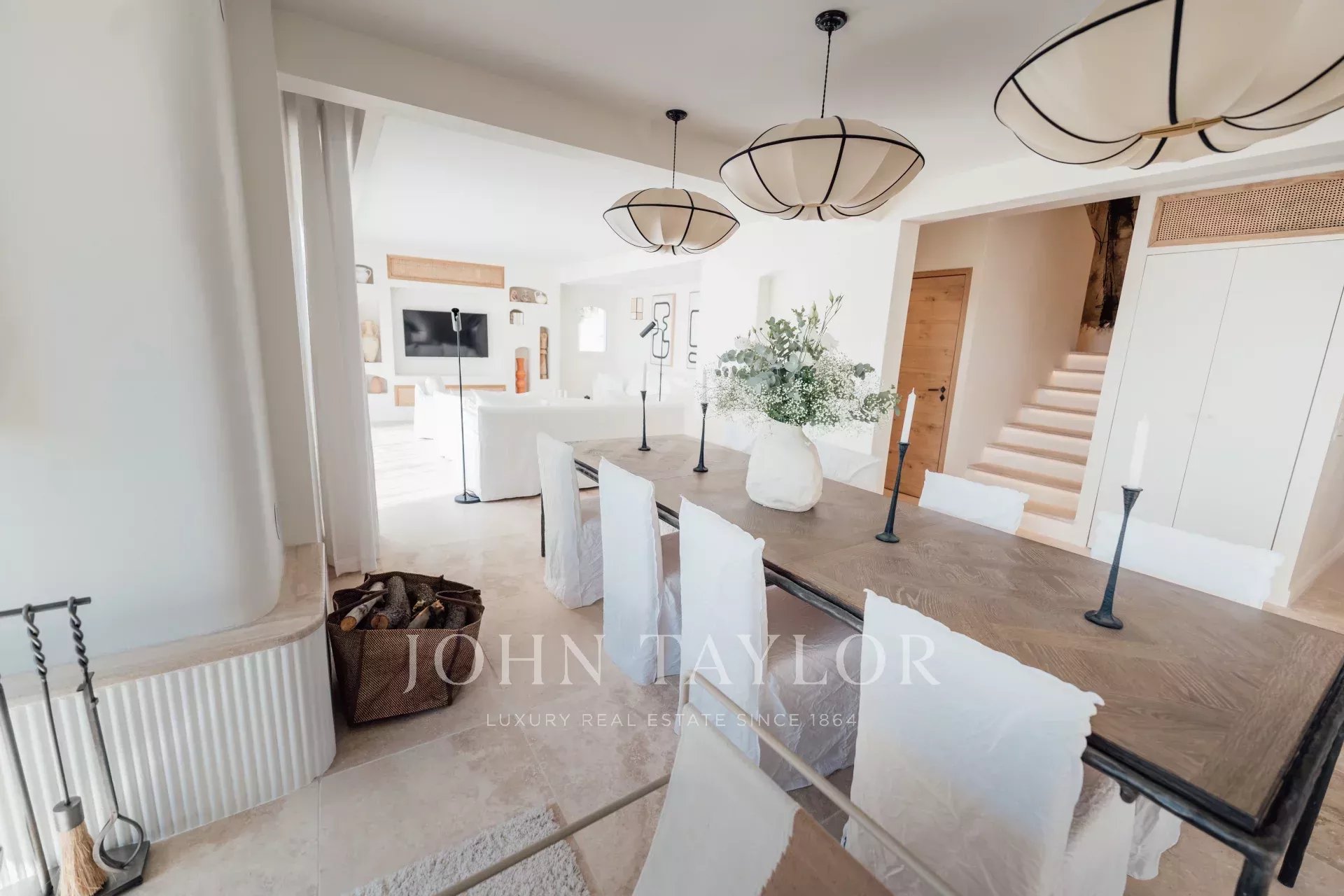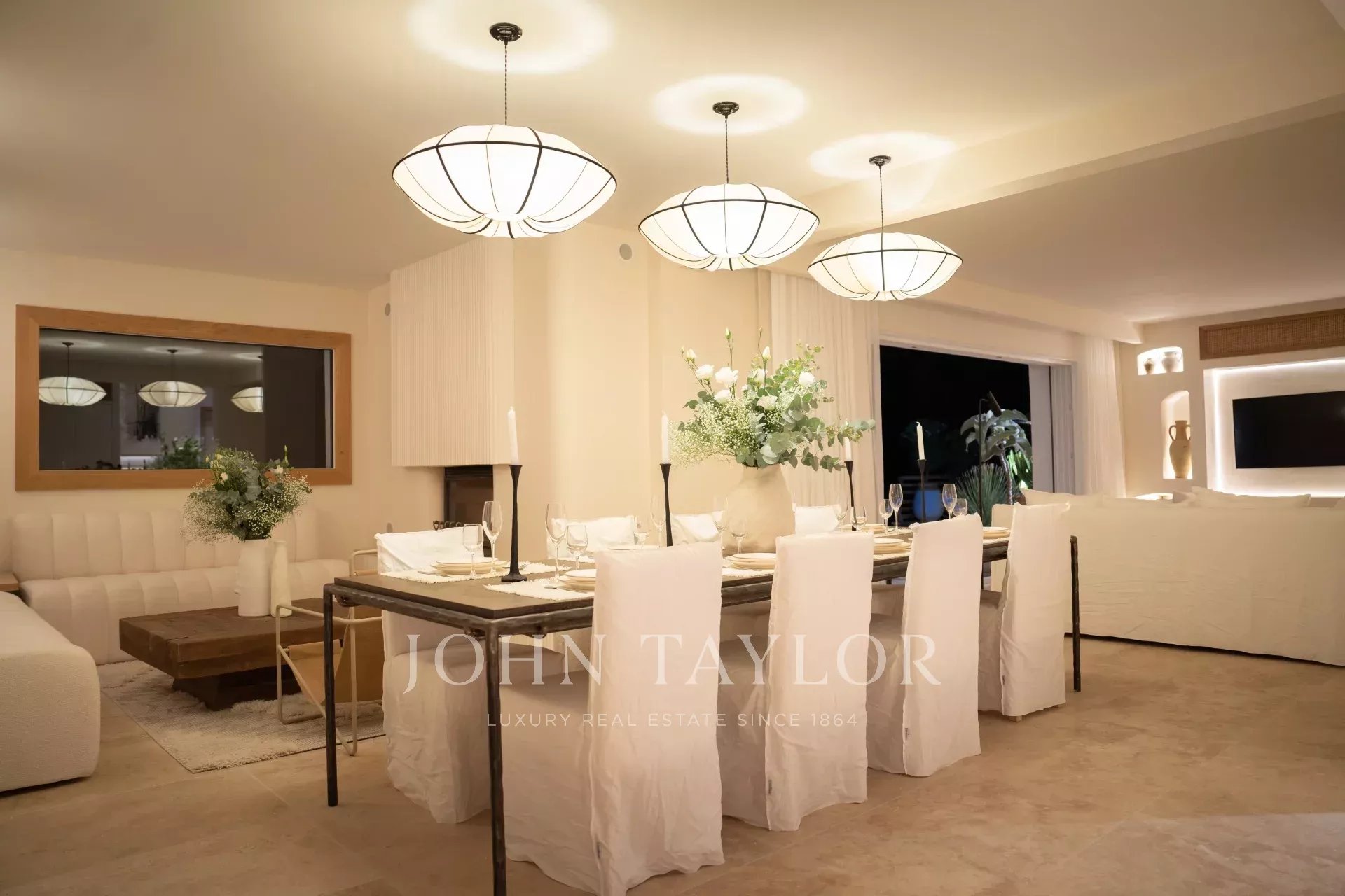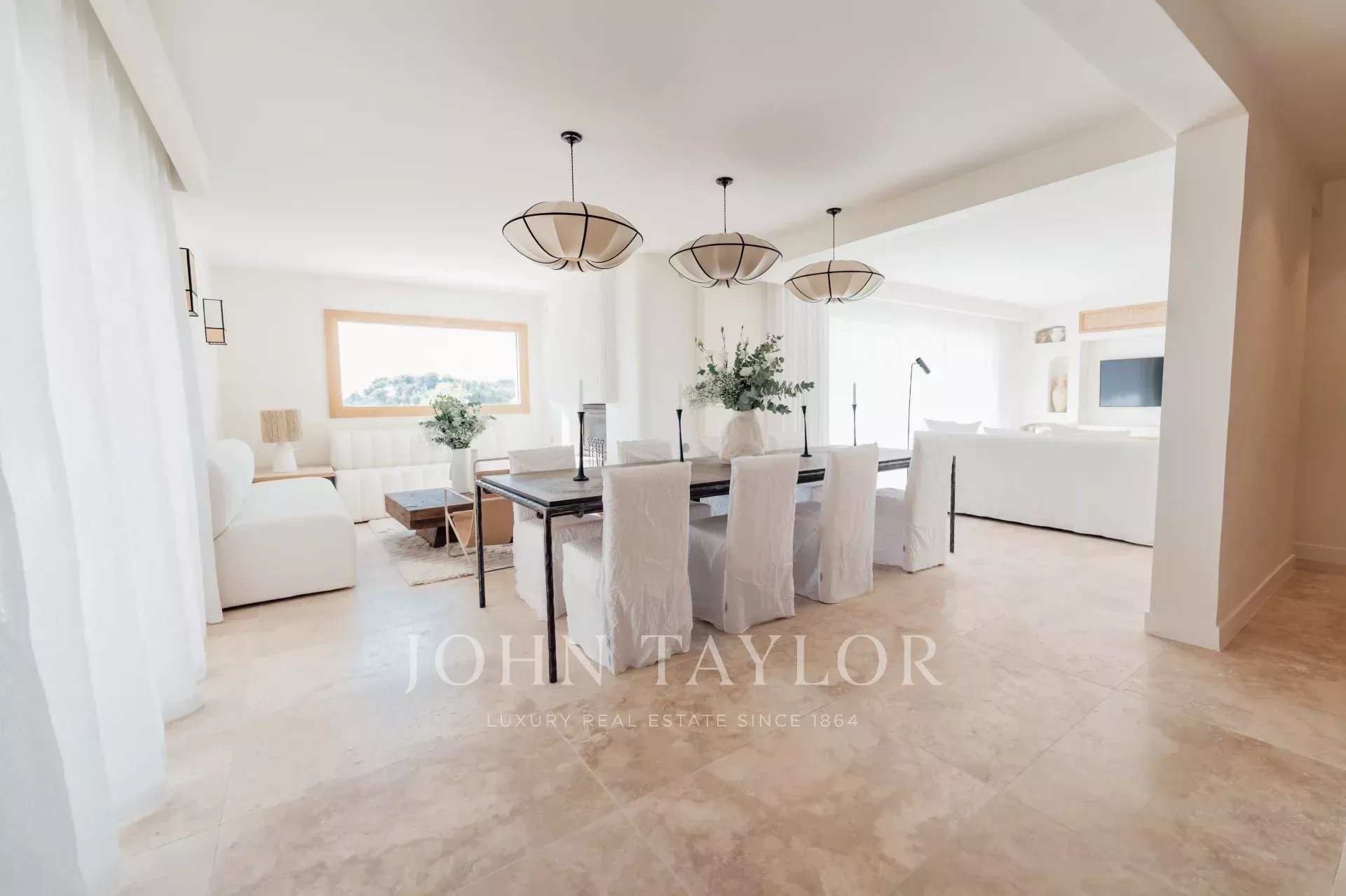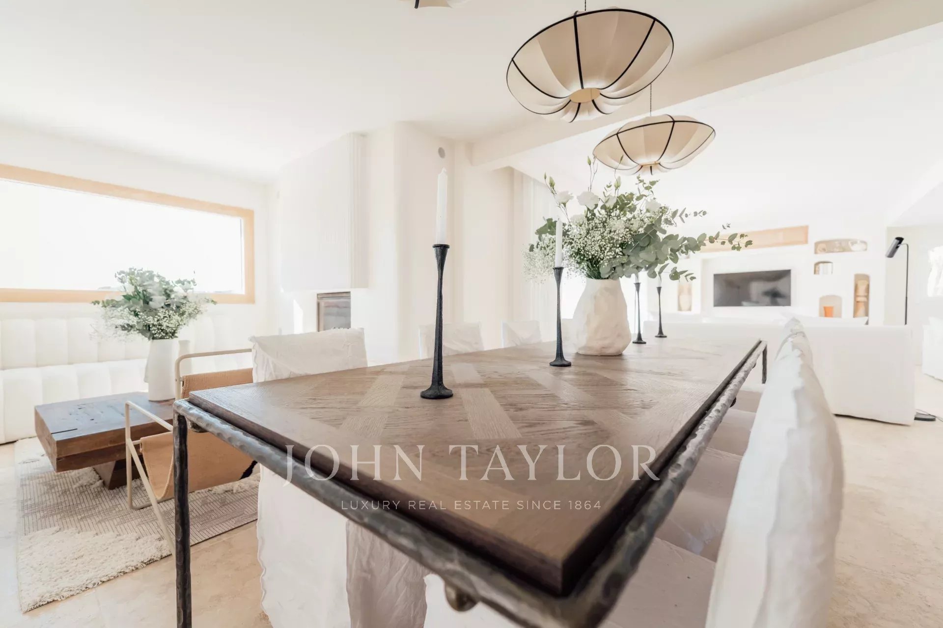 Há também uma grande cozinha em plano aberto, totalmente equipada, uma magnífica mesa de jantar e 2 salas de estar com sofás Roche Bobois.