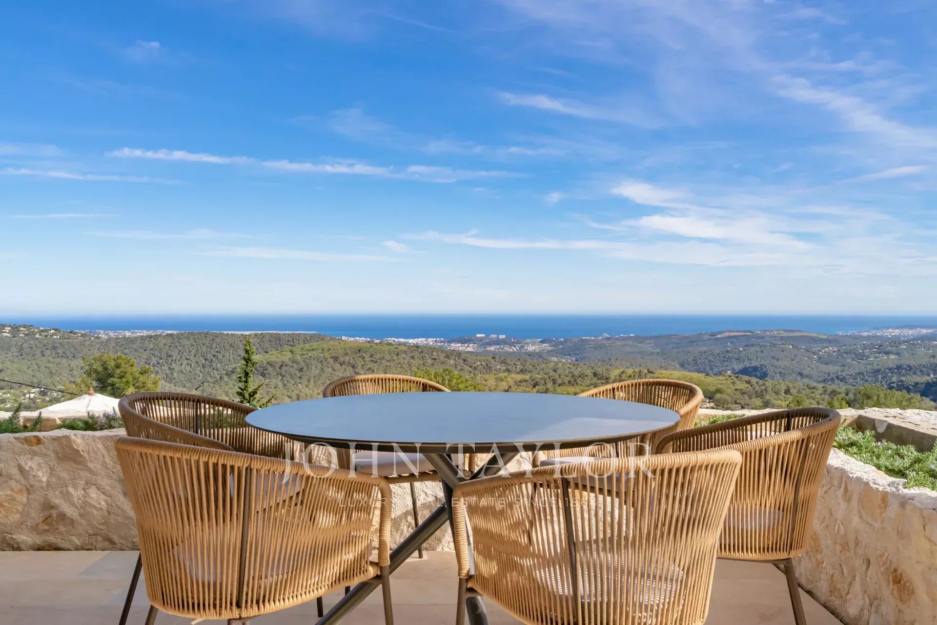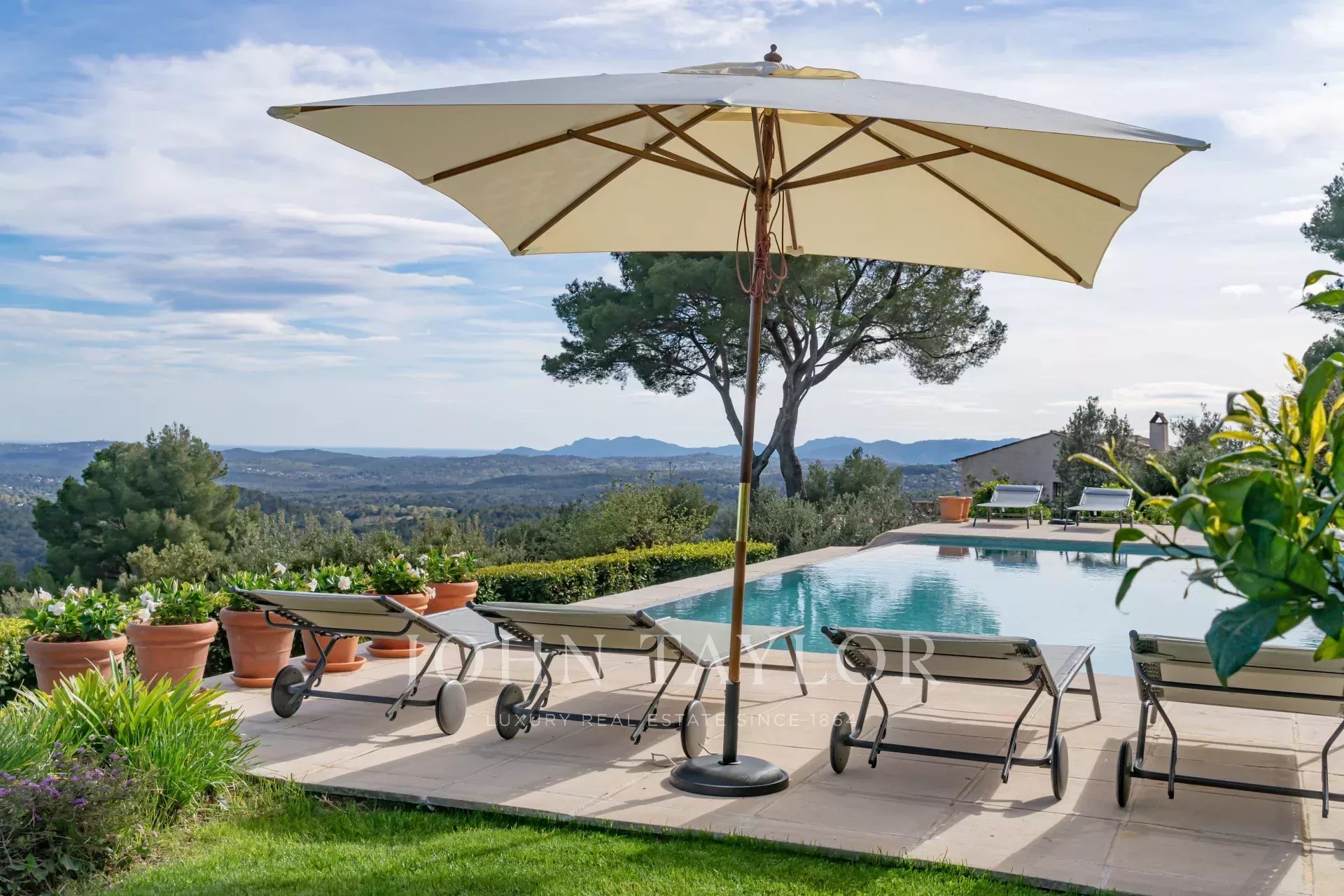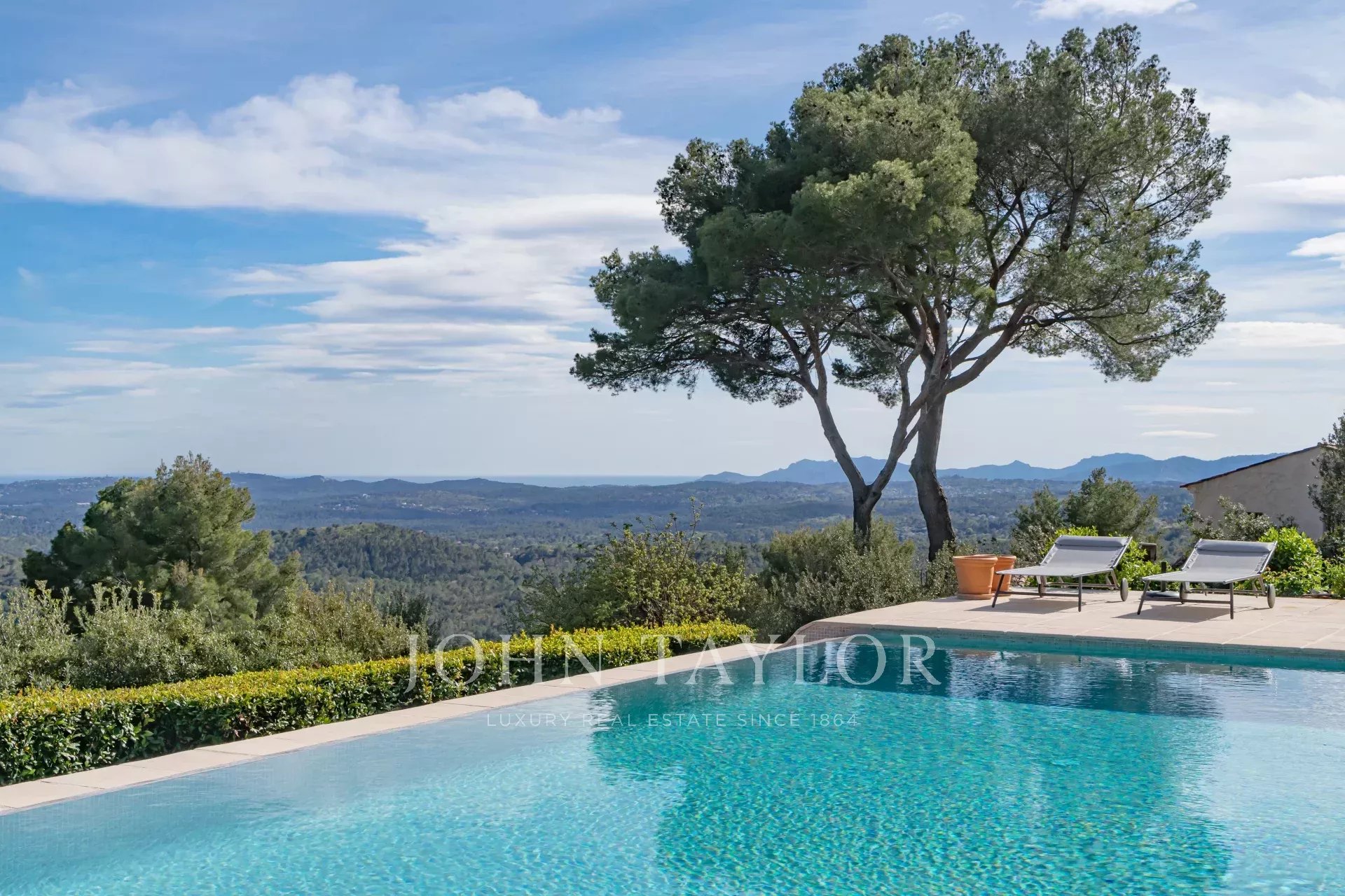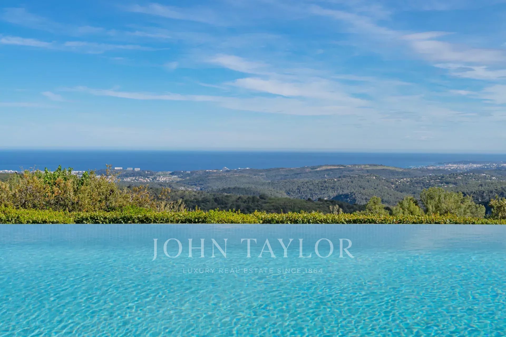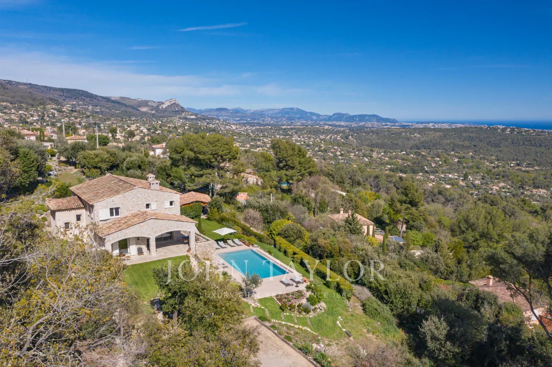 Em Tourrettes sur Loup, com vistas magníficas sobre o mar e a paisagem circundante, uma bela propriedade recentemente construída com 320 m² de área habitacional em 4.000 m² de terreno com piscina infinita.