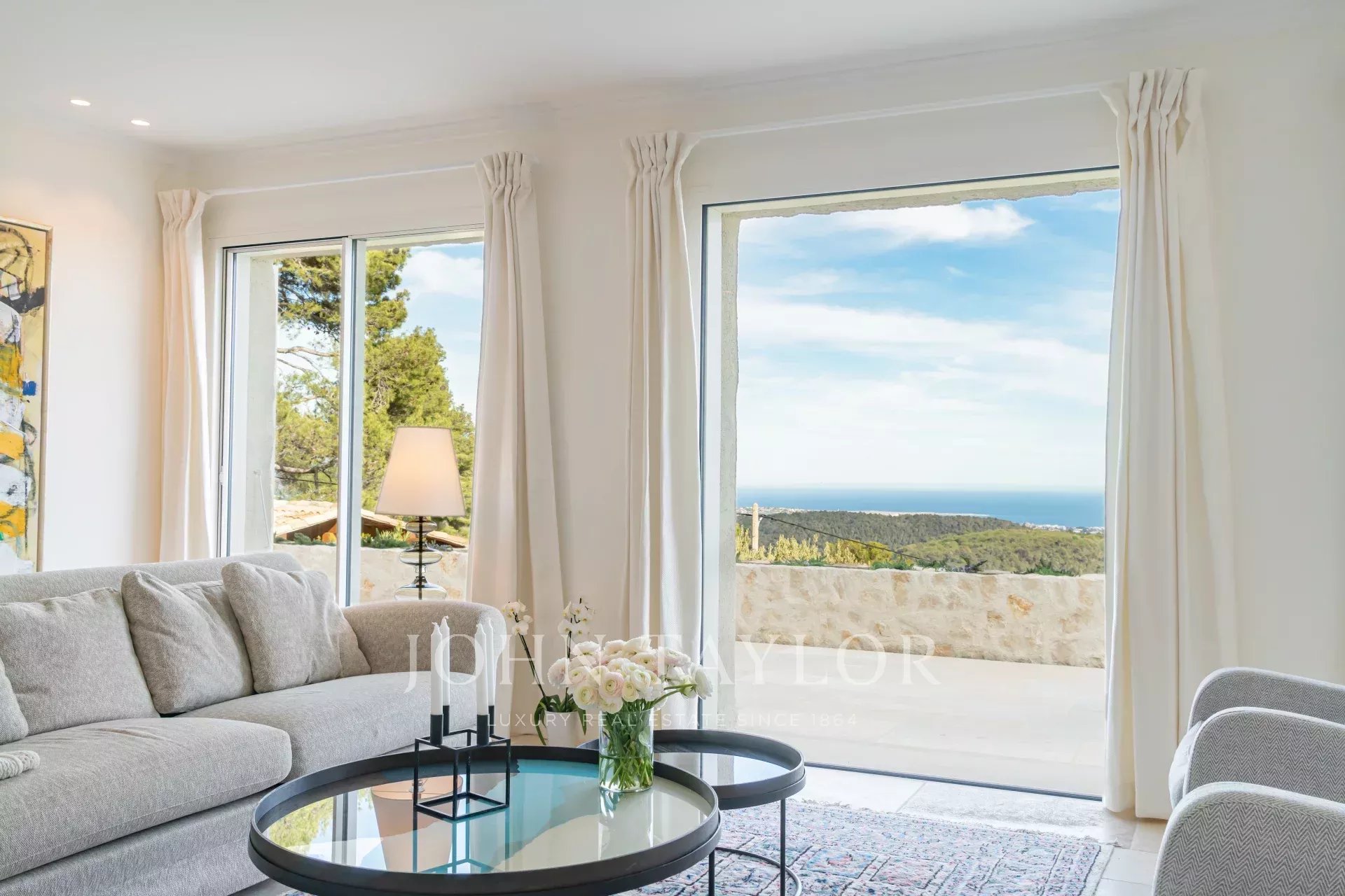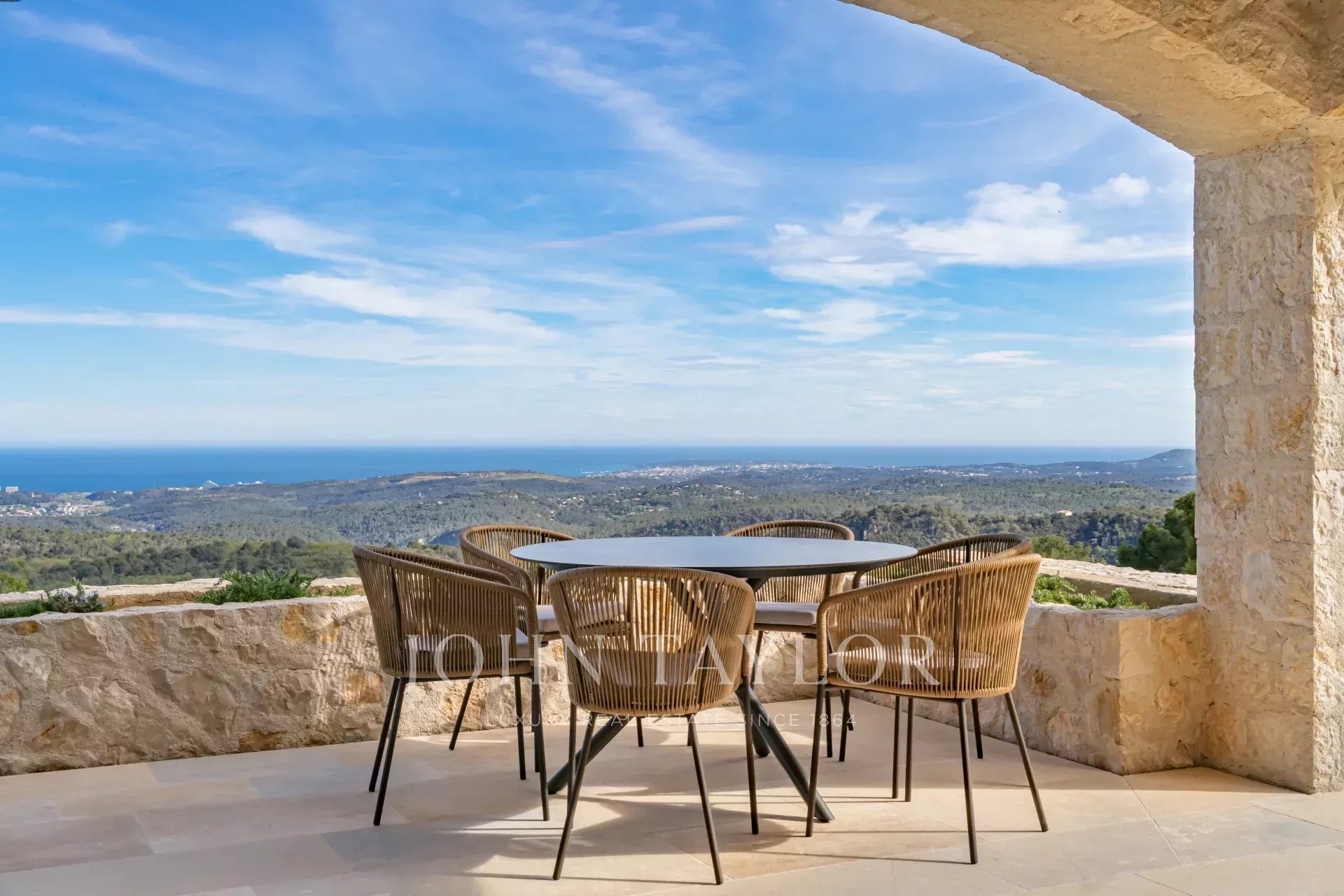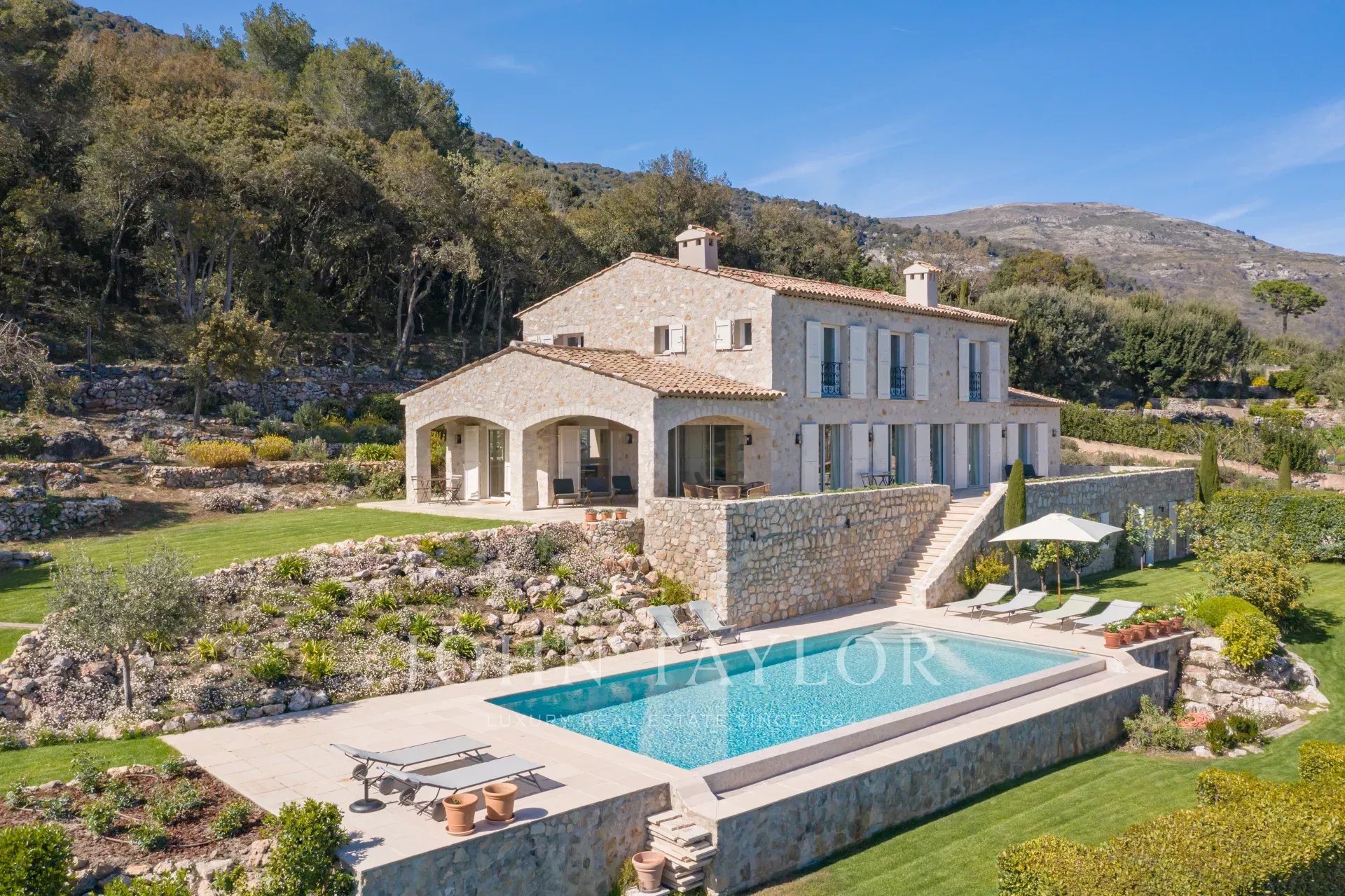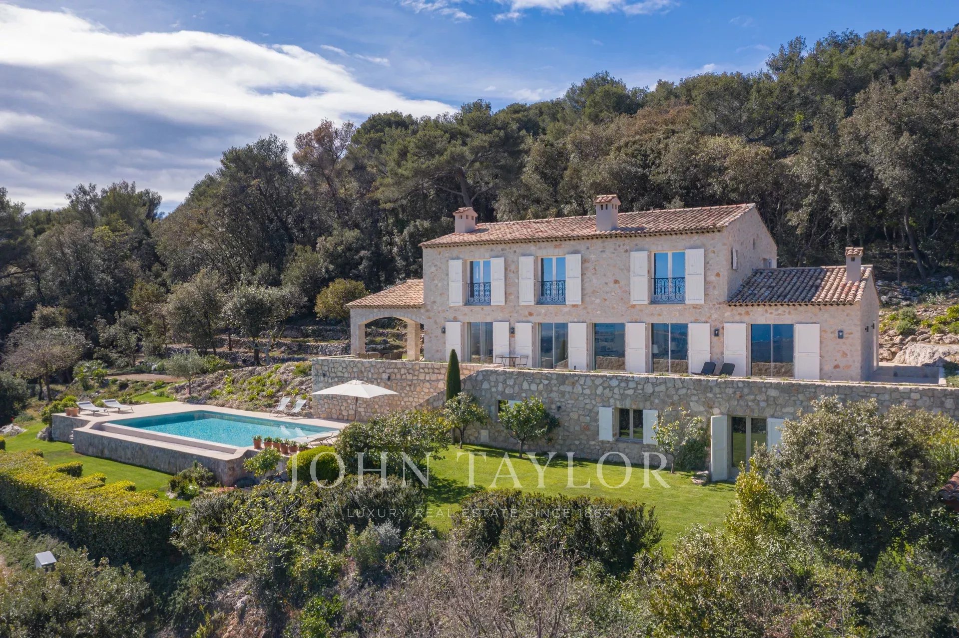Em Tourrettes sur Loup, com vistas magníficas sobre o mar e a paisagem circundante, uma bela propriedade recentemente construída com 320 m² de área habitacional em 4.000 m² de terreno com piscina infinita.