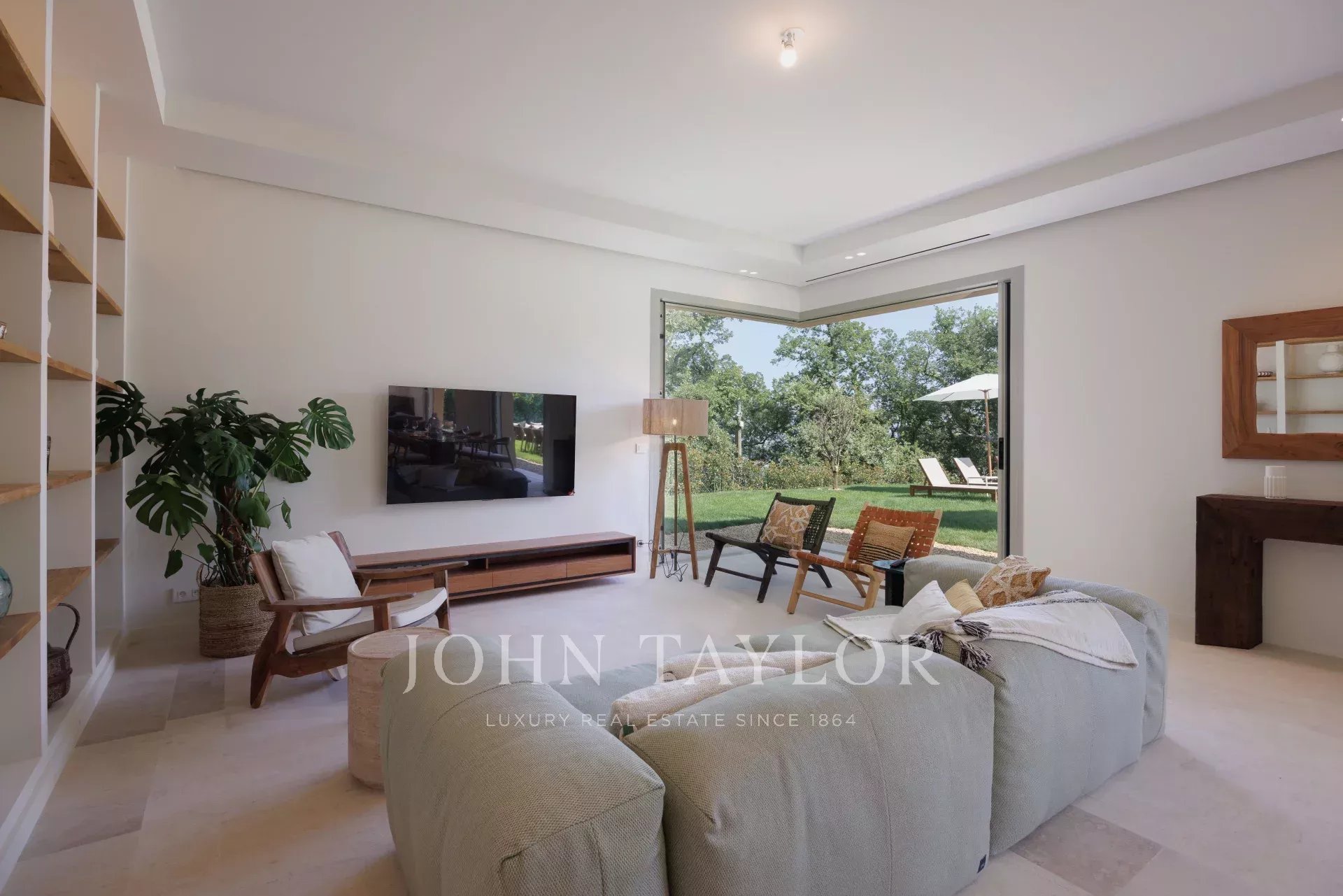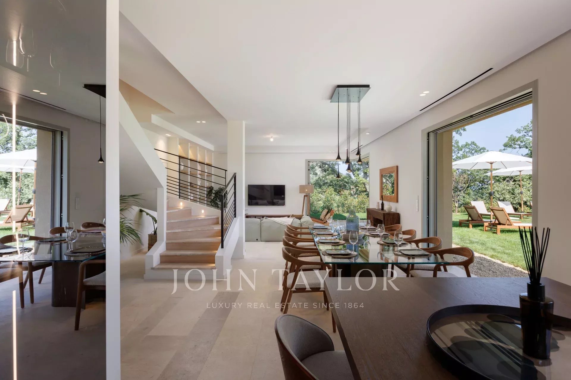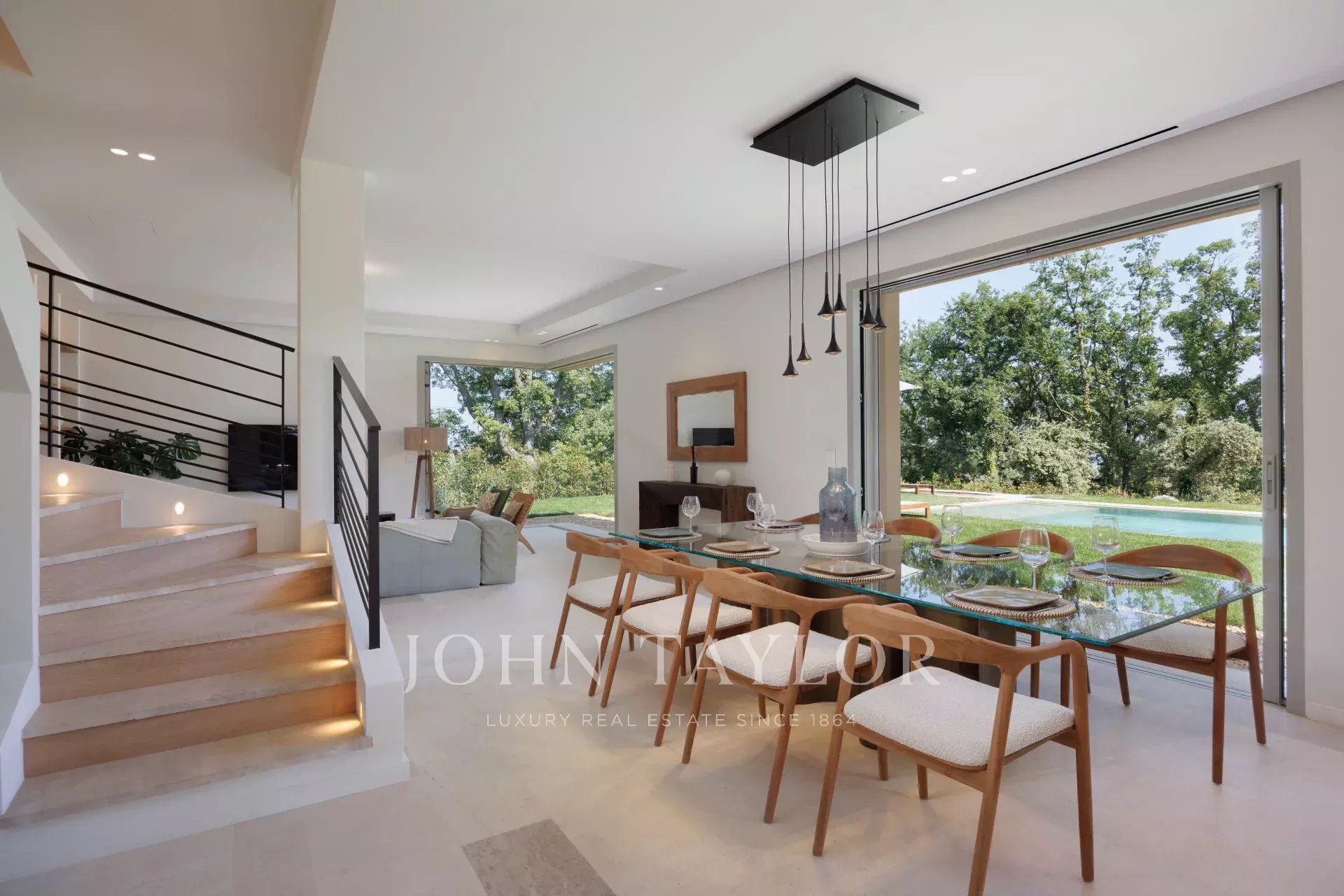A casa é banhada em luz graças às grandes portas de vidro deslizantes, que se abrem para uma vasta sala de estar estendida por um terraço ensolarado e um jardim plano com piscina.