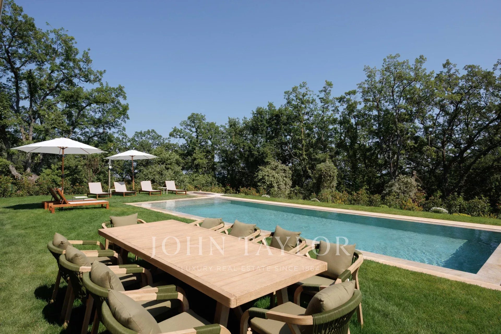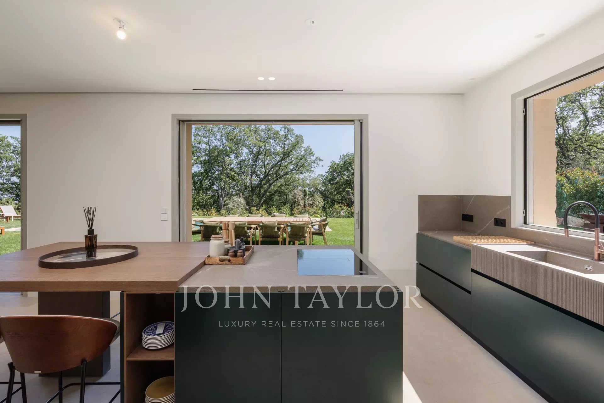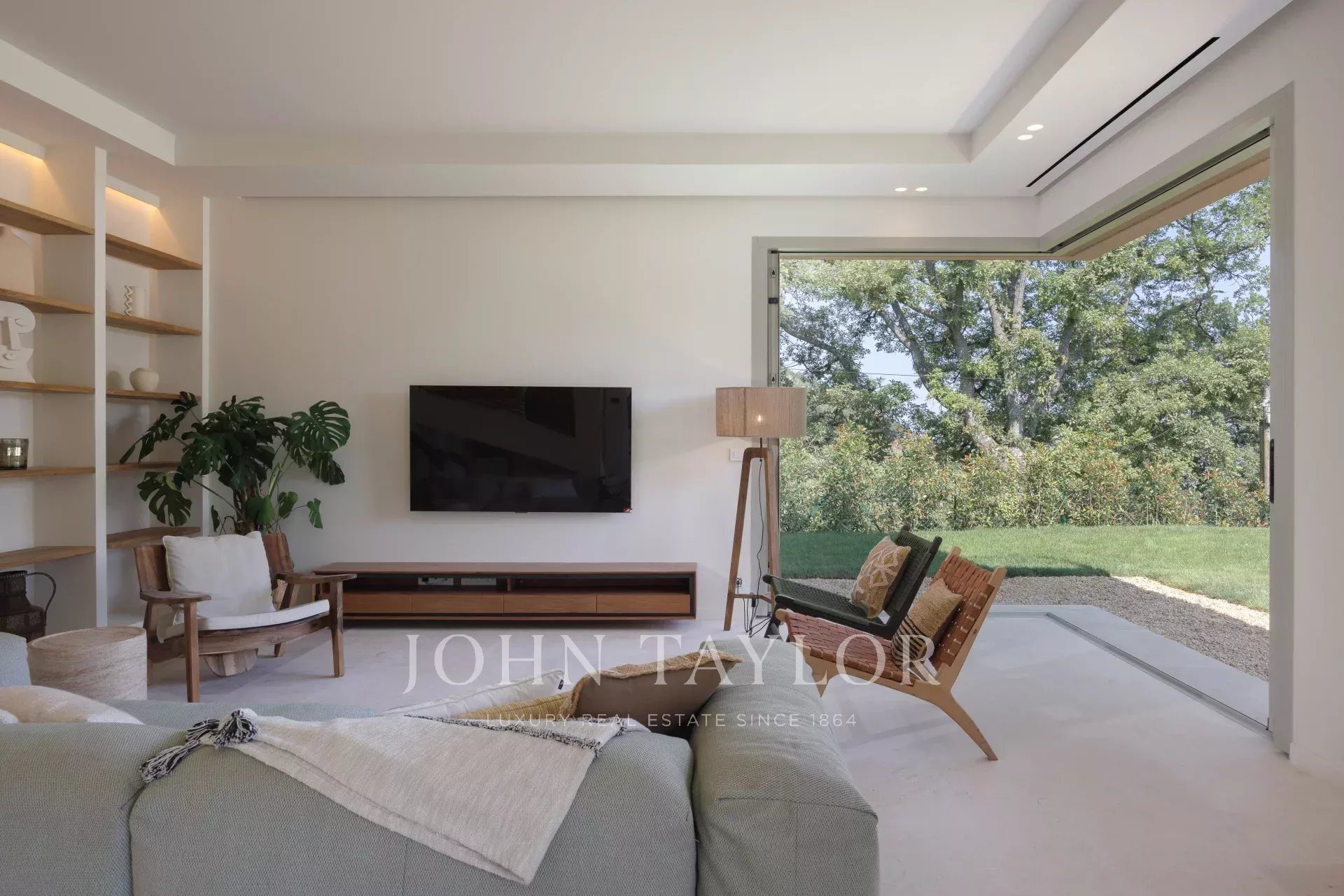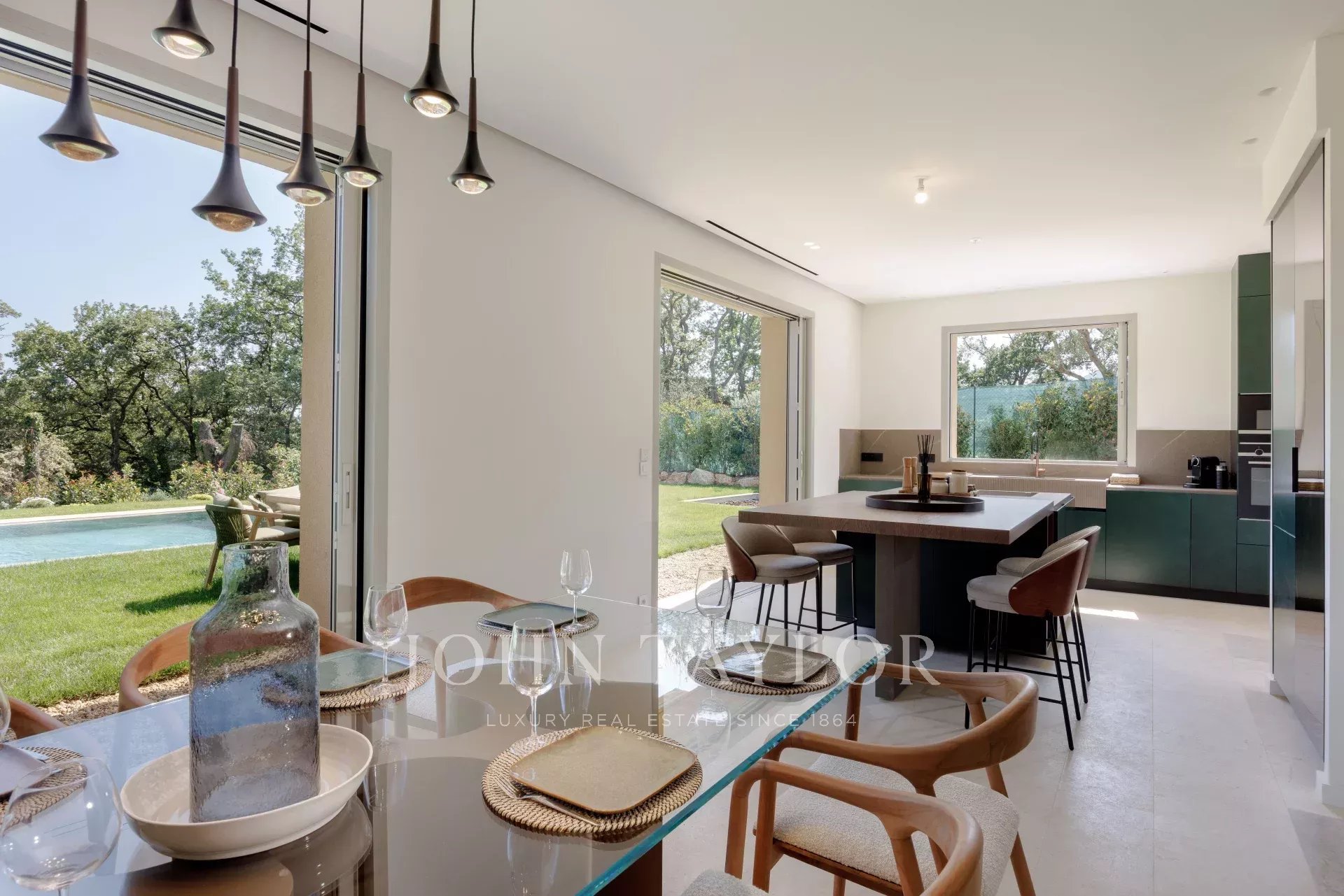 A casa é banhada em luz graças às grandes portas de vidro deslizantes, que se abrem para uma vasta sala de estar estendida por um terraço ensolarado e um jardim plano com piscina.