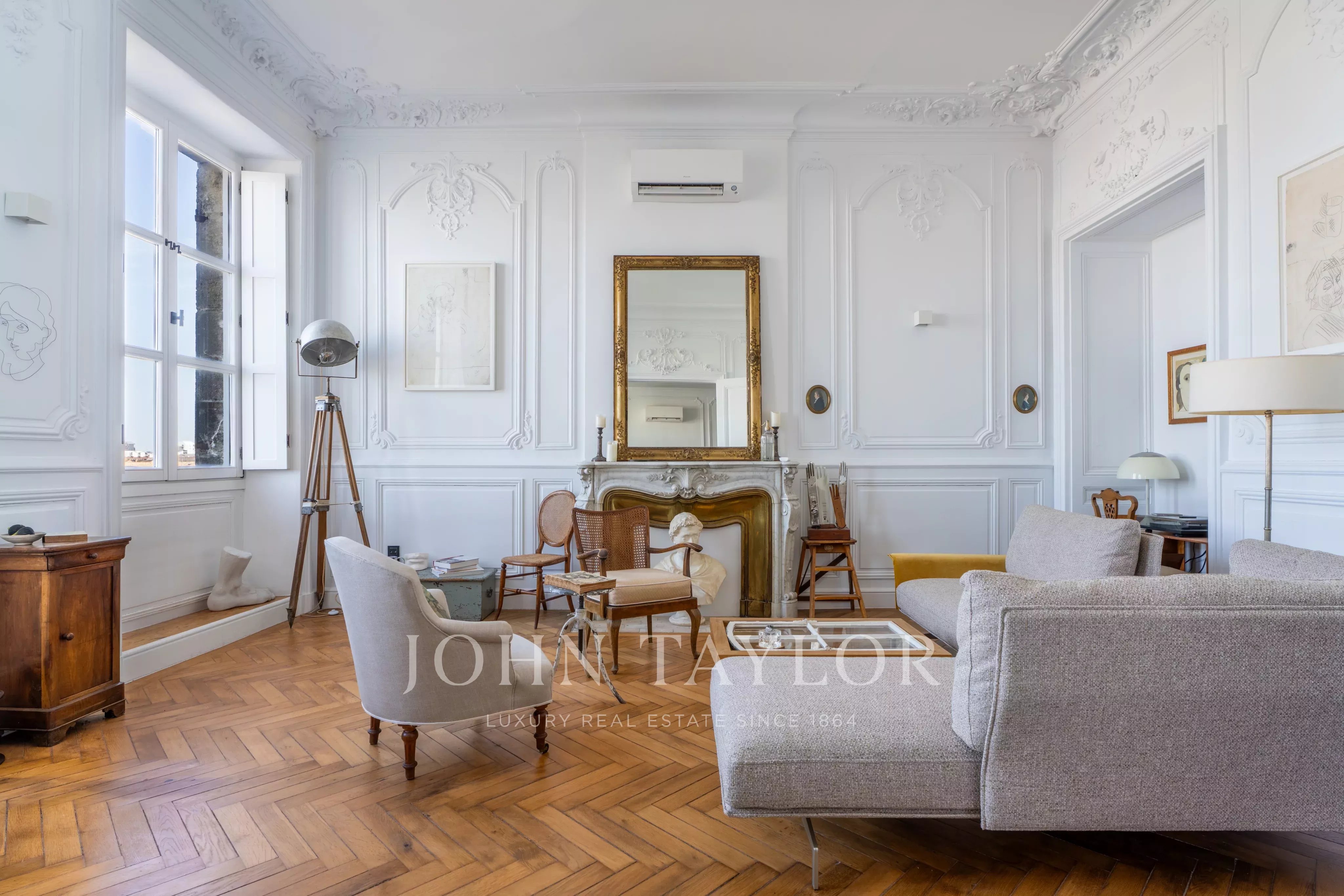 Charme do velho mundo: soalho em parquet, molduras, lareira; tectos com 3,50 m de altura.