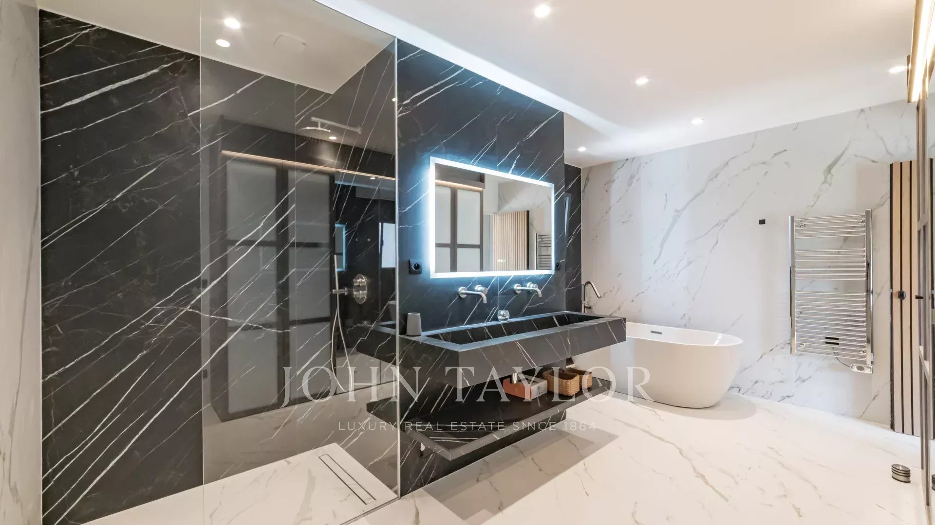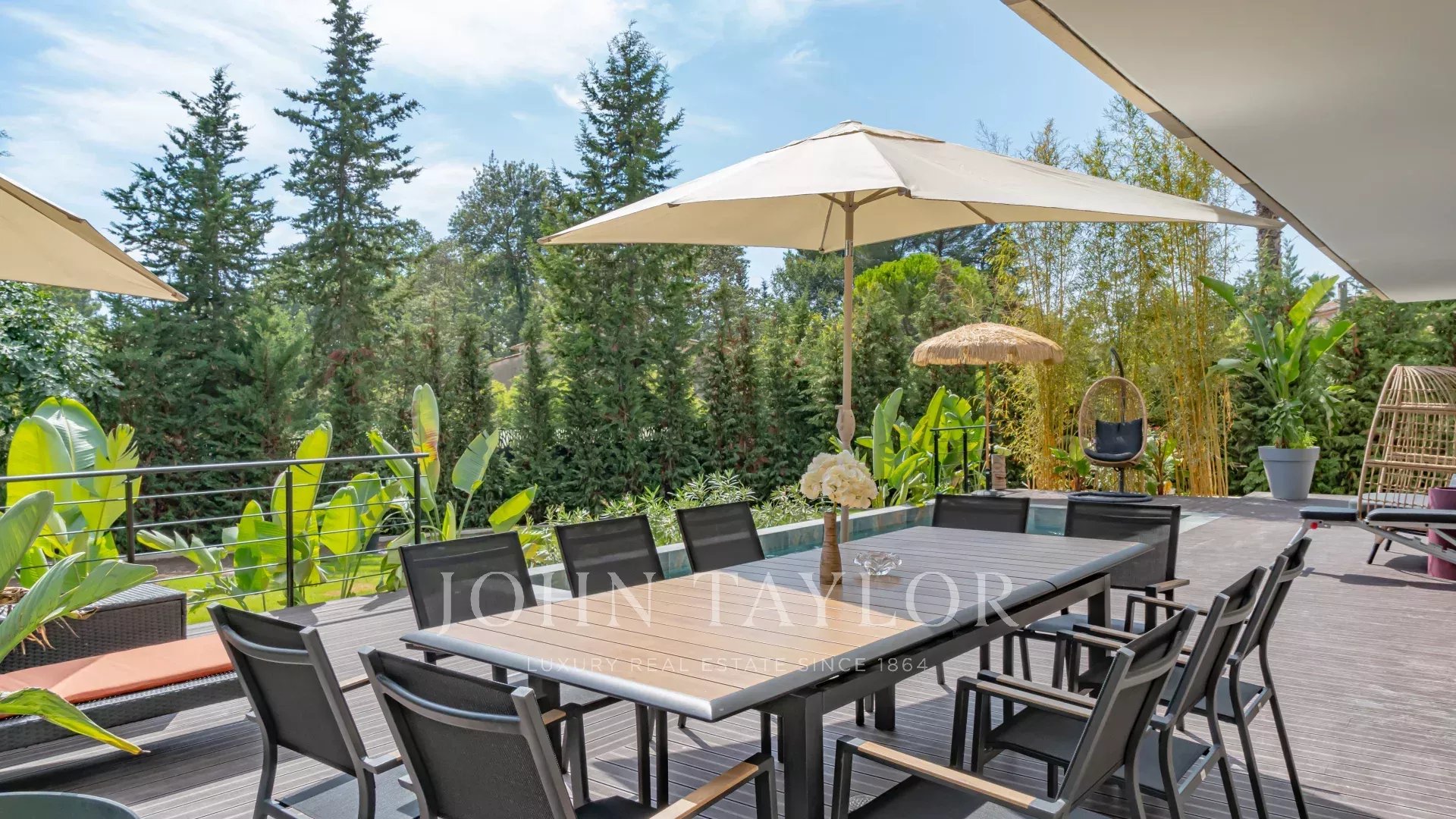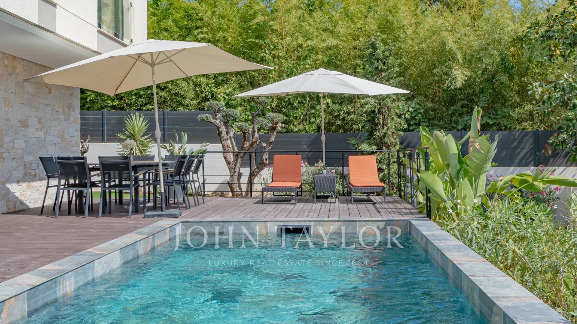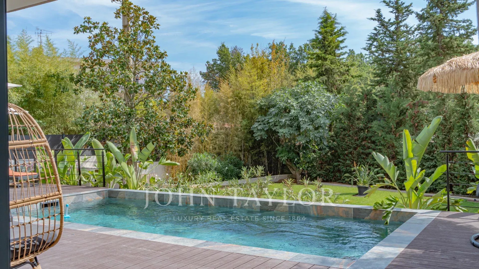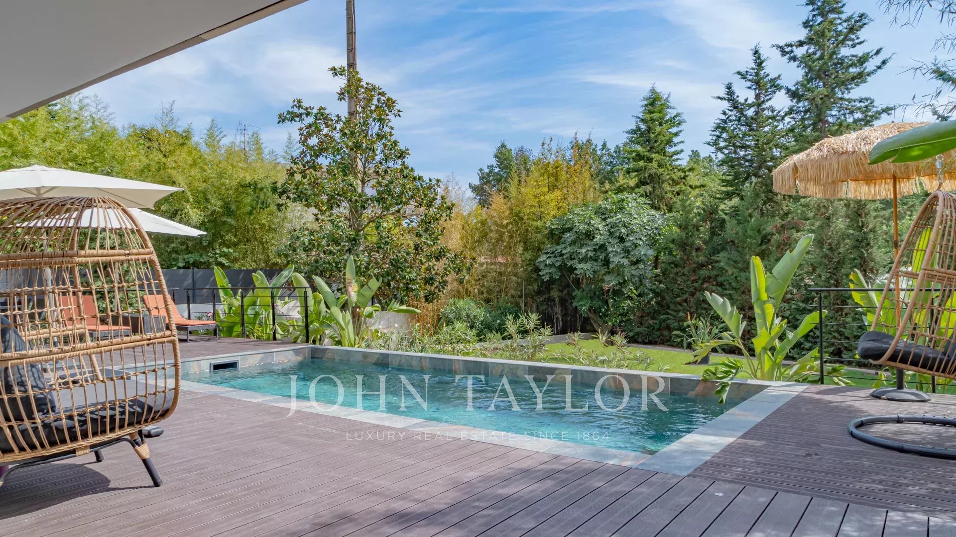 O exterior tem muito charme, com uma elegante piscina rodeada por um belo jardim paisagístico. A área está protegida por um sistema de videovigilância e equipada com um portão elétrico.