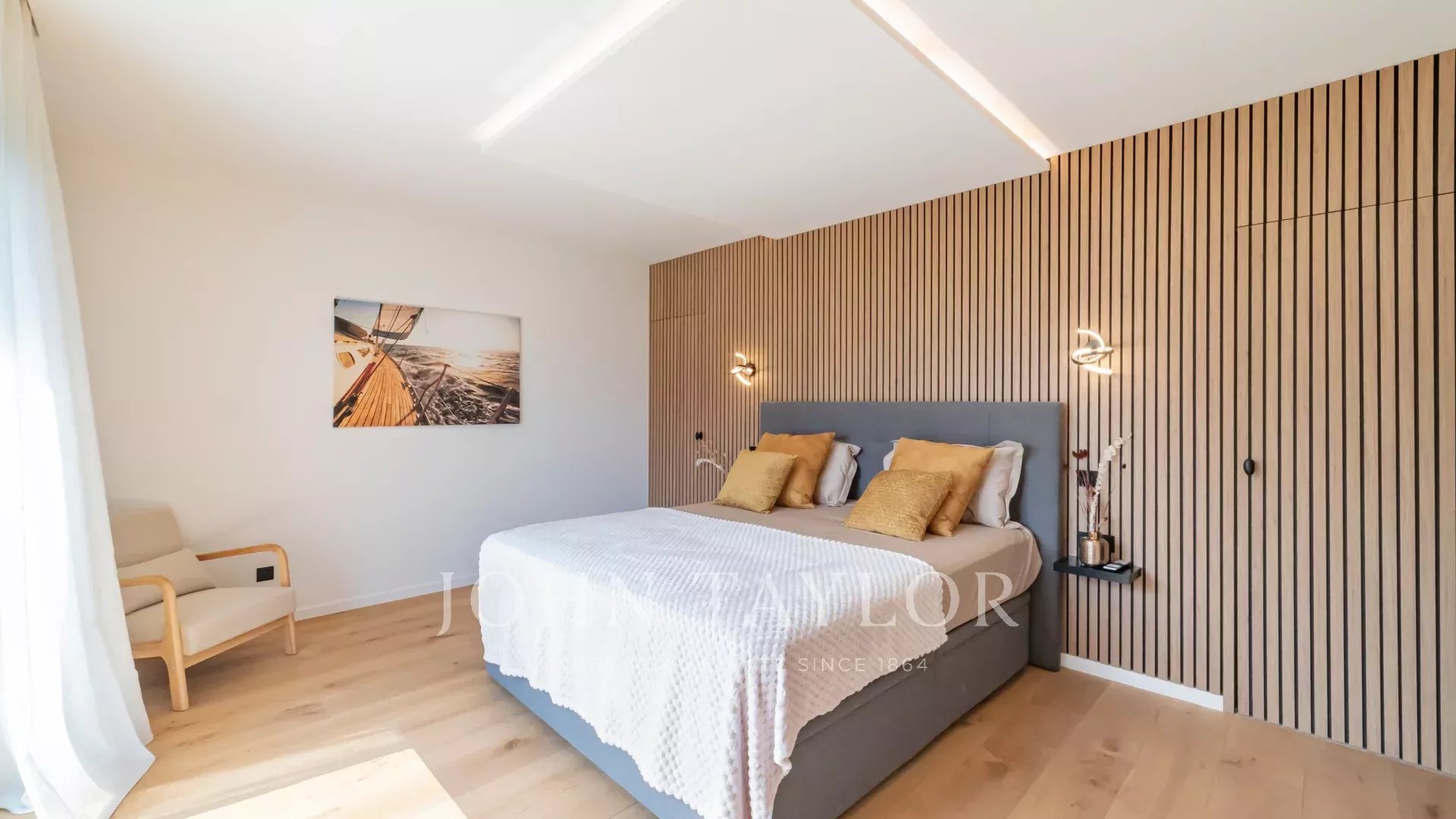 A moradia oferece 6 quartos espaçosos, todos com grandes janelas de correr que deixam entrar a luz natural.