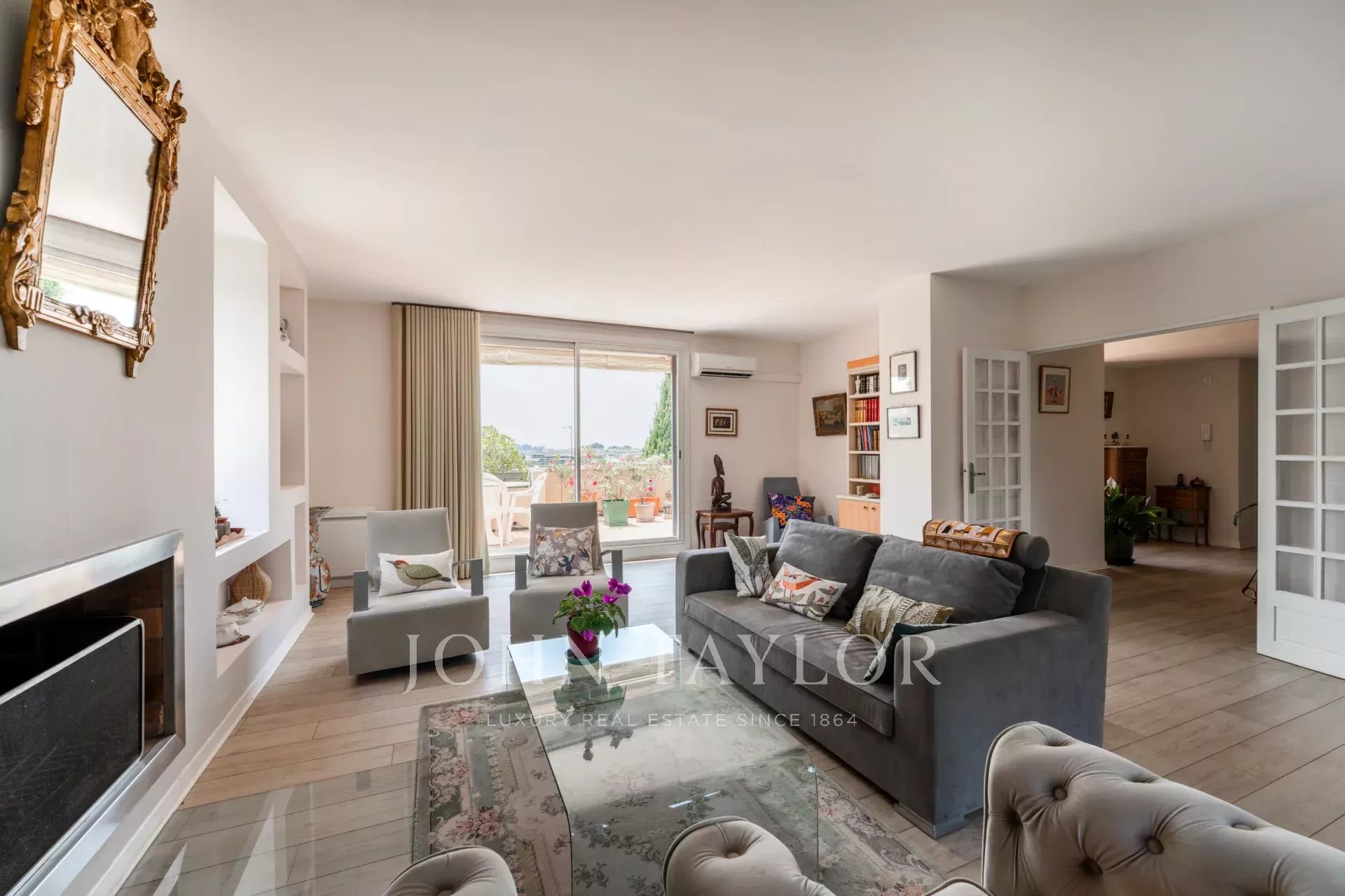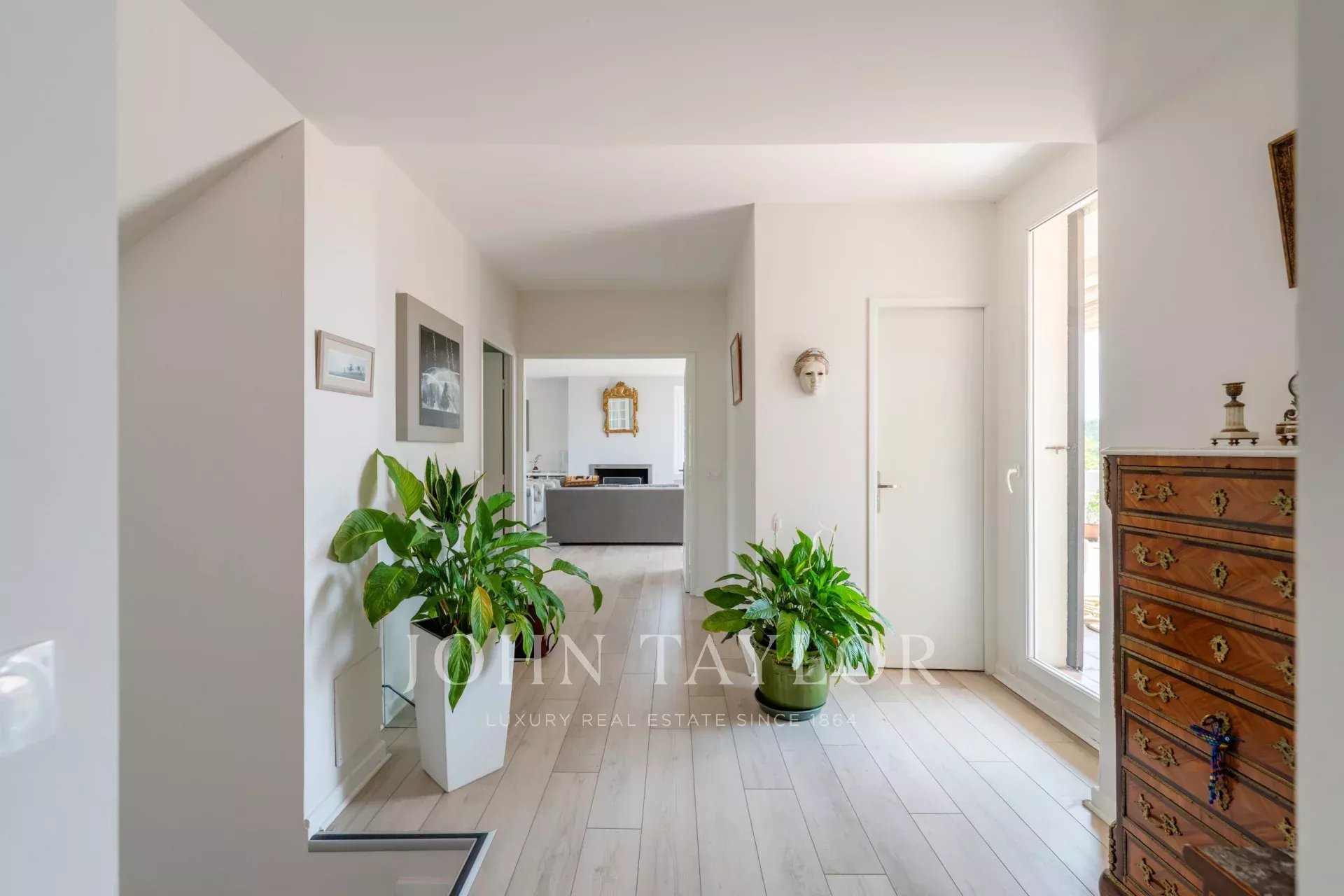 Com acesso direto por elevador, este apartamento oferece 170 m² de área de habitação, mais cerca de 50 m² de sótão transformado, o que o torna ideal para uma família ou para quem gosta de viver em plano aberto. Logo à entrada, uma vasta sala de estar abre-se para um espetacular terraço de 83,30 m², virado a sul e sem vistas, proporcionando uma luminosidade excecional.