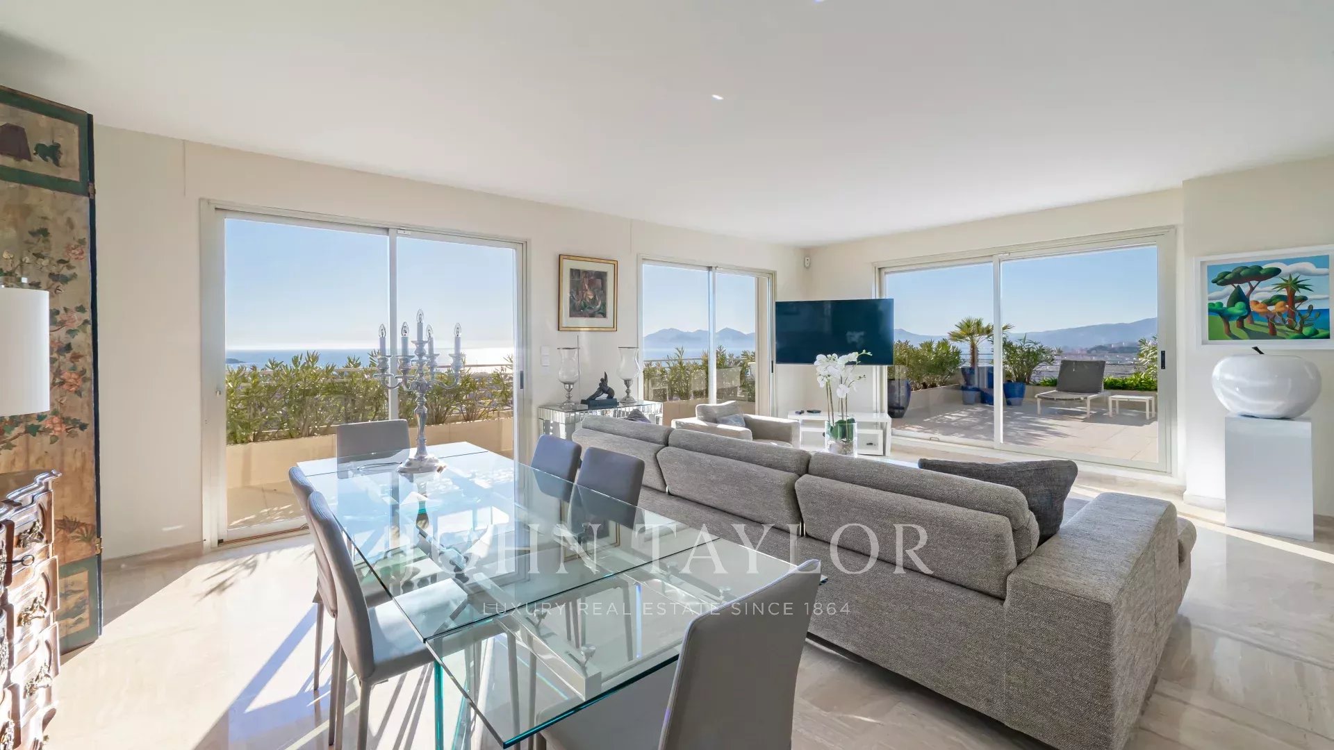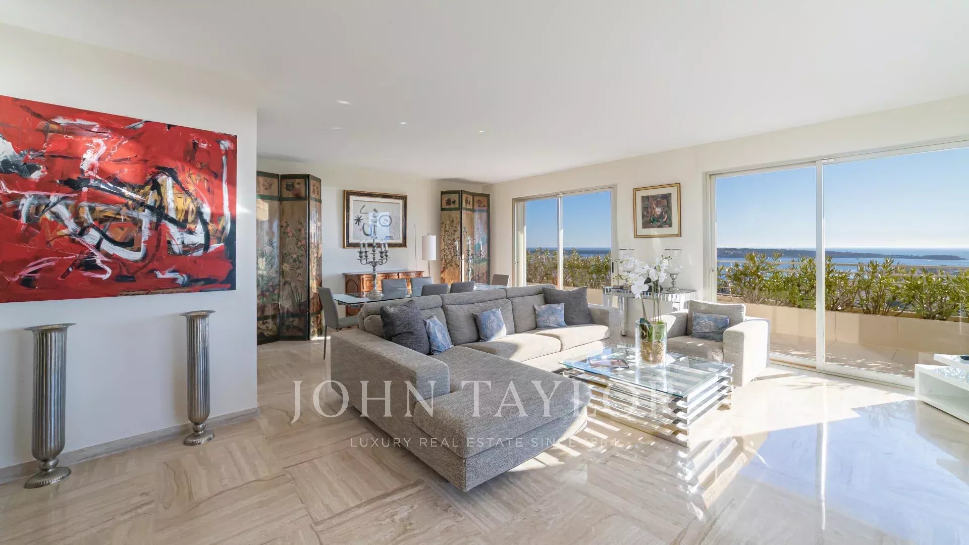 Situado numa residência de luxo na Baixa Califórnia, este magnífico apartamento de canto possui um grande terraço com vistas ininterruptas para o mar, para as Ilhas Lérins, para a Baía de Cannes e para as montanhas Esterel.