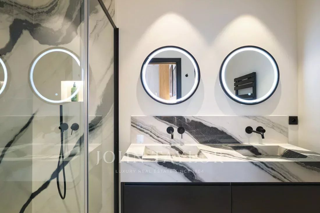 Totalmente renovado num estilo contemporâneo requintado, é composto por um hall de entrada, uma sala de estar/jantar com cozinha em plano aberto que se abre para um terraço, três quartos, cada um com a sua própria casa de banho e WC privativo, e um WC de serviço.
