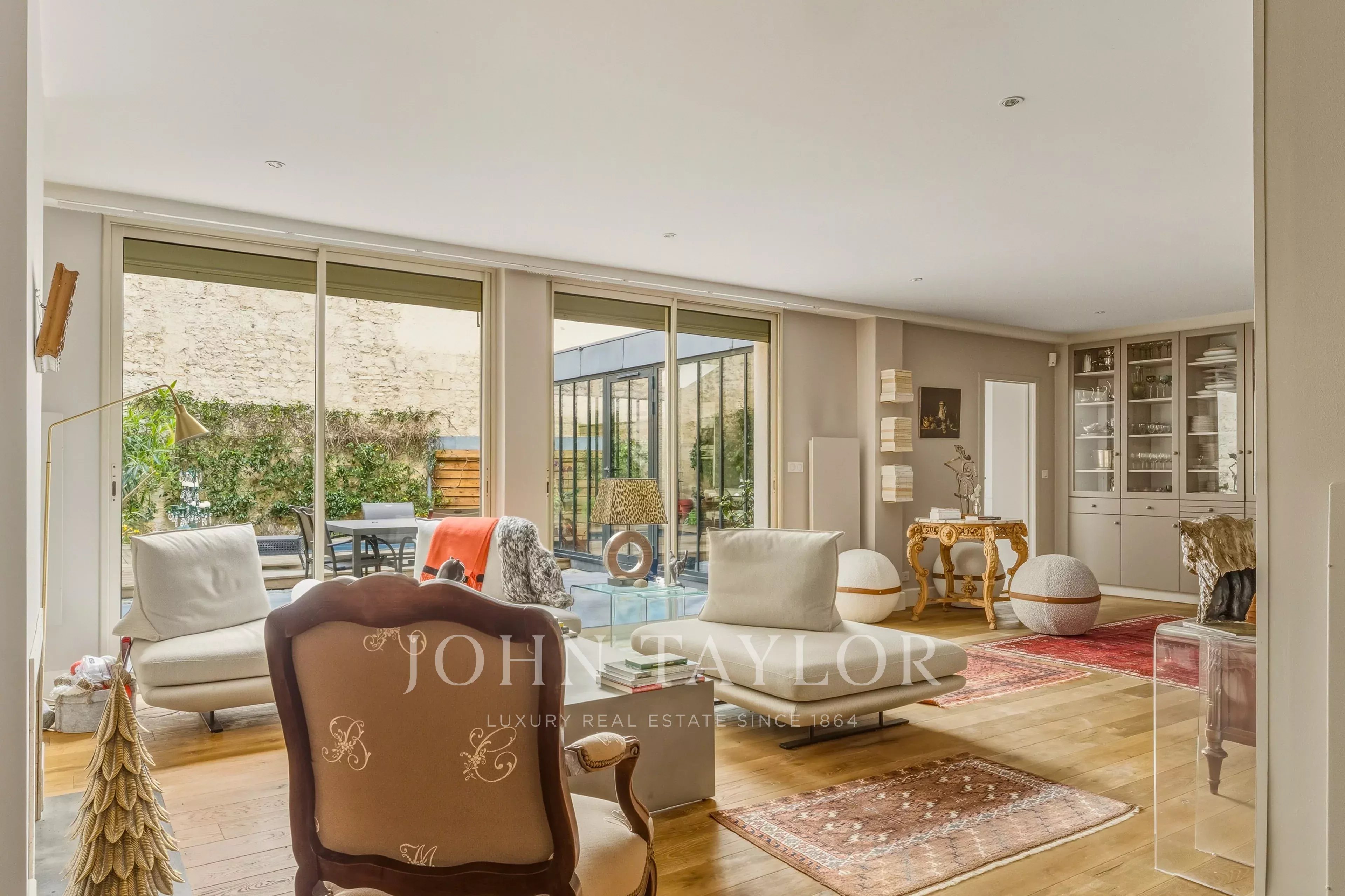 Este belo apartamento duplex de 220 m² parece uma casa totalmente renovada, com um elevador privado para cada nível e um grande jardim de 70 m² com piscina. Um endereço discreto e tranquilo num edifício com áreas comuns elegantes e perfeitamente mantidas.