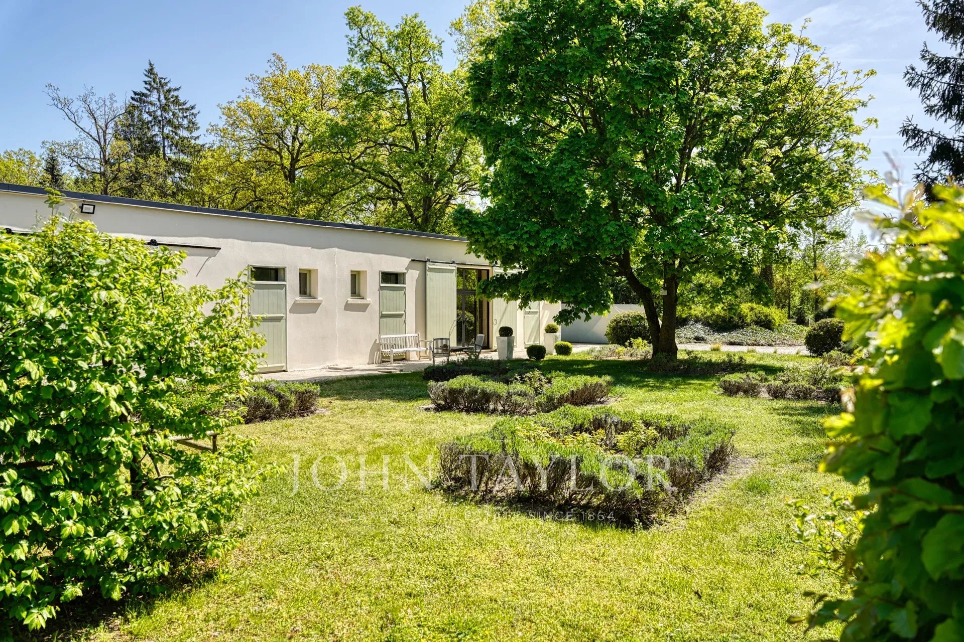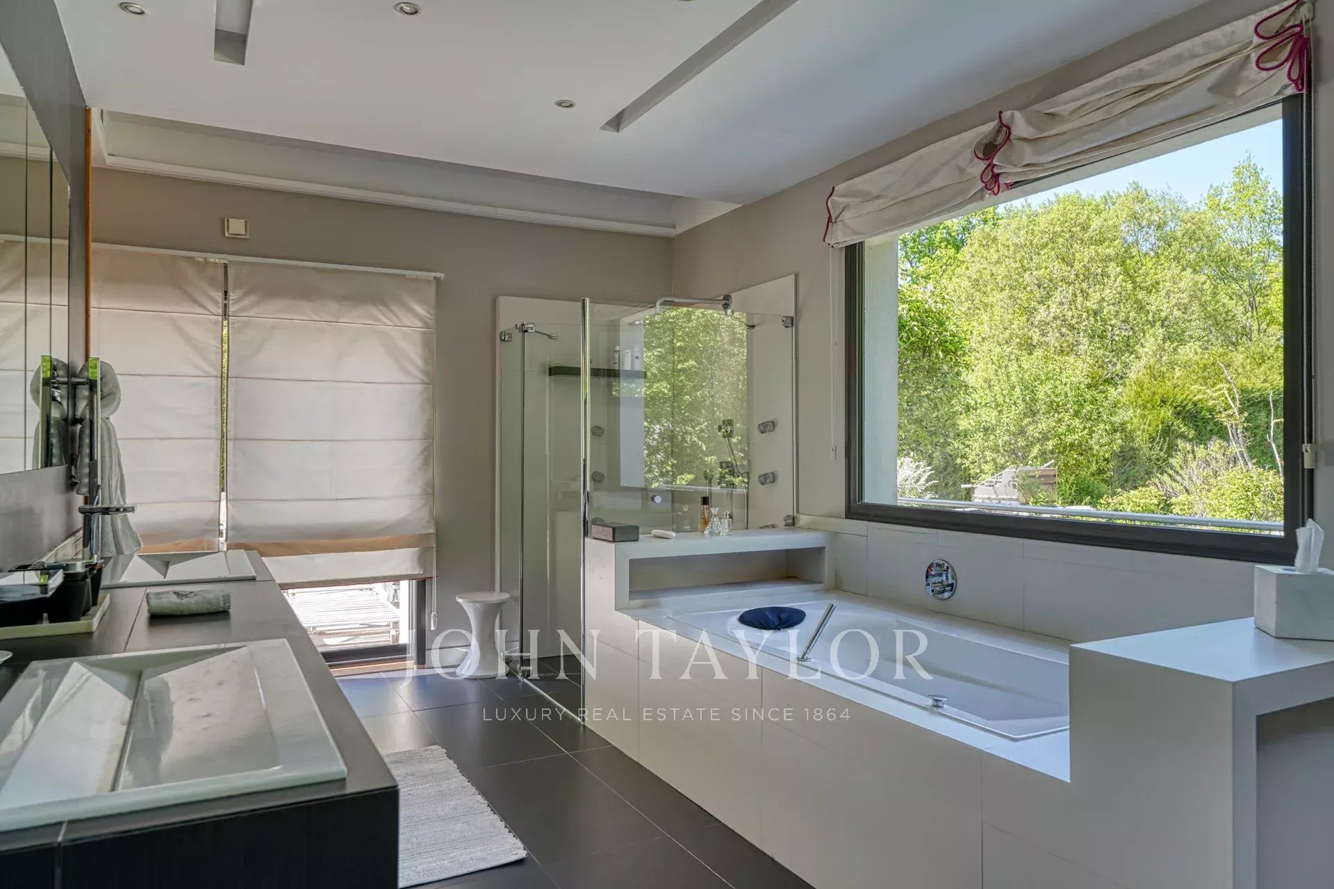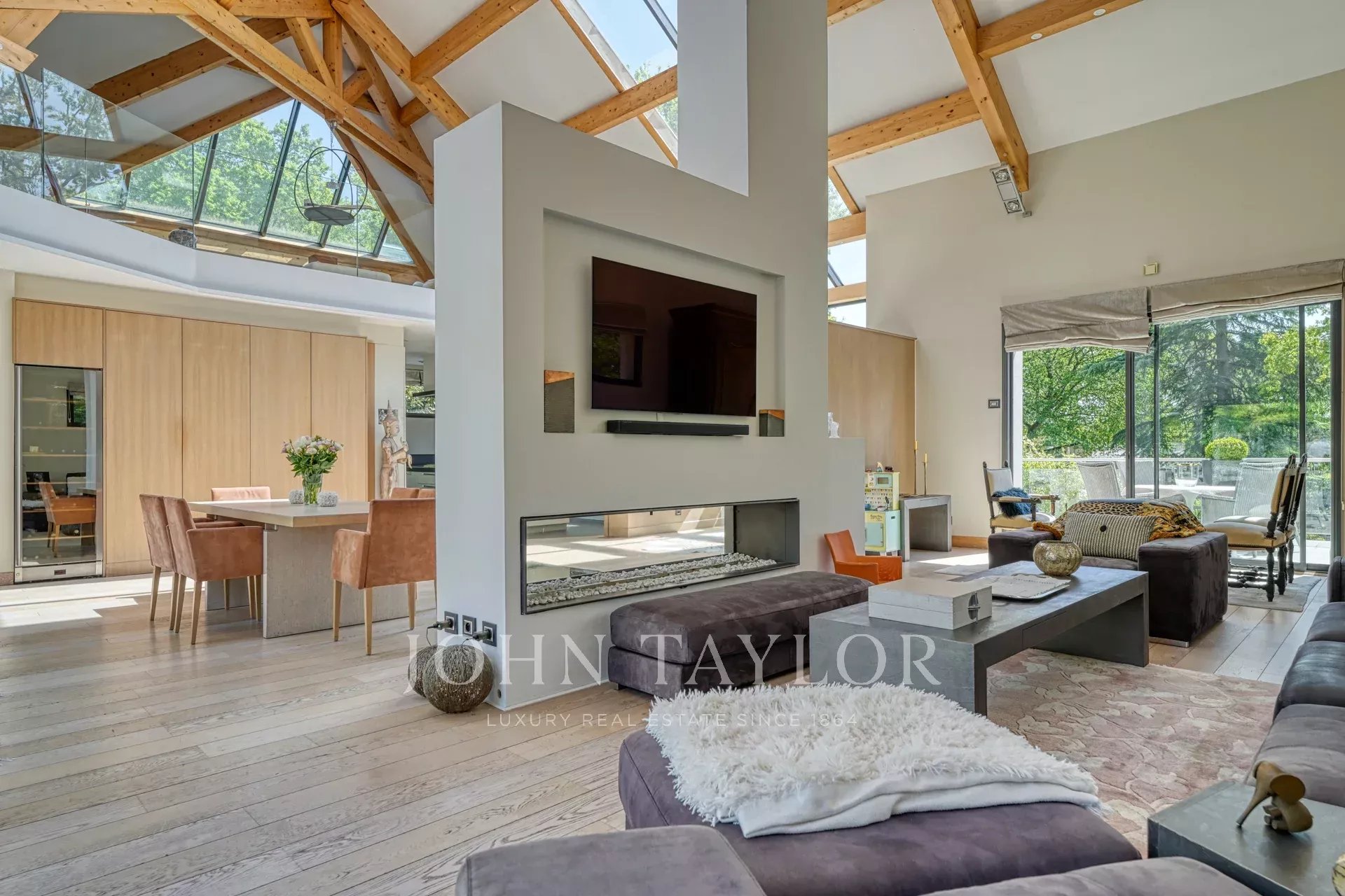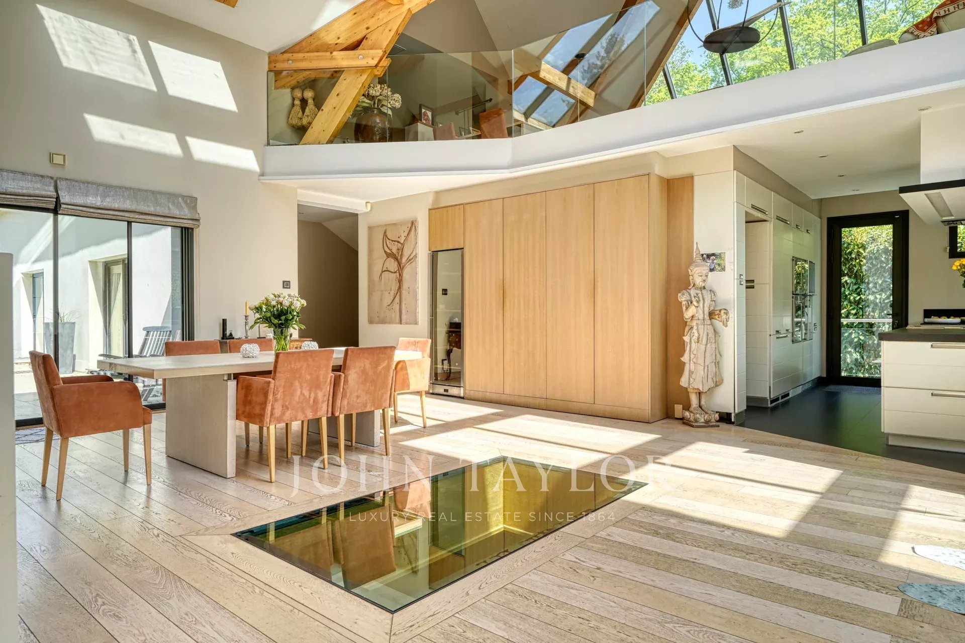 A apenas 45 minutos de Paris e 25 minutos do CDG, dentro do domínio privado e golfístico do Lys, esta casa de arquitetura do início dos anos 2000 se insere em um ambiente preservado, à sombra dos olhares.