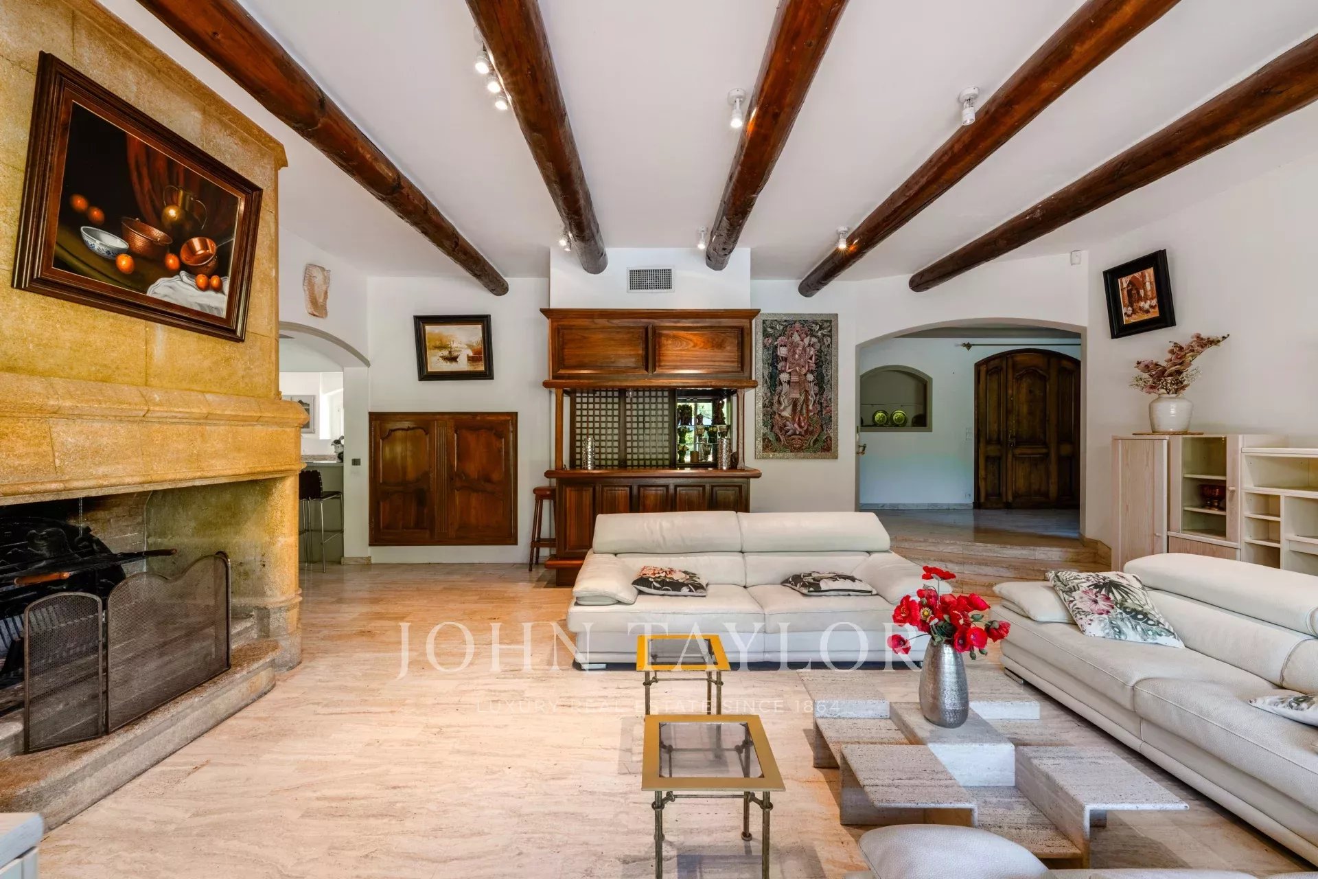 A casa está distribuída principalmente num só piso em torno de um vasto hall de entrada que conduz a uma enorme sala de estar com uma grande lareira em pedra, uma sala de jantar de convívio que se abre para um terraço abrigado, para o jardim e para a piscina.