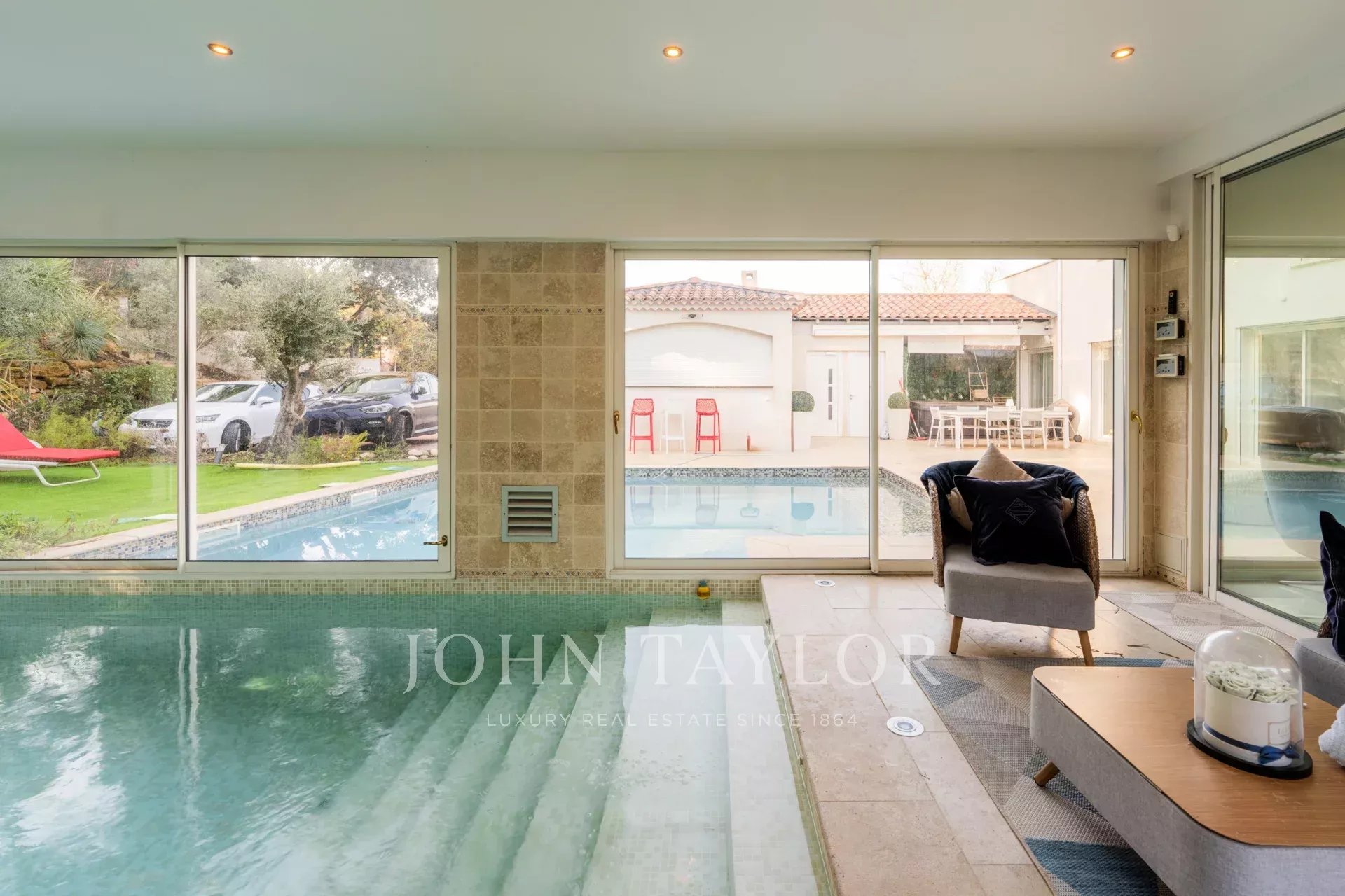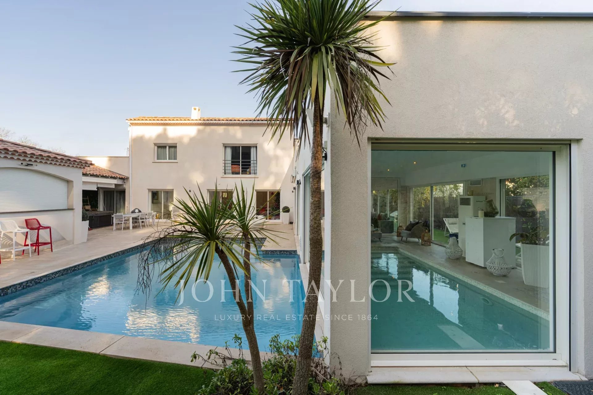Situada em 2.000 m² de terrenos ajardinados, esta propriedade oferece um estilo de vida excecional, reforçado por duas piscinas aquecidas - interior e exterior - e uma área de bem-estar com spa. A casa da piscina, totalmente equipada com uma cozinha de verão, duche e WC, e o campo de petanca, convidam-no a relaxar e a desfrutar de algum convívio.