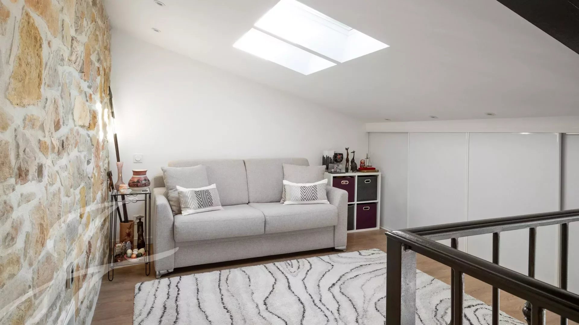 É composta por um hall de entrada, uma ampla sala de estar em estilo catedral, uma cozinha aberta para a sala de estar, um escritório no piso mezanino, dois quartos com casa de banho privativa e WC, um terceiro quarto e um WC para hóspedes.
