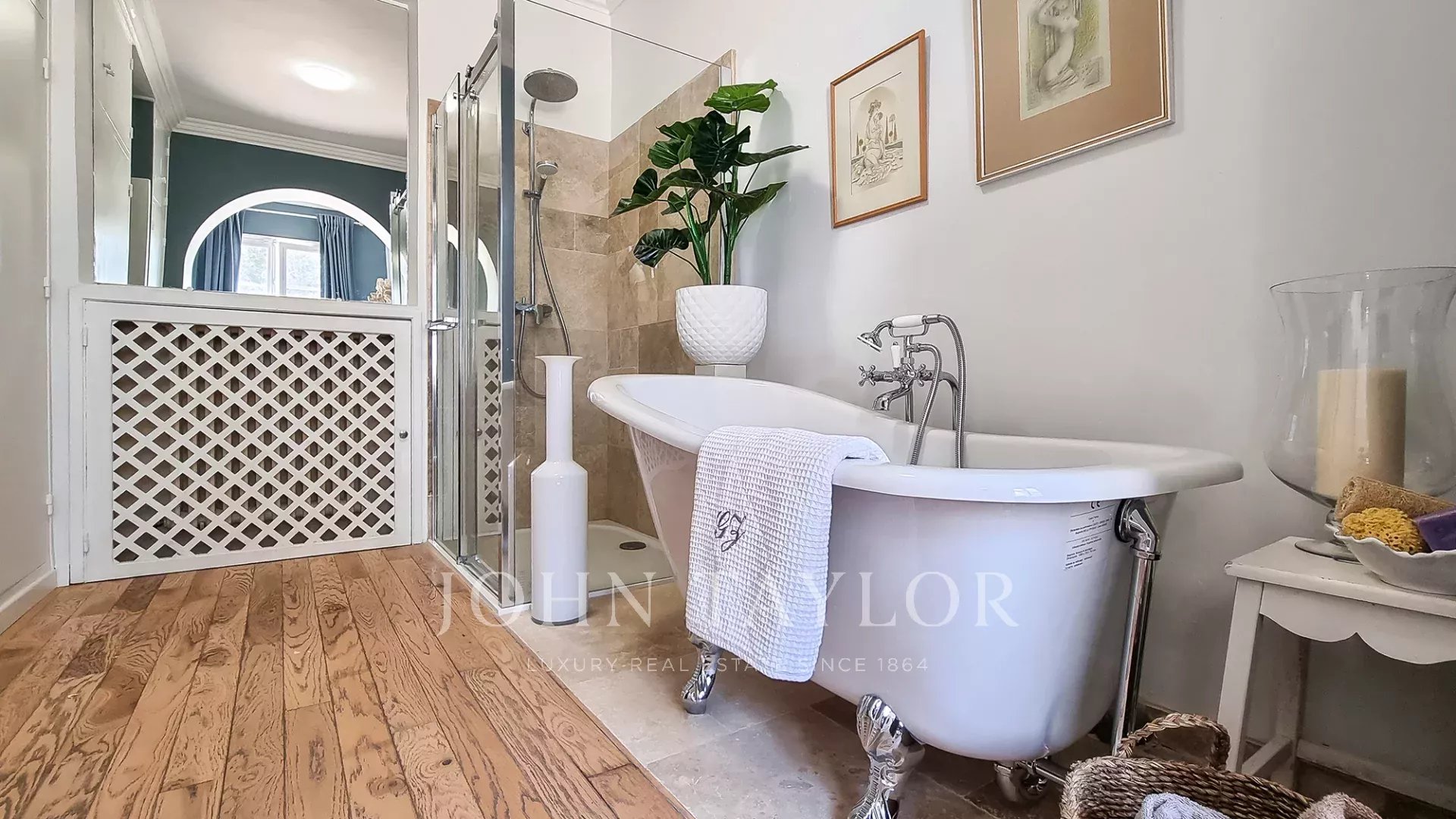 Situada numa zona residencial de Le Cannet, esta antiga residência de um conde russo está situada em cerca de 2.885 m2 de parque privado, plantado com oliveiras centenárias, árvores de fruto e um jardim florido que perfuma os arredores de uma magnífica piscina em mosaico.