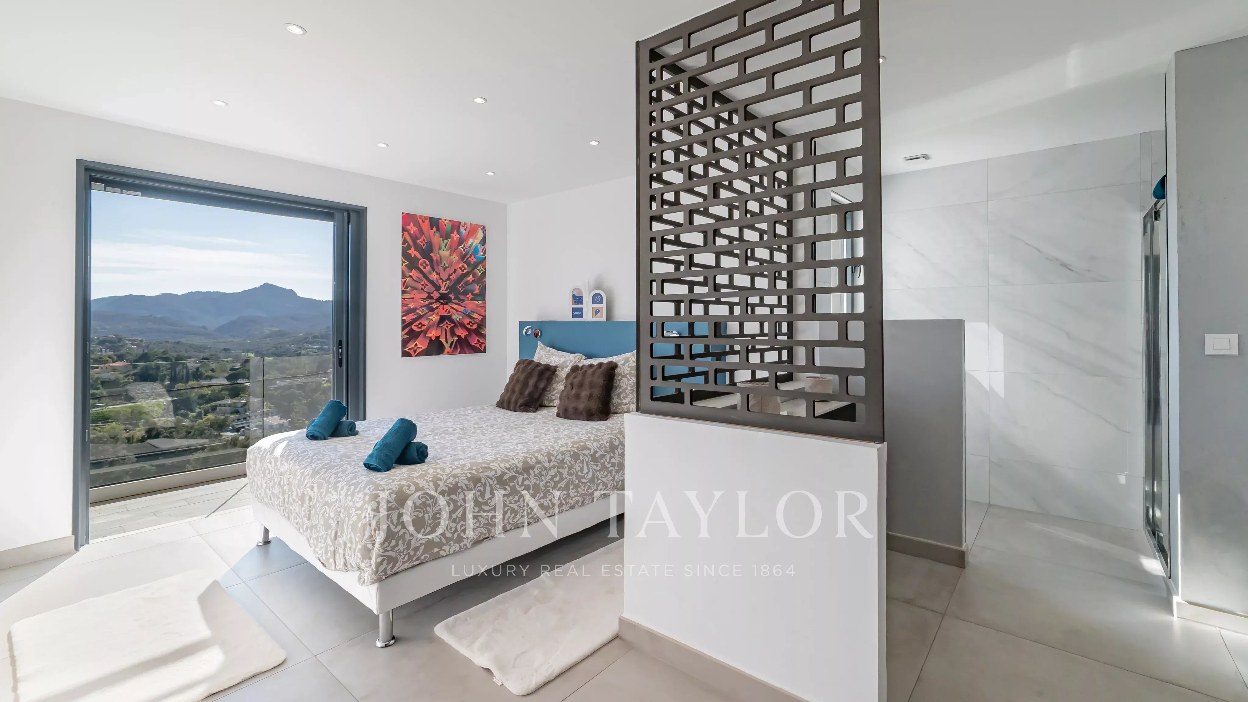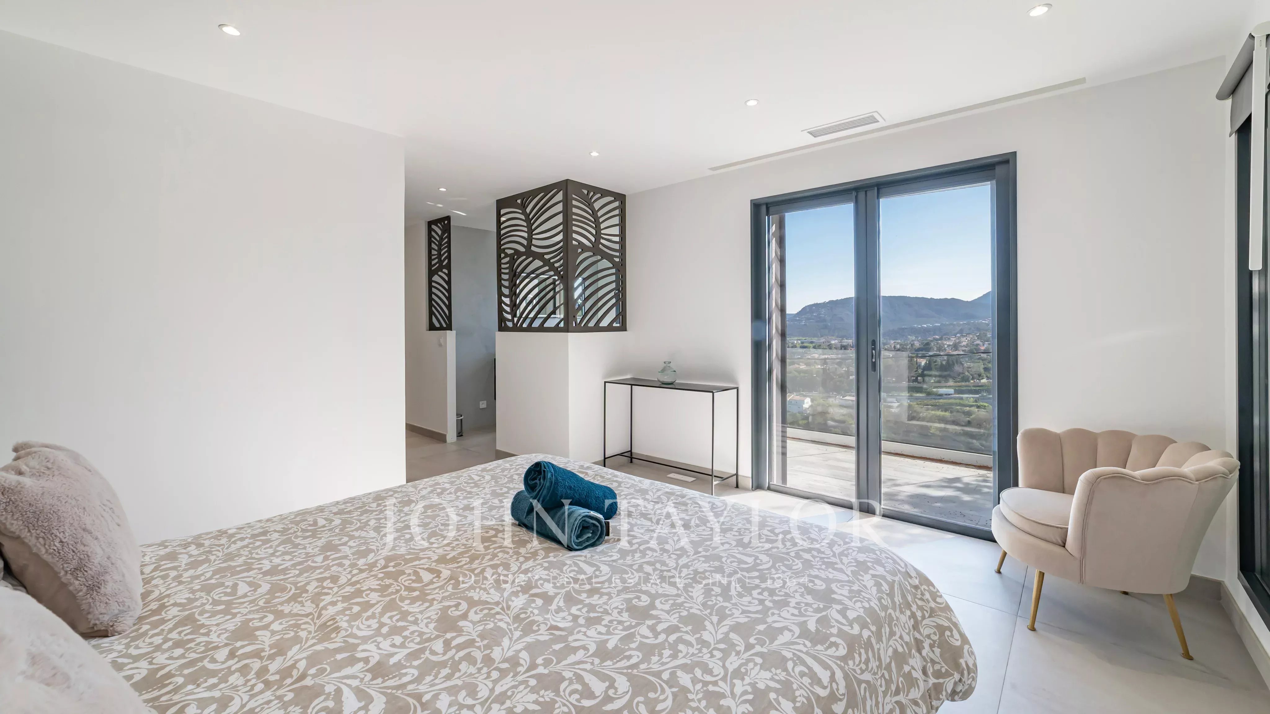 Situada apenas a 5 minutos do centro da cidade de Mandelieu, esta magnífica moradia contemporânea apresenta caraterísticas topo de gama, uma arquitetura impressionante e vistas ininterruptas sobre o mar e as ilhas Lérins.