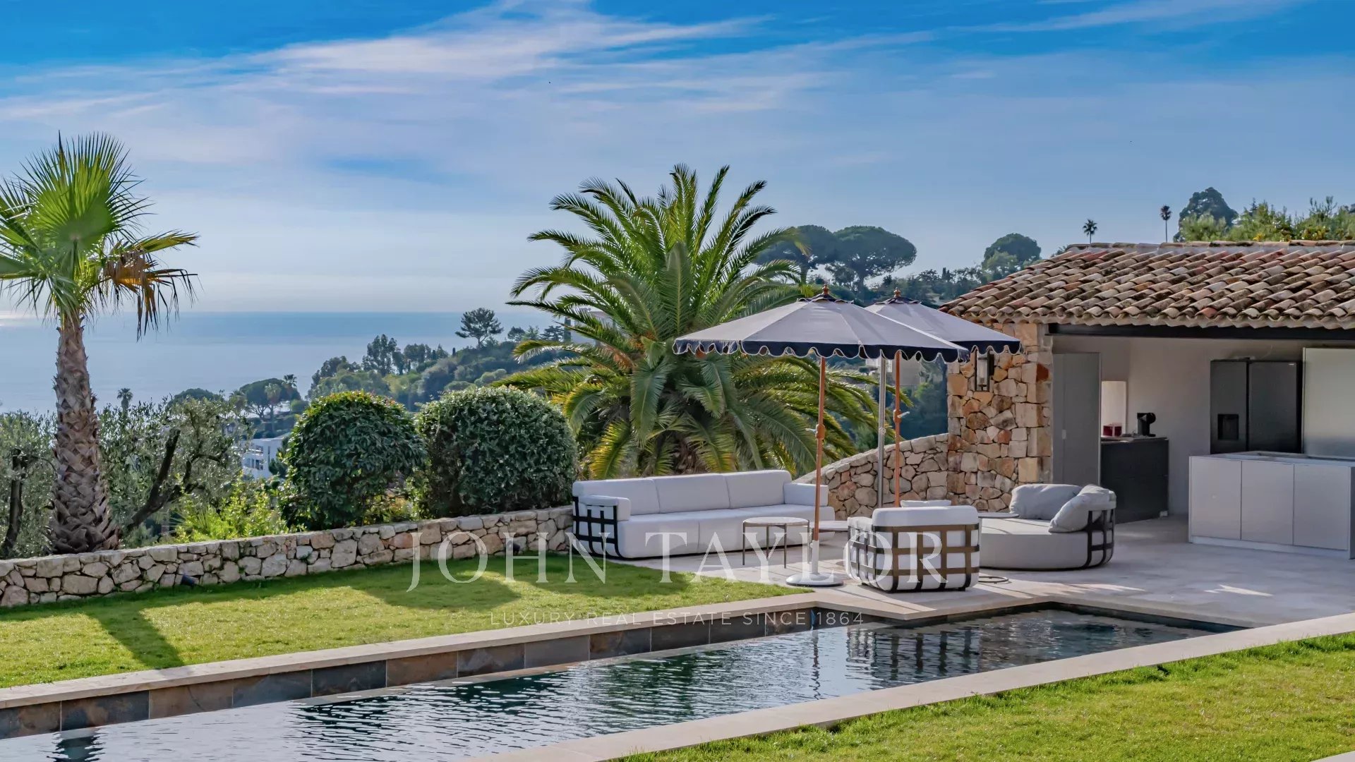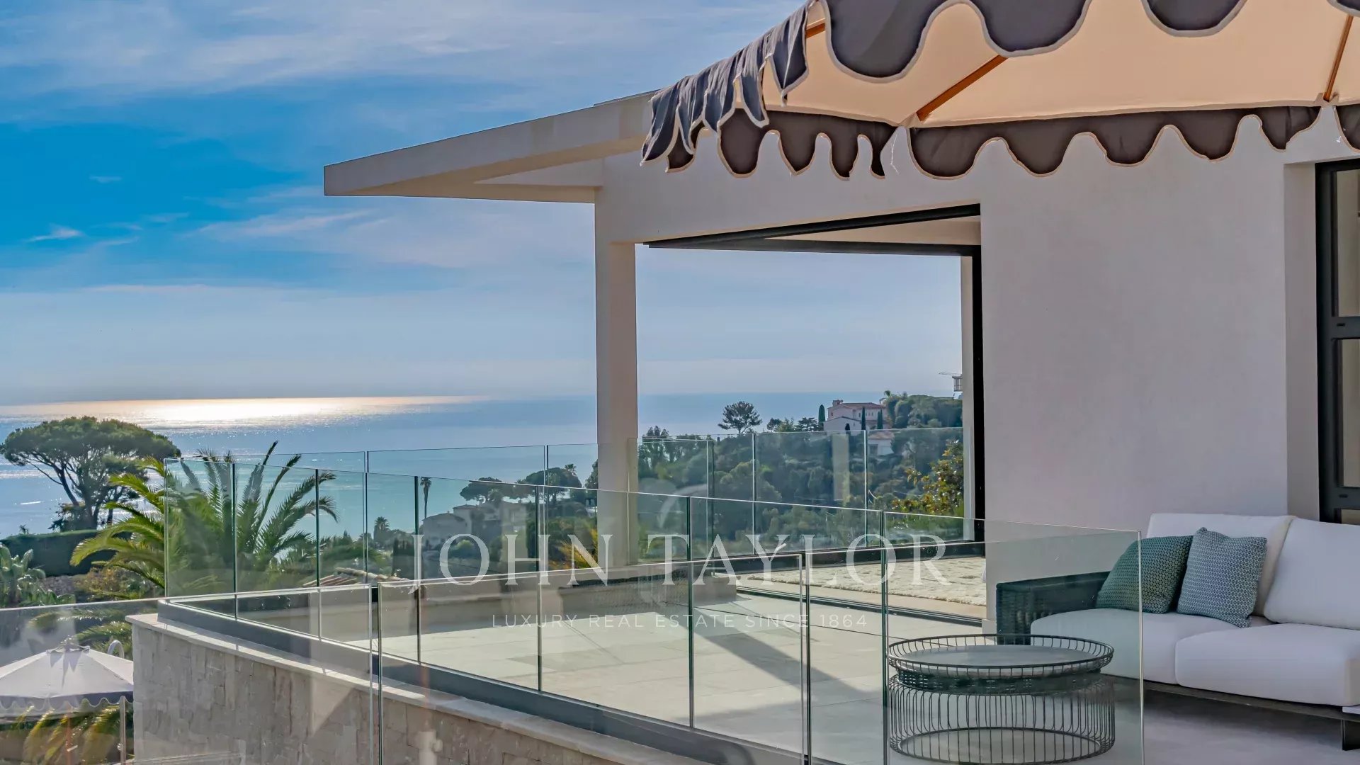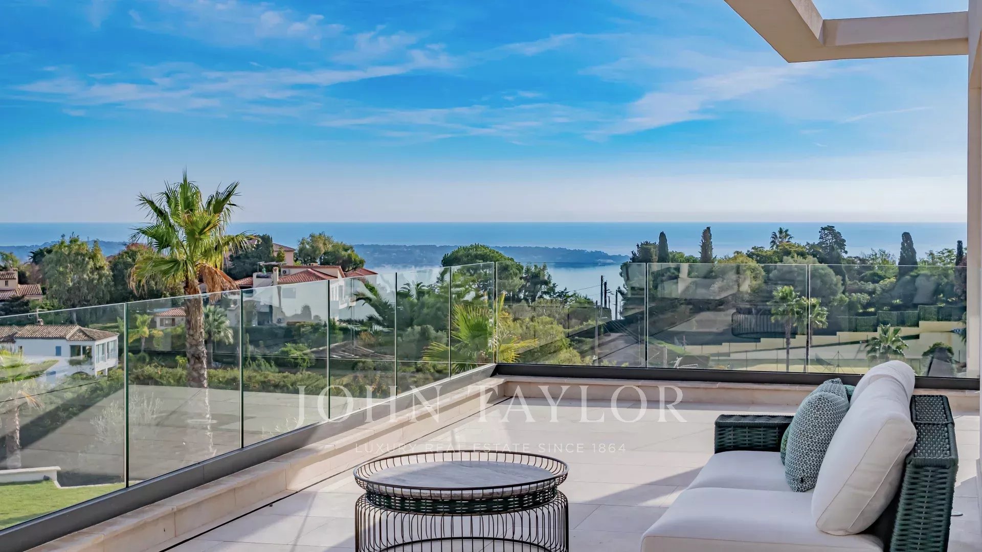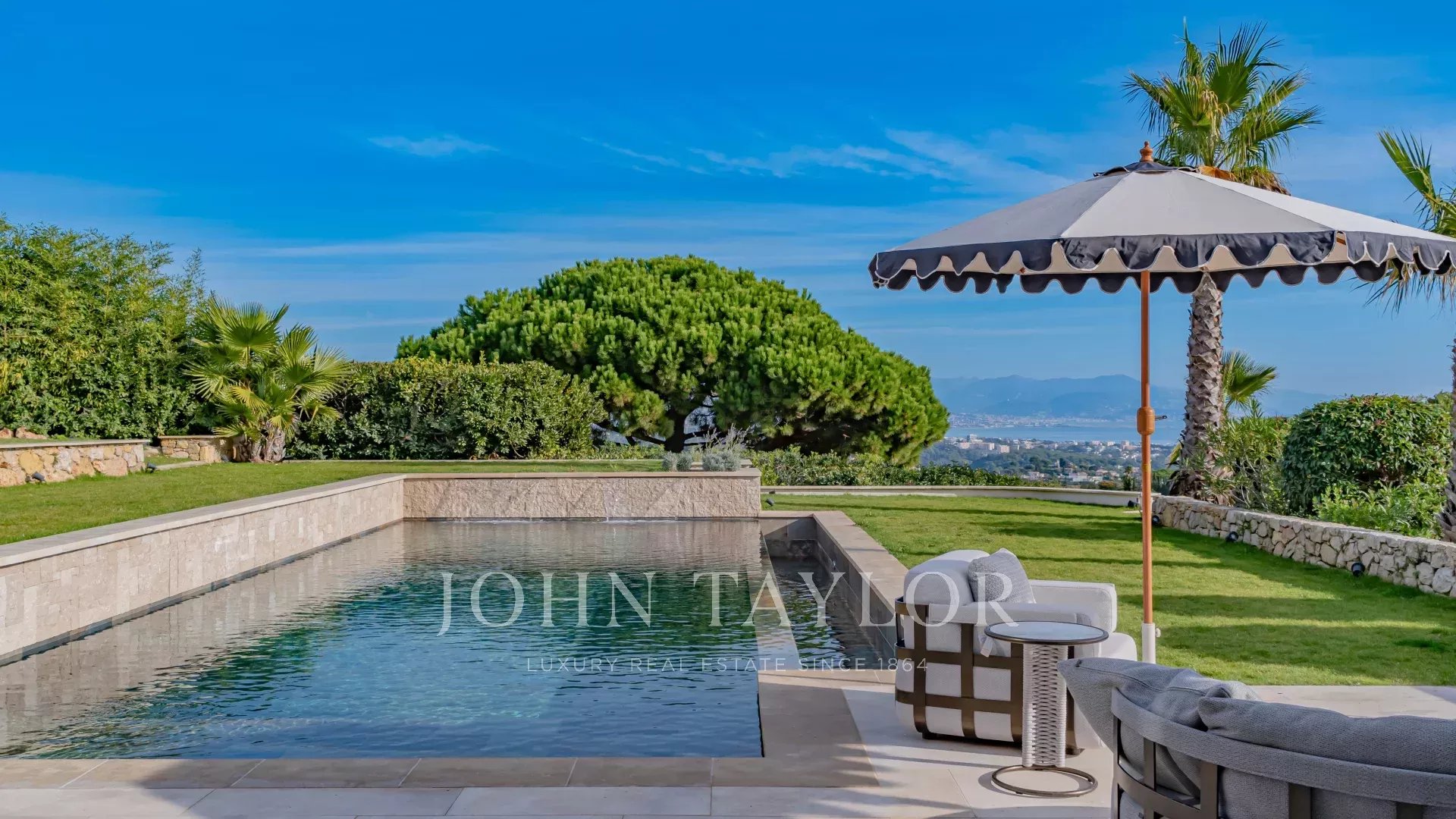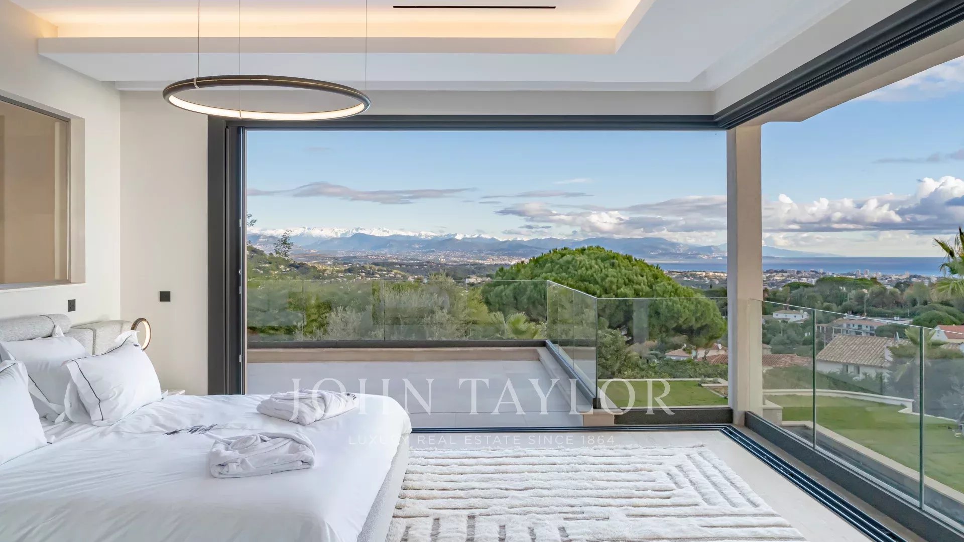 Esta moradia contemporânea com cerca de 400 m² está situada numa propriedade fechada na prestigiada e extremamente tranquila área residencial de Super Cannes. Situada numa posição dominante em 2.090 m² de terreno, a propriedade desfruta de vistas sublimes de Cap d'Antibes sobre os Alpes e as montanhas italianas.