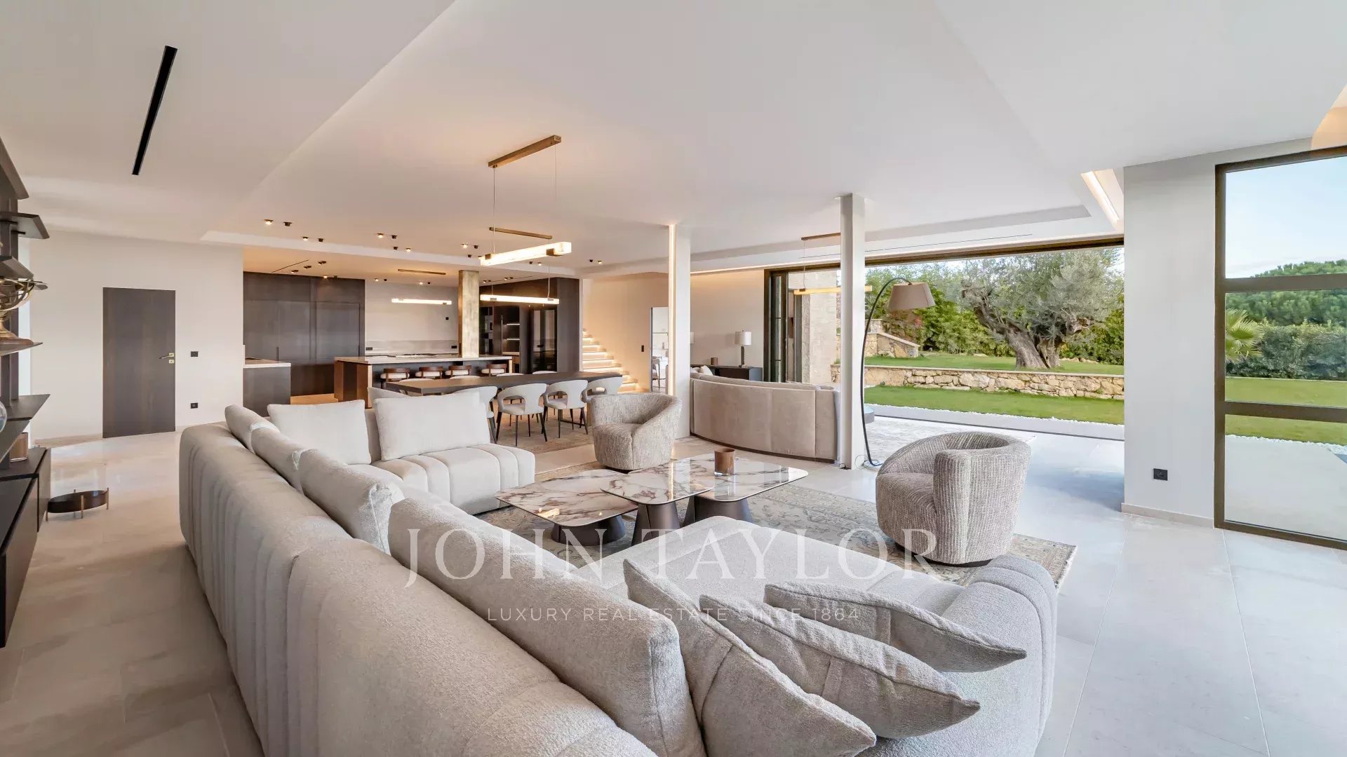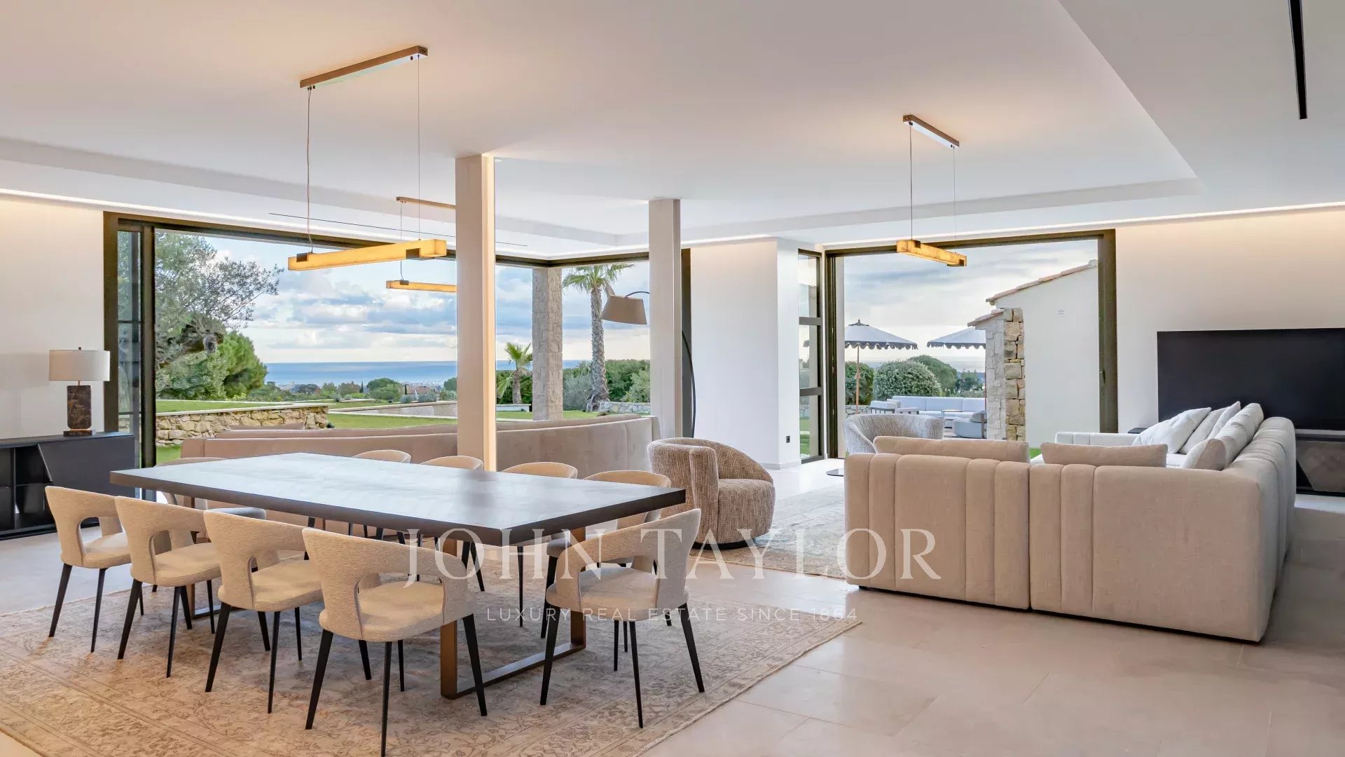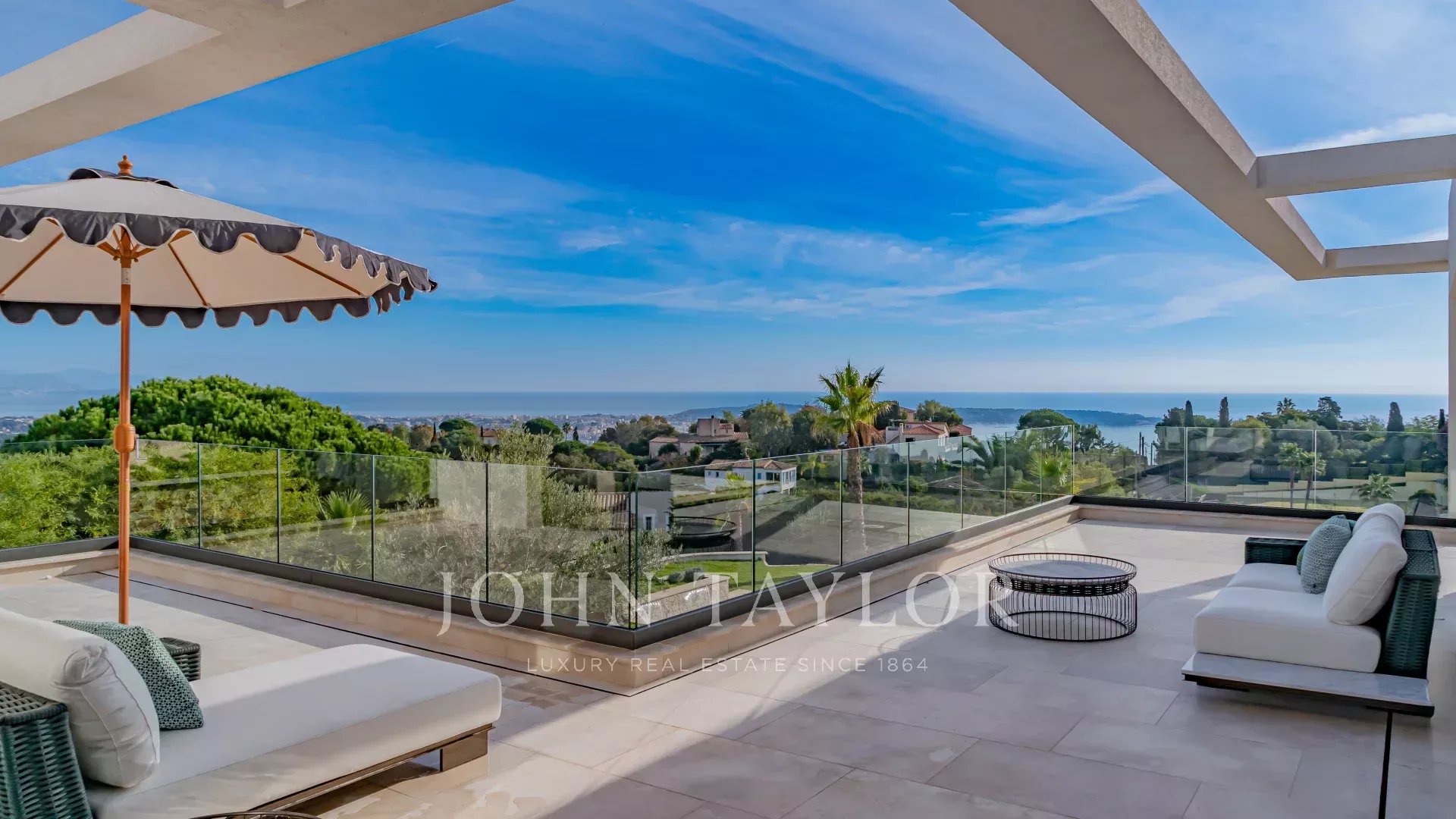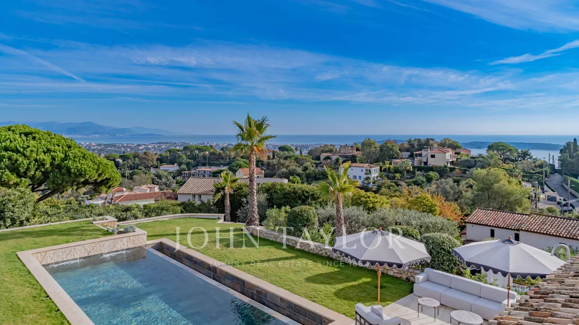 Esta moradia contemporânea com cerca de 400 m² está situada numa propriedade fechada na prestigiada e extremamente tranquila área residencial de Super Cannes. Situada numa posição dominante em 2.090 m² de terreno, a propriedade desfruta de vistas sublimes de Cap d'Antibes sobre os Alpes e as montanhas italianas.